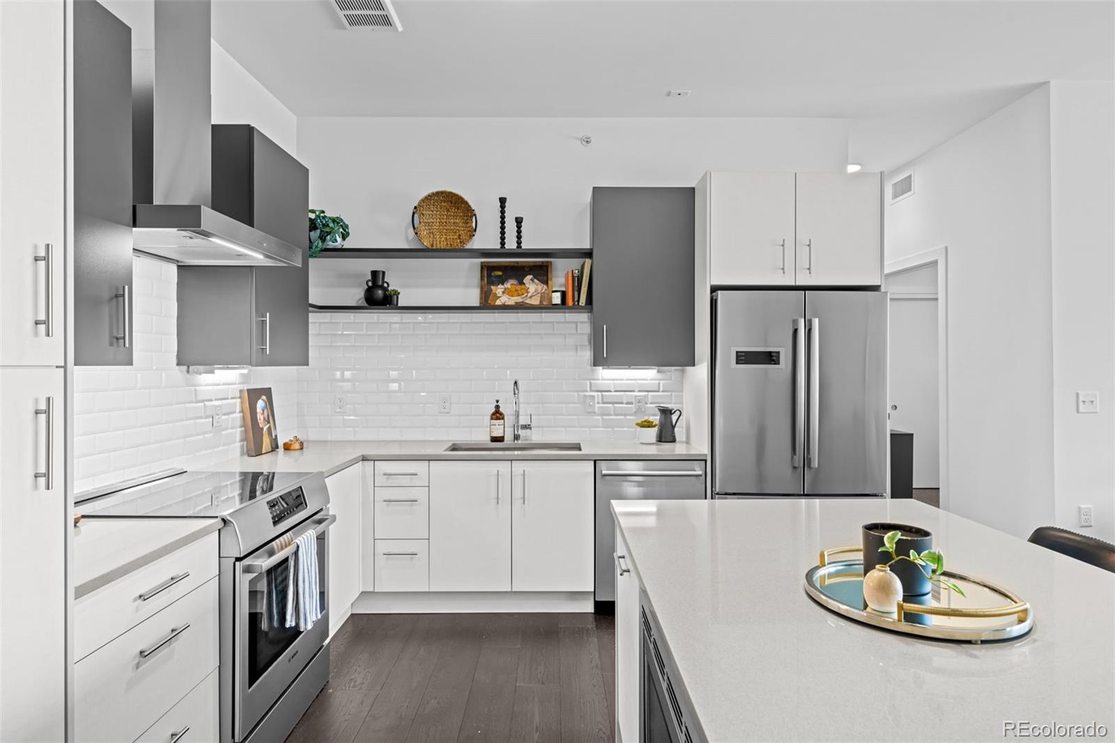 Welcome to S*Park, where beauty meets sustainability! This penthouse level corner unit offers two spacious bedrooms, two bathrooms, and an open floor plan that is great for entertaining. Abundant natural light fills the unit and the large patio slider offers fresh air and indoor/outdoor enjoyment. The meticulously maintained interior includes hardwood flooring, quartz countertops, stainless steel appliances, and other high-end finishes. The kitchen offers sleek cabinetry and a center island with seating. Retreat to the primary suite with a walk-in closet, spa-like bath featuring a walk-in shower, and double vanity. A secondary bedroom and bathroom afford privacy to visiting guests. There is a storage unit for all of your Colorado toys and a secure parking space which allows for the perfect lock and leave situation. Enjoy views of the private park area! Close to major roadways, Downtown, and all of your RiNo favorites including Uchi, Barcelona, Hearth, Work and Class, Crema, Cart-Driver, and many more! Short-term rentals allowed!