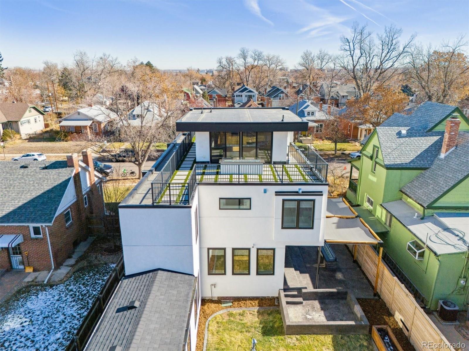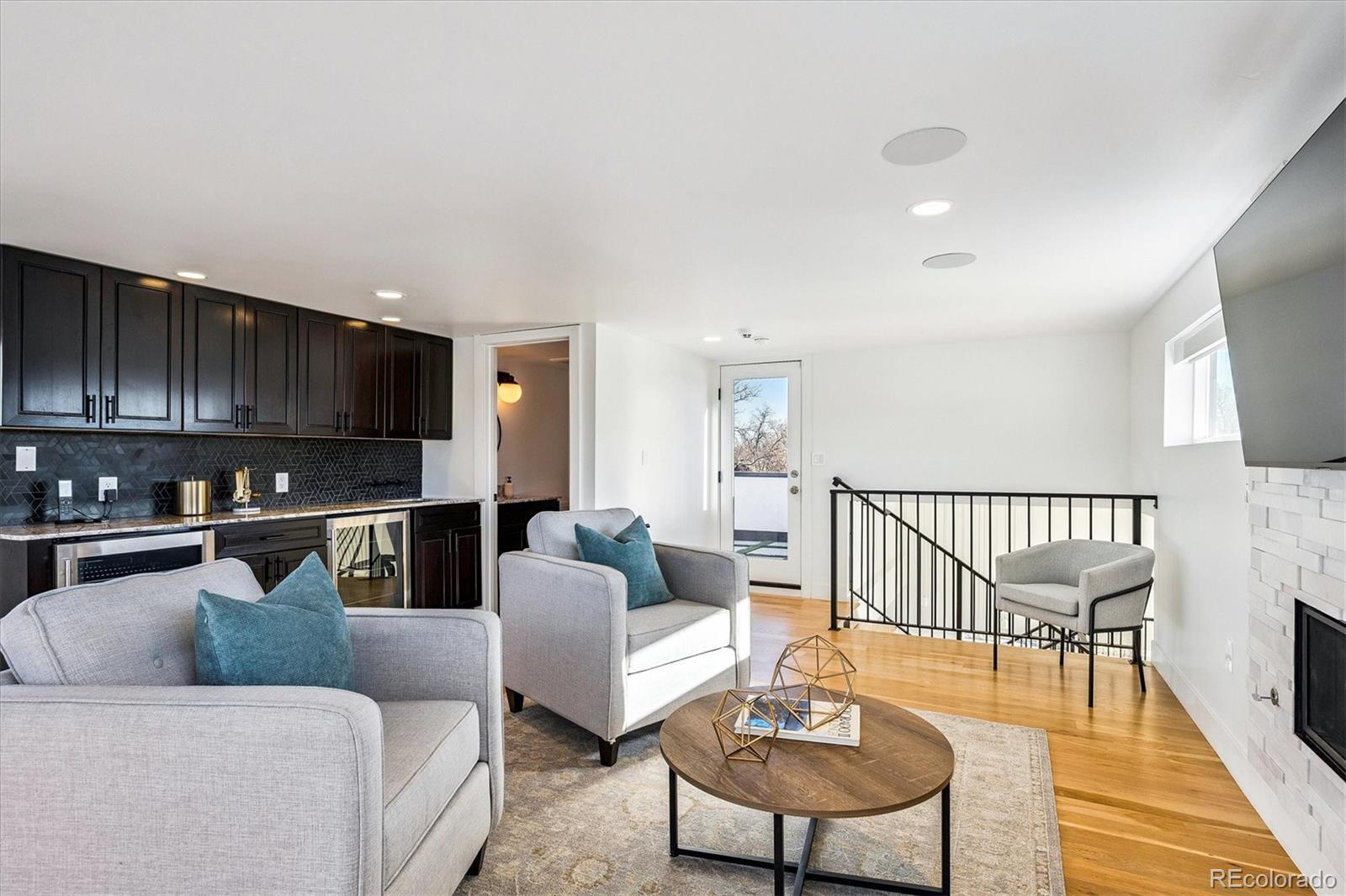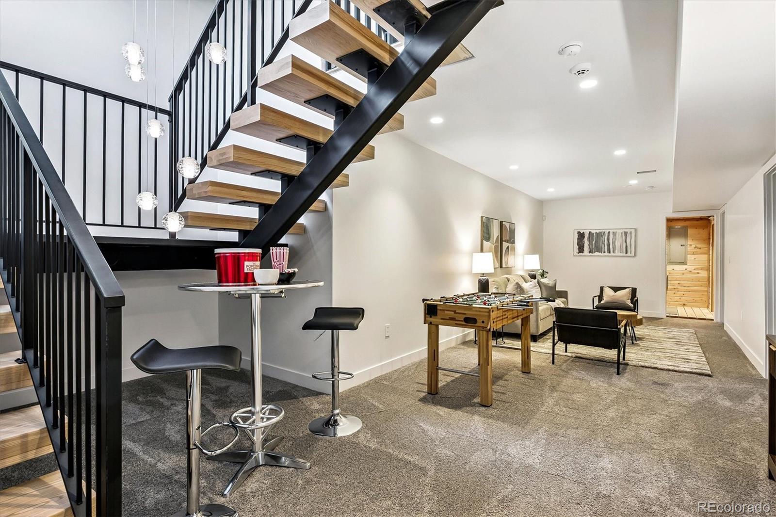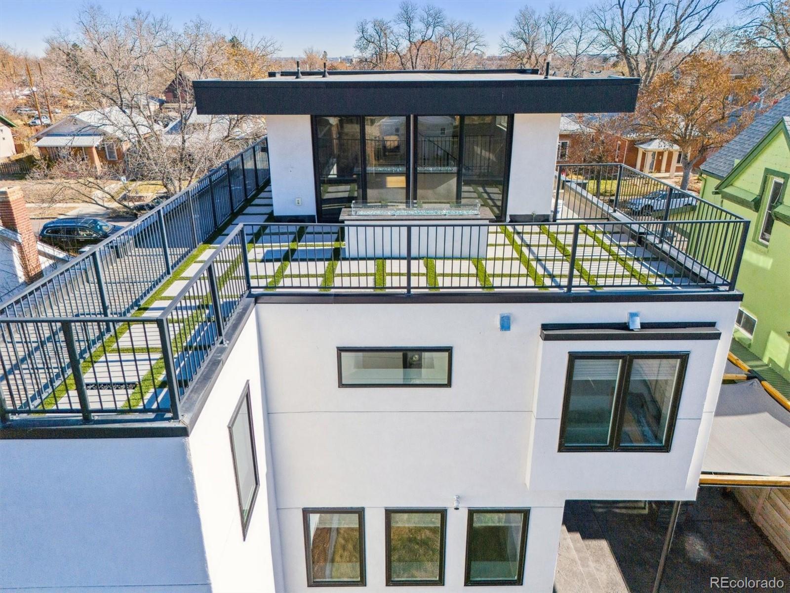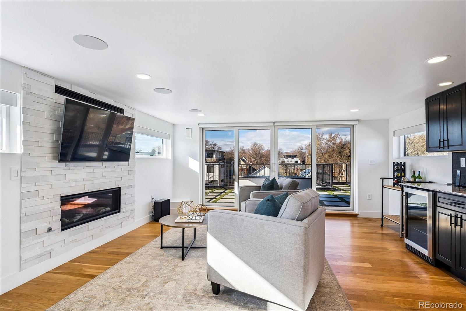 This custom-built home blends sleek modern design with exceptional craftsmanship and a newly installed Lutron smart home system that controls lights, automated shades, thermostat, alarm, and security cameras. Thoughtful details throughout create a refined yet highly functional space for daily living and effortless entertaining. An open floor plan connects the great room—with a contemporary linear gas fireplace—to the chef’s kitchen featuring a quartz waterfall island and high-end Dacor appliances. Accordion doors open to a covered patio with fire pit, outdoor kitchen area, and a splash-pad/wading pool. A mudroom, powder room, and oversized heated 2-car garage (plus two additional parking spaces) complete the level. A floating staircase leads to the luxurious primary suite with gas fireplace, spa-like bath, and walk-in closet. Two secondary bedrooms share a bathroom with double vanity. A spacious laundry room and a large front balcony offer added convenience. Automated shades provide comfort and privacy throughout the level. The third floor offers a private entertaining retreat with a wrap-around deck showcasing mountain views, a gas fire pit, wet bar, wine/beverage refrigerators, and a half bath. The basement provides a versatile space with a large media room, secure vault safe-room, guest bedroom, office, and relaxing sauna. Ideally situated with easy access to the Highlands, Downtown Denver, Sloan’s Lake, and I-70.