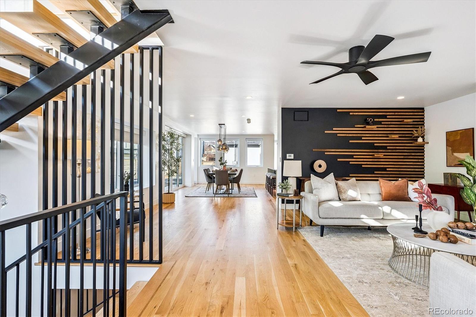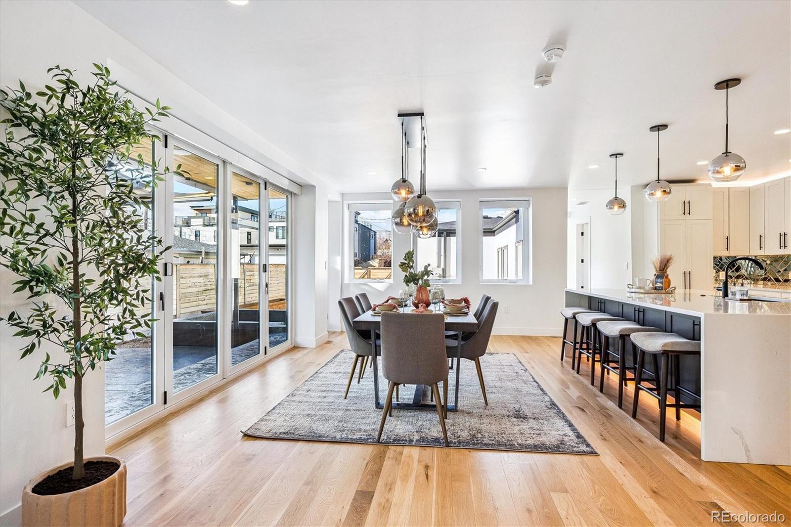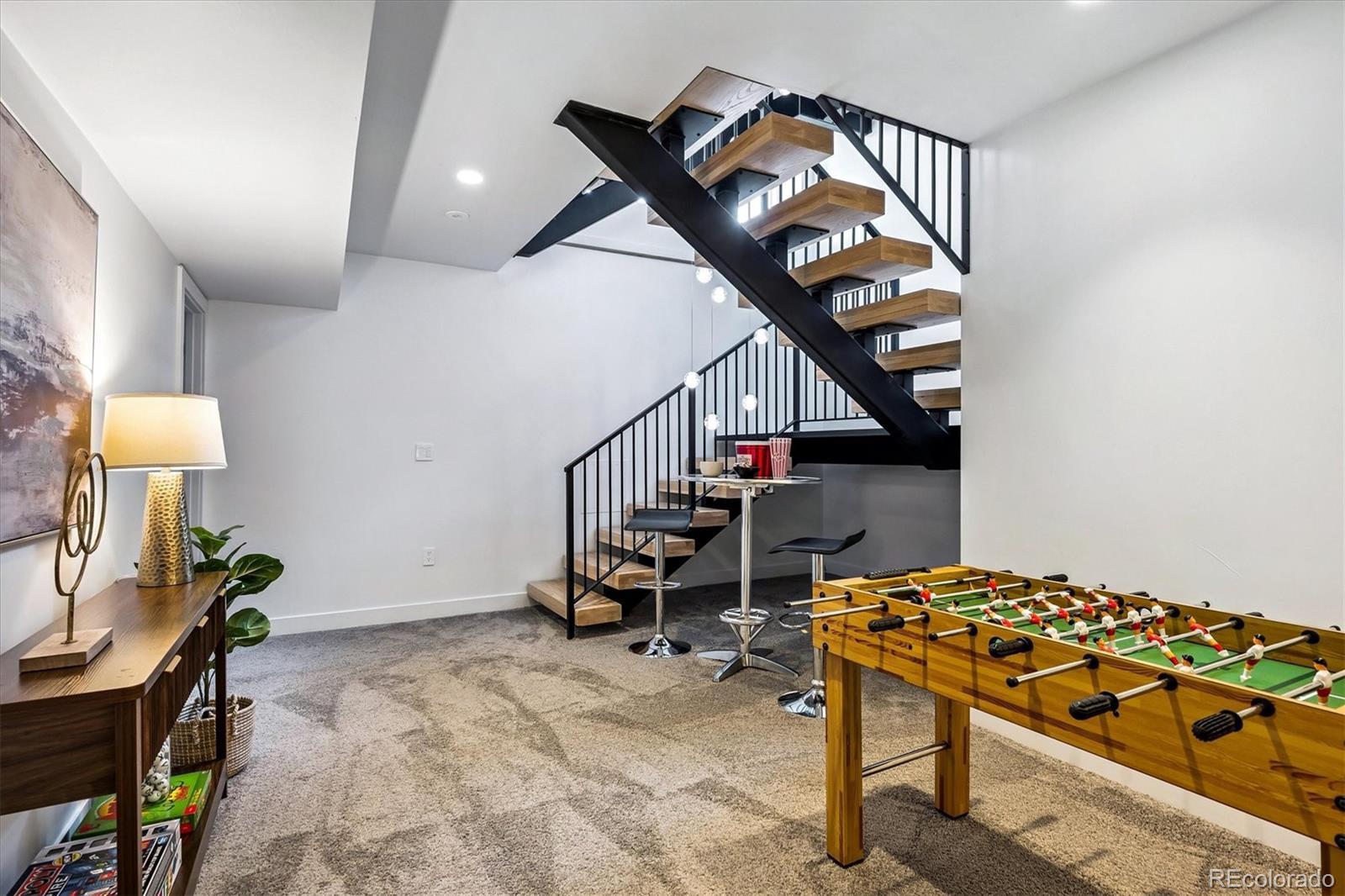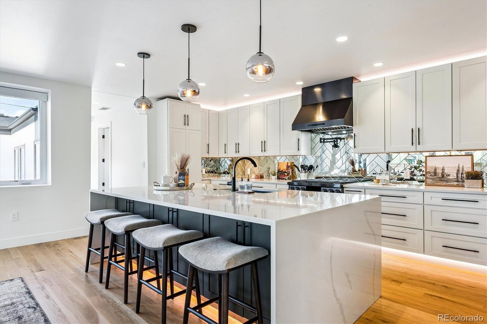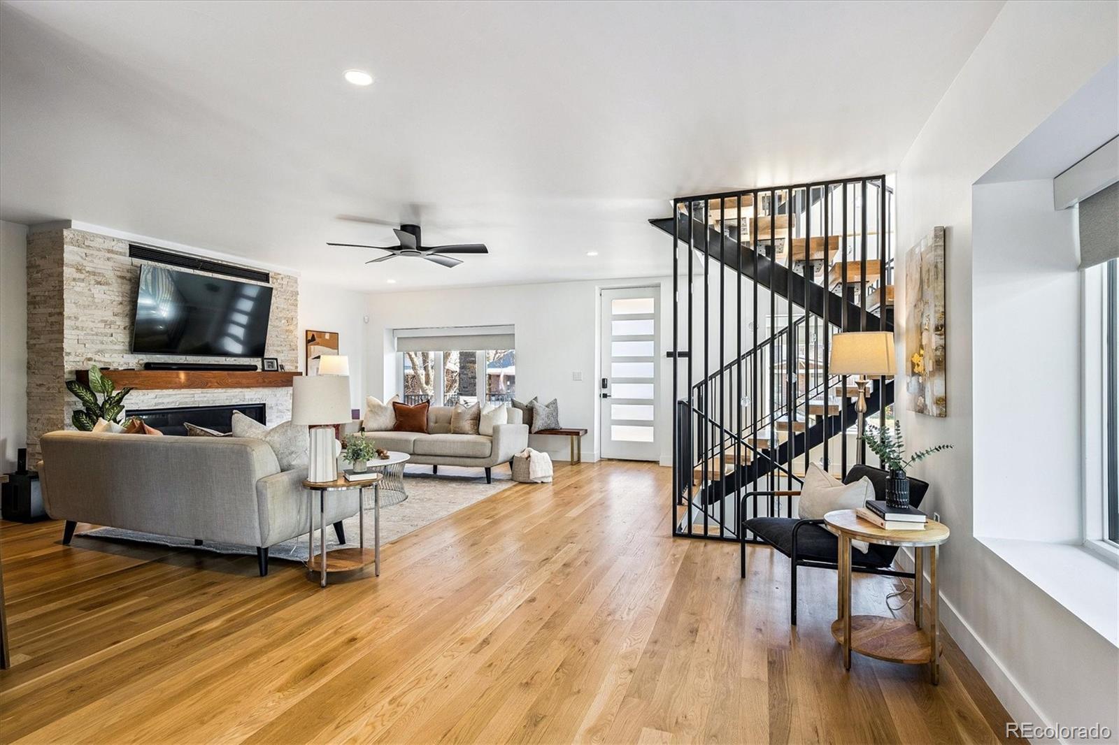 This custom-built home blends sleek modern design with exceptional craftsmanship and a newly installed Lutron smart home system that controls lights, automated shades, thermostat, alarm, and security cameras. Thoughtful details throughout create a refined yet highly functional space for daily living and effortless entertaining. An open floor plan connects the great room—with a contemporary linear gas fireplace—to the chef’s kitchen featuring a quartz waterfall island and high-end Dacor appliances. Accordion doors open to a covered patio with fire pit, outdoor kitchen area, and a splash-pad/wading pool. A mudroom, powder room, and oversized heated 2-car garage (plus two additional parking spaces) complete the level. A floating staircase leads to the luxurious primary suite with gas fireplace, spa-like bath, and walk-in closet. Two secondary bedrooms share a bathroom with double vanity. A spacious laundry room and a large front balcony offer added convenience. Automated shades provide comfort and privacy throughout the level. The third floor offers a private entertaining retreat with a wrap-around deck showcasing mountain views, a gas fire pit, wet bar, wine/beverage refrigerators, and a half bath. The basement provides a versatile space with a large media room, secure vault safe-room, guest bedroom, office, and relaxing sauna. Ideally situated with easy access to the Highlands, Downtown Denver, Sloan’s Lake, and I-70.