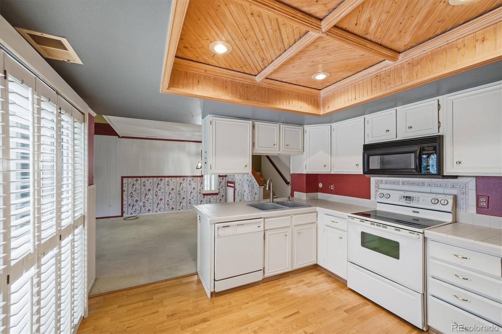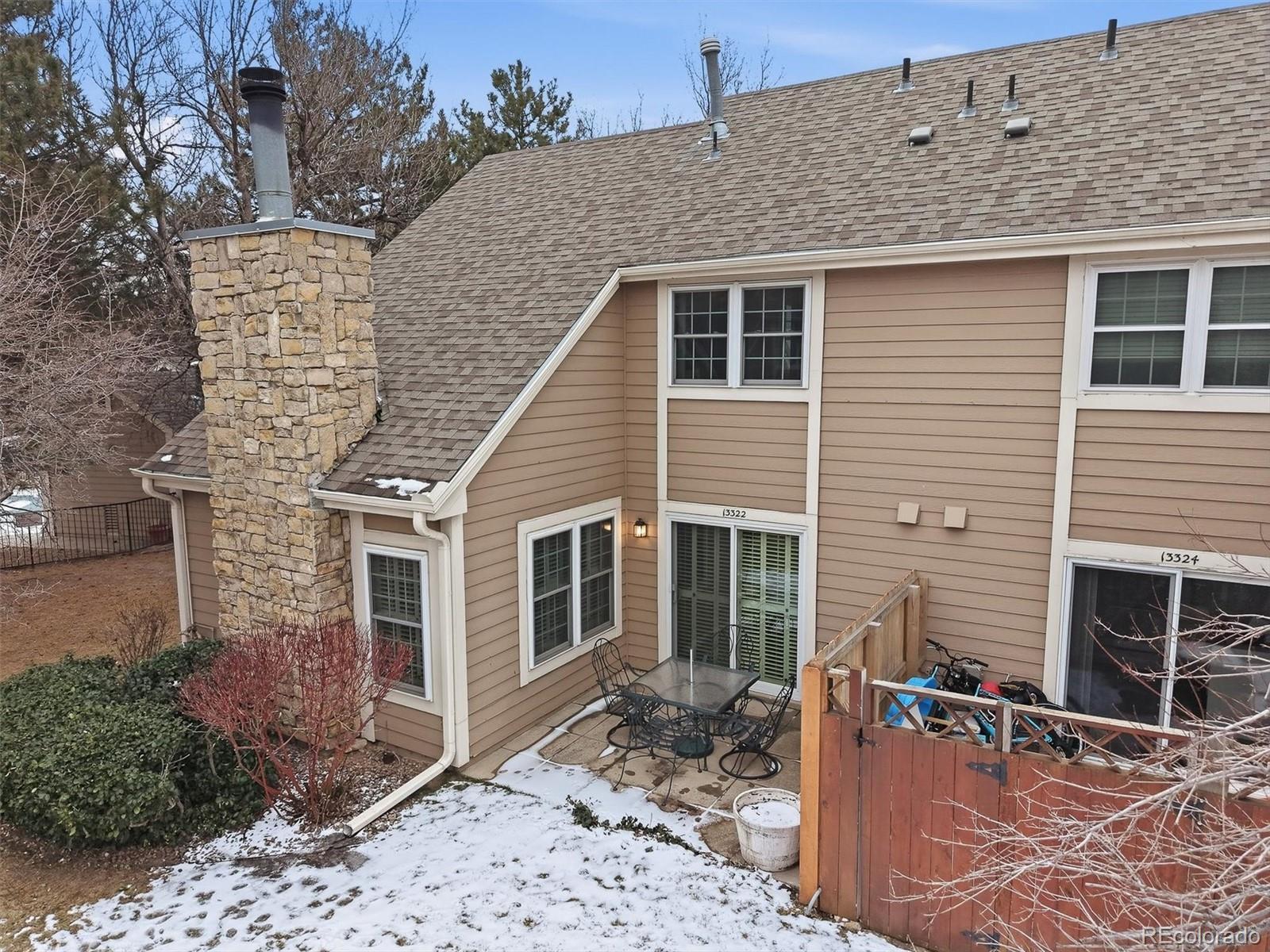 Charming end-unit townhome offered in its current As Is condition - priced accordingly, with no additional improvements to be made by the seller. This is the BEST value in all of Heather Ridge. Needs updating. This light-filled home features plantation shutters on the main level and a comfortable layout that includes 2 bedrooms, 2 full baths, and a loft overlooking the living room. The spacious living room offers a gas fireplace with stone accents, creating a cozy ambiance. The kitchen opens to a private outdoor patio through a sliding glass door, with patio furniture included for your convenience. Extra storage closet located on main level. The primary suite features a walk-in closet and a separate soaking tub, perfect for relaxation. Flooring consists of a mix of carpet and wood laminate, providing both comfort and style. Additional highlights include newer windows, garage #117 located directly across from the unit, and one reserved surface parking space directly in front of unit. The home is directly next to the neighborhood pool, offering easy access for outdoor enjoyment. Please note: there is no air conditioning.