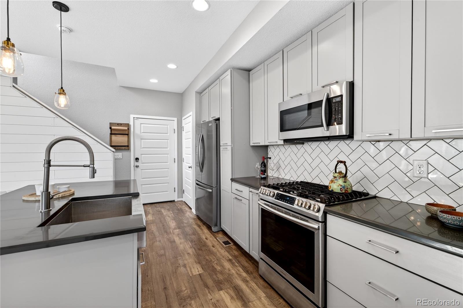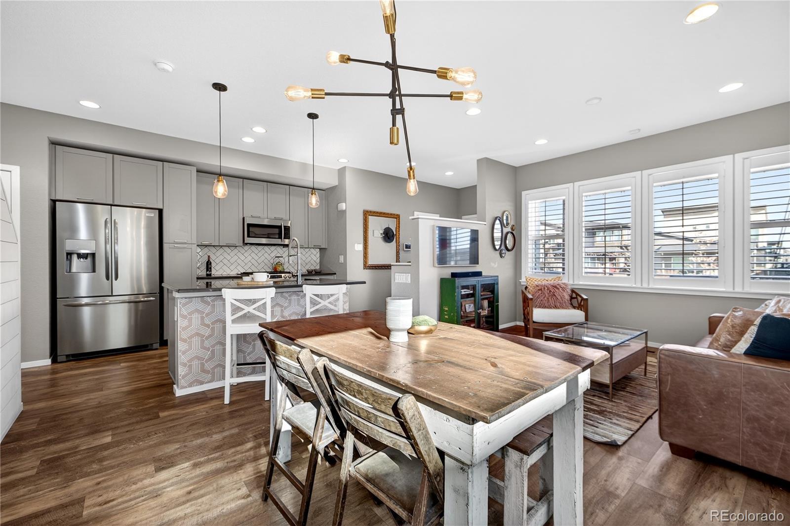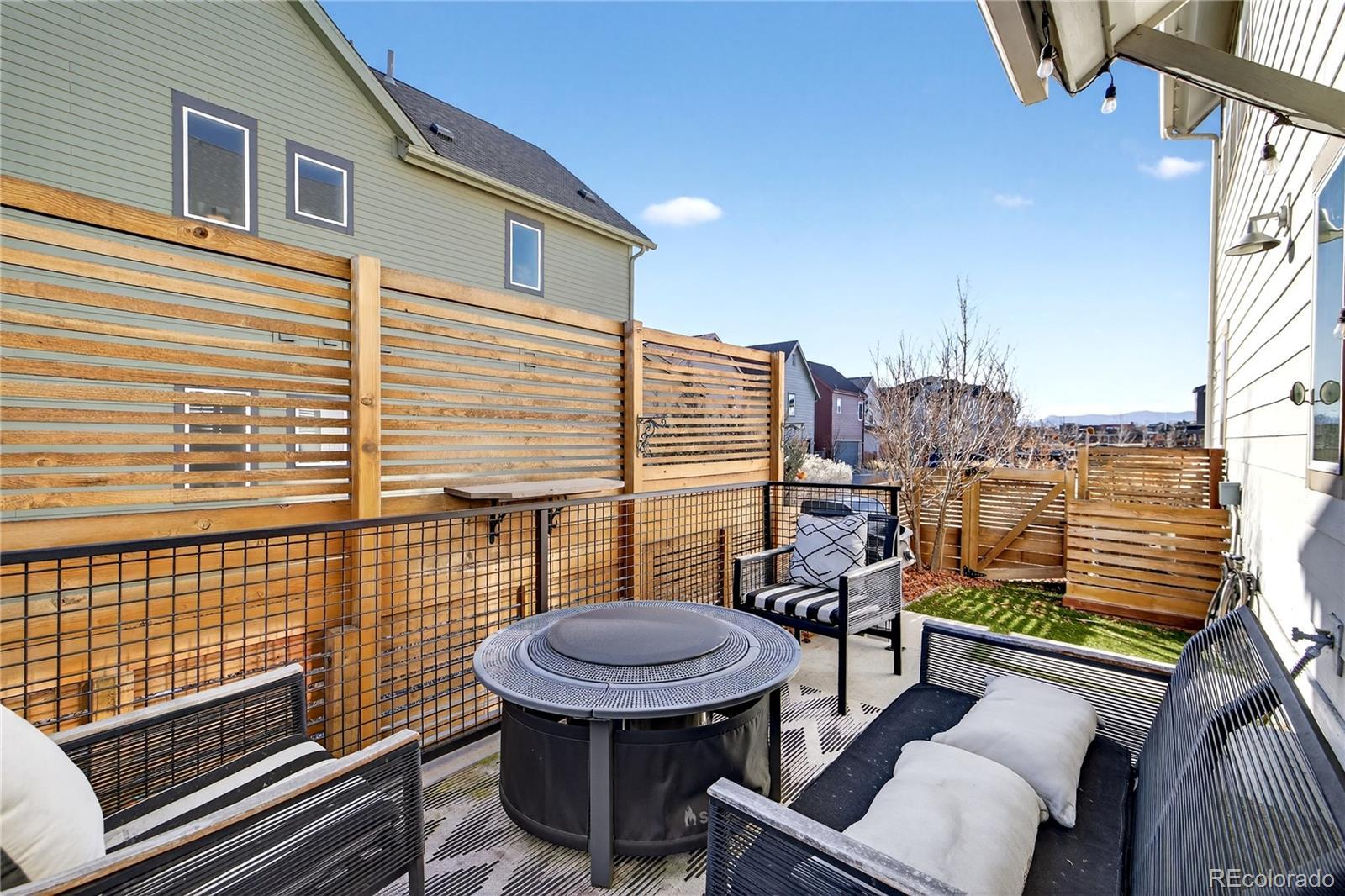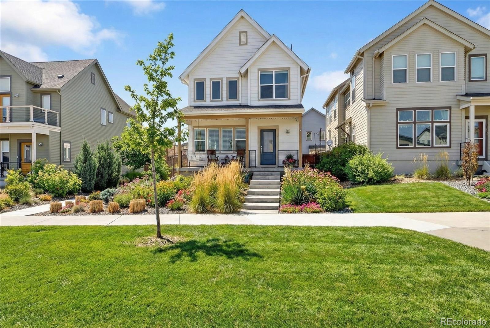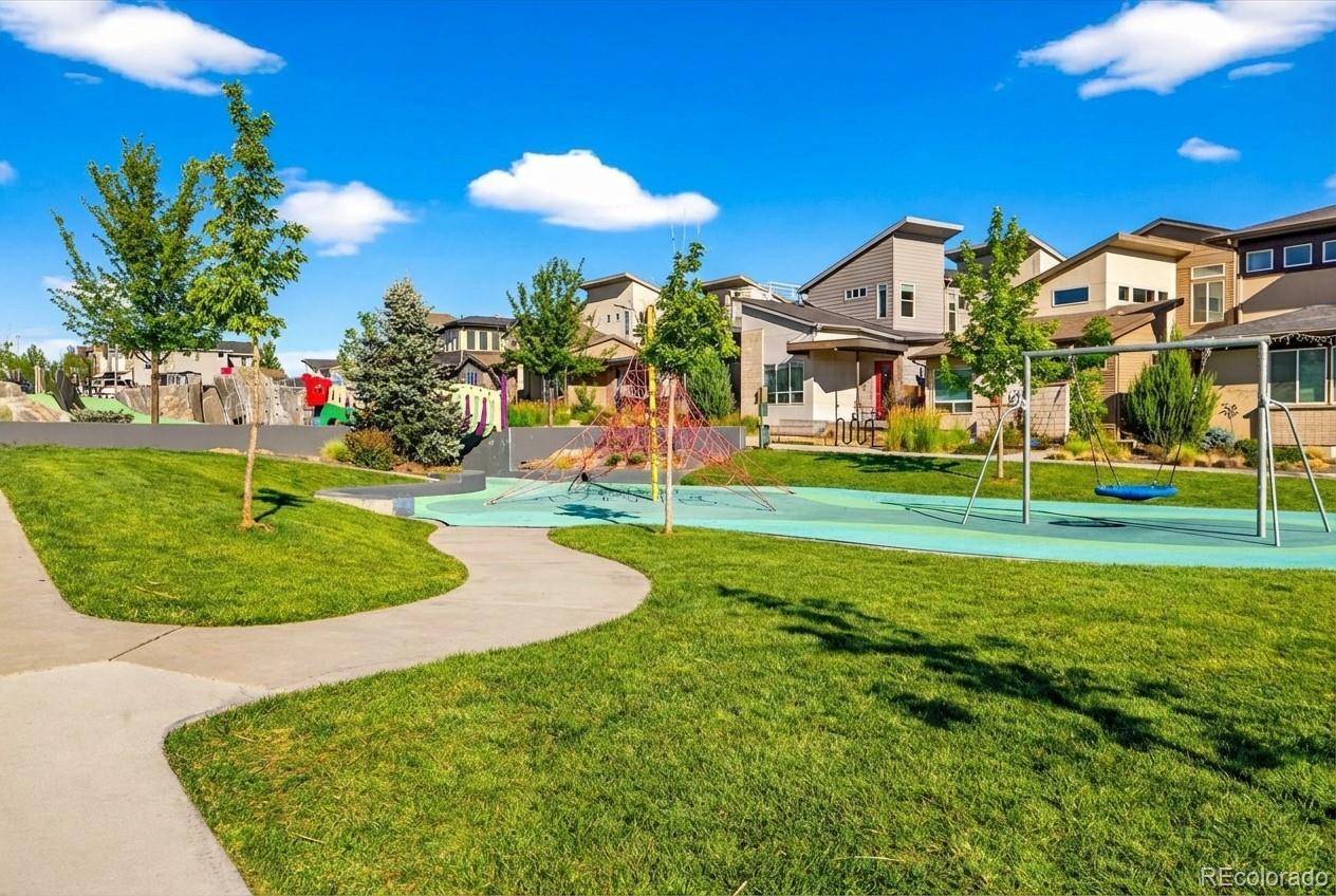 Welcome to this beautifully upgraded 2019 Brookfield Tealight, positioned fronting the park on a premium lot with front yard maintained by the Metro District. Enjoy peaceful east-facing mornings from the covered front porch. The open-concept main level is designed for both everyday living and entertaining, anchored by a large kitchen island that serves as the heart of the home. Upgraded finishes and engineered hardwood floors—extending throughout the main living areas, bedrooms and up the stairs—create a cohesive, elevated feel. Expansive sliding glass doors open to the backyard, seamlessly connecting indoor and outdoor living on the main level. Louvered shutters on the main living windows add both style and function. Upstairs, the primary suite is filled with natural light from expansive windows even boasting a mountain view. The primary ensuite bath features a dual-sink vanity with quartz countertops, a low-entry tiled shower, and a thoughtfully designed walk-in closet complete with built-in shelving for easy organization. There are two additional bedrooms upstairs with park views and vaulted ceilings with access to a full bathroom including tub and tile surround. Also located upper-level is the laundry room, with built in cabinets, washer and dryer included. The fully finished basement provides additional flexible living space, ideal for a media room, home gym, or guest retreat. Outside, the low-maintenance backyard features privacy fence, artificial turf and an elevated concrete patio—perfect for entertaining, relaxing, and taking in mountain views. Located in Denver’s Midtown neighborhood, this home is on the park, near open space, and miles of trails, with local favorites like Early Bird Restaurant and Bruz Brewery just minutes away. With its rare park-front location, open layout, and thoughtful upgrades throughout, this home offers a lifestyle that is both comfortable and effortlessly stylish.