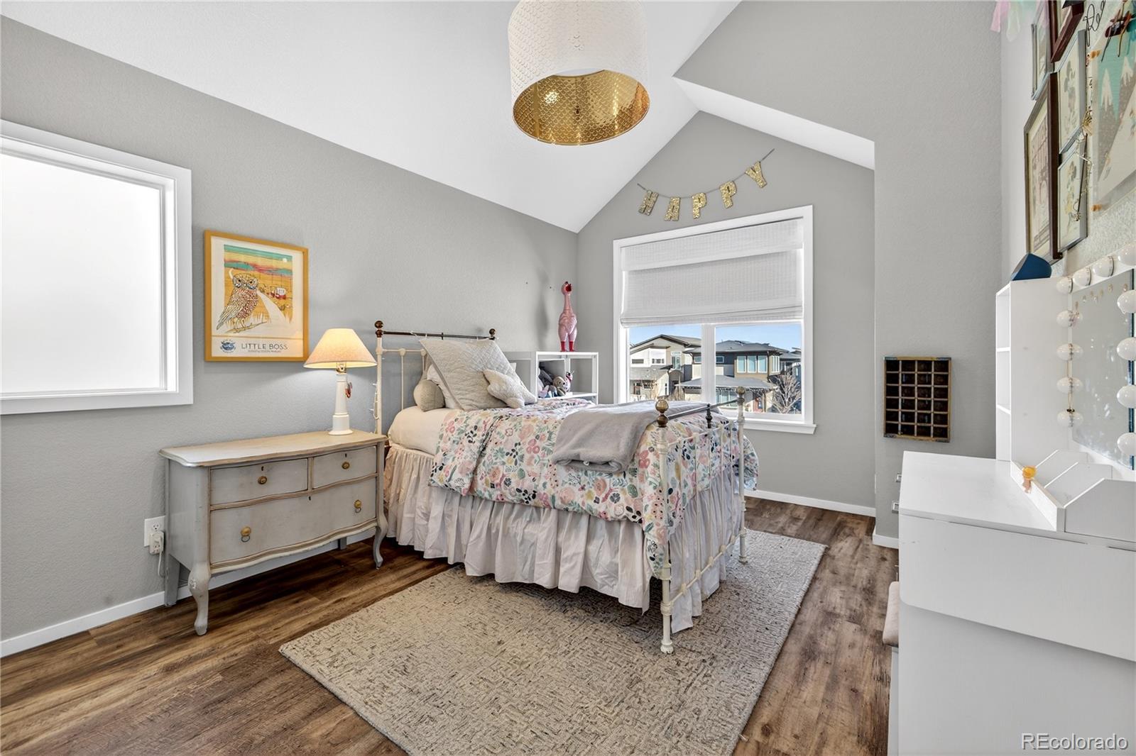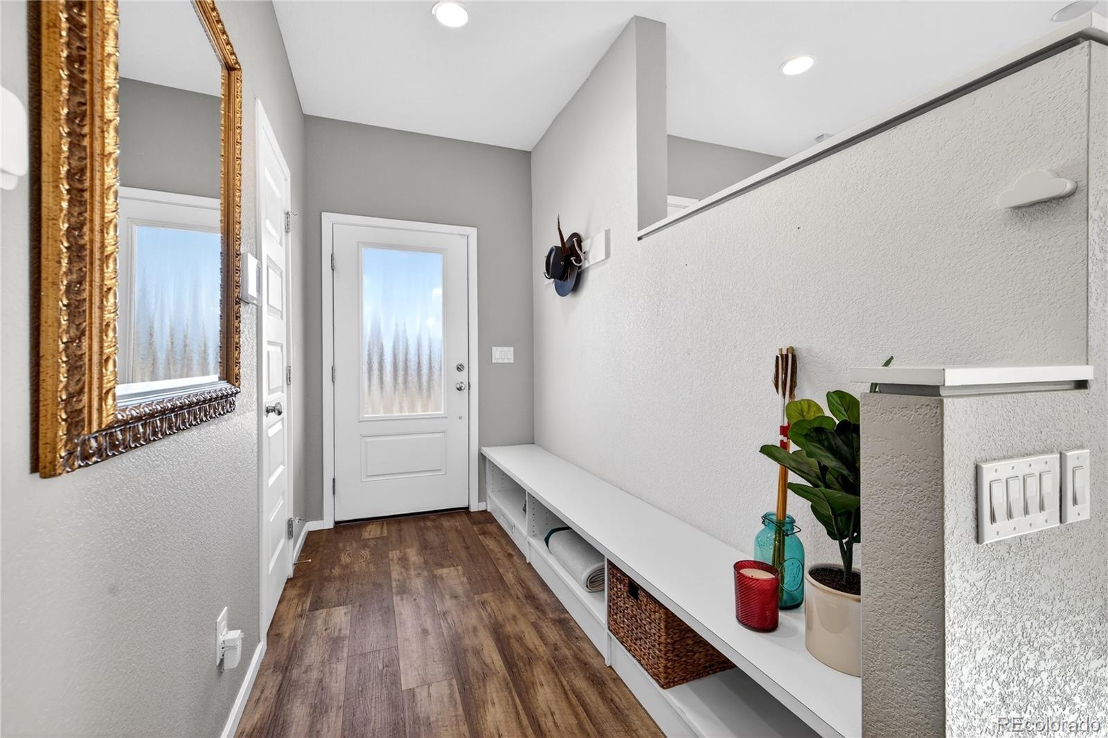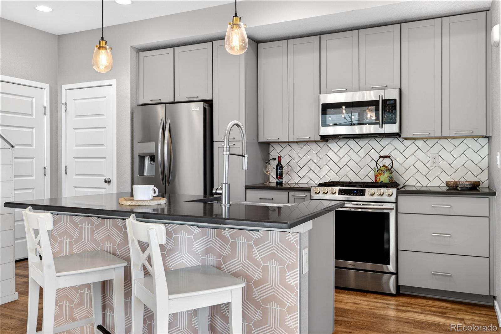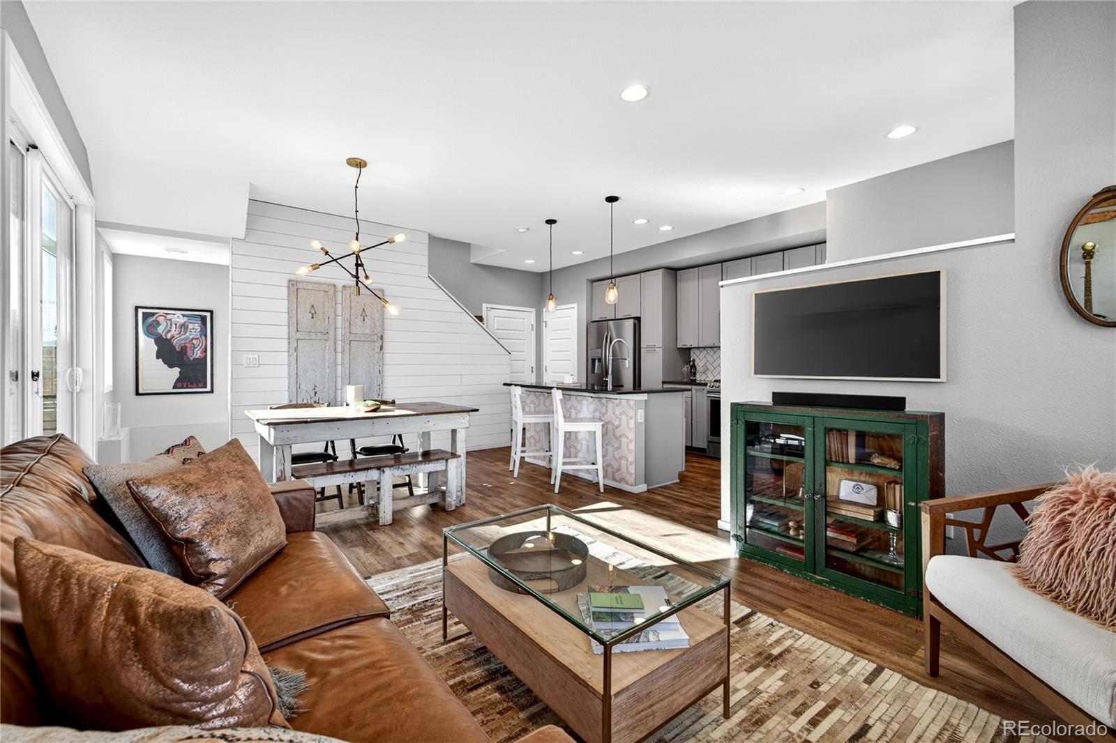 Welcome to this beautifully upgraded 2019 Brookfield Tealight, positioned fronting the park on a premium lot with front yard maintained by the Metro District. Enjoy peaceful east-facing mornings from the covered front porch. The open-concept main level is designed for both everyday living and entertaining, anchored by a large kitchen island that serves as the heart of the home. Upgraded finishes and engineered hardwood floors—extending throughout the main living areas, bedrooms and up the stairs—create a cohesive, elevated feel. Expansive sliding glass doors open to the backyard, seamlessly connecting indoor and outdoor living on the main level. Louvered shutters on the main living windows add both style and function. Upstairs, the primary suite is filled with natural light from expansive windows even boasting a mountain view. The primary ensuite bath features a dual-sink vanity with quartz countertops, a low-entry tiled shower, and a thoughtfully designed walk-in closet complete with built-in shelving for easy organization. There are two additional bedrooms upstairs with park views and vaulted ceilings with access to a full bathroom including tub and tile surround. Also located upper-level is the laundry room, with built in cabinets, washer and dryer included. The fully finished basement provides additional flexible living space, ideal for a media room, home gym, or guest retreat. Outside, the low-maintenance backyard features privacy fence, artificial turf and an elevated concrete patio—perfect for entertaining, relaxing, and taking in mountain views. Located in Denver’s Midtown neighborhood, this home is on the park, near open space, and miles of trails, with local favorites like Early Bird Restaurant and Bruz Brewery just minutes away. With its rare park-front location, open layout, and thoughtful upgrades throughout, this home offers a lifestyle that is both comfortable and effortlessly stylish.