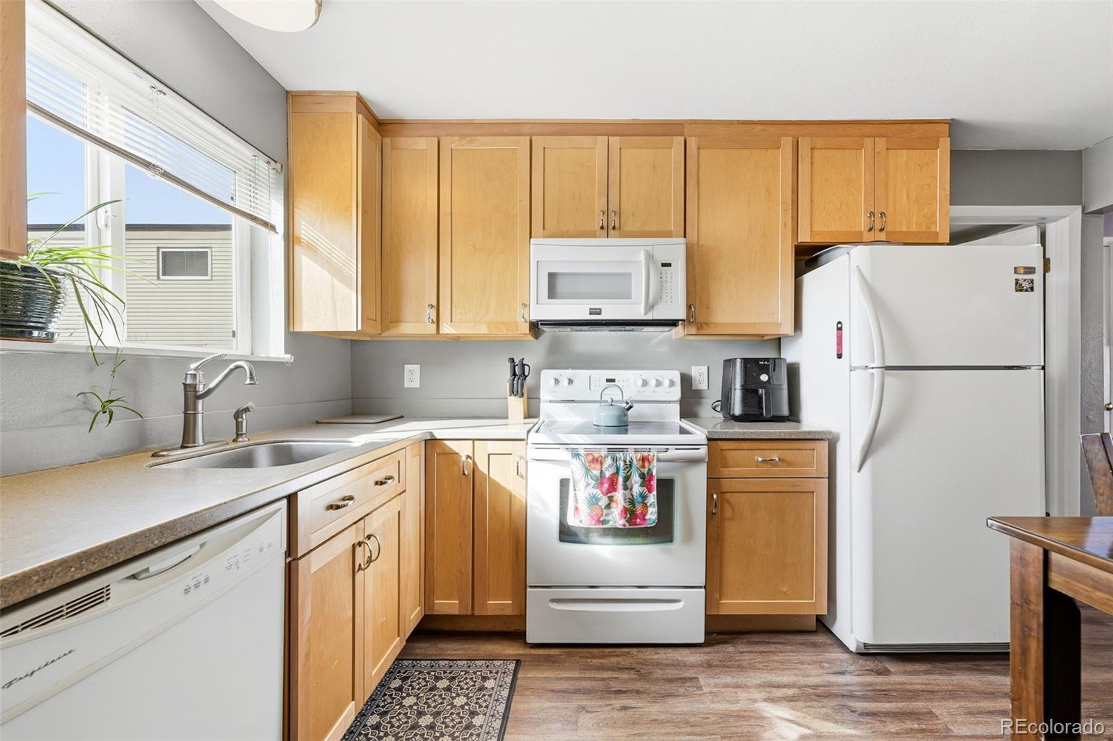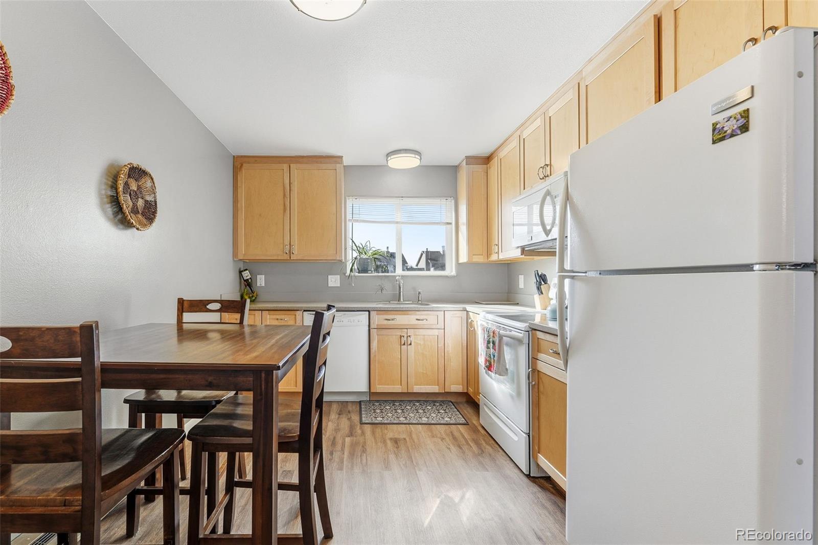 Open and bright two-bed two-bathroom condo located less than a mile from Old Town Arvada. The spacious kitchen is the heart of this home with plenty of counter space, an abundance of cabinets and storage, a dining area, and an open flow so that the living space and kitchen areas are connected. There is an updated half-bathroom on the main level for convenience, as well as a washer and dryer which are included in the sale. Two bedrooms upstairs and the primary enjoys a sliding glass door and balcony for morning coffee or tea, a reading space, or just an excuse to sit outside. The second bedroom has a large south-facing window for even more natural light, a common theme in this home. Updated and modern full-bathroom with tiled shower and floors, dual-vanity sink, updated lighting, and a large soaking tub. Bonus points for an included storage unit, two reserved parking spaces, and a front porch to watch the world go by. There’s plenty of grass just outside for letting the fur-babies out, and a fifteen-minute walk or a five-minute bike ride or drive from top-rated restaurants, bakeries, Ralston Creek and parks, yoga studios, the Arvada Community Room, and everything else Old Town Arvada.