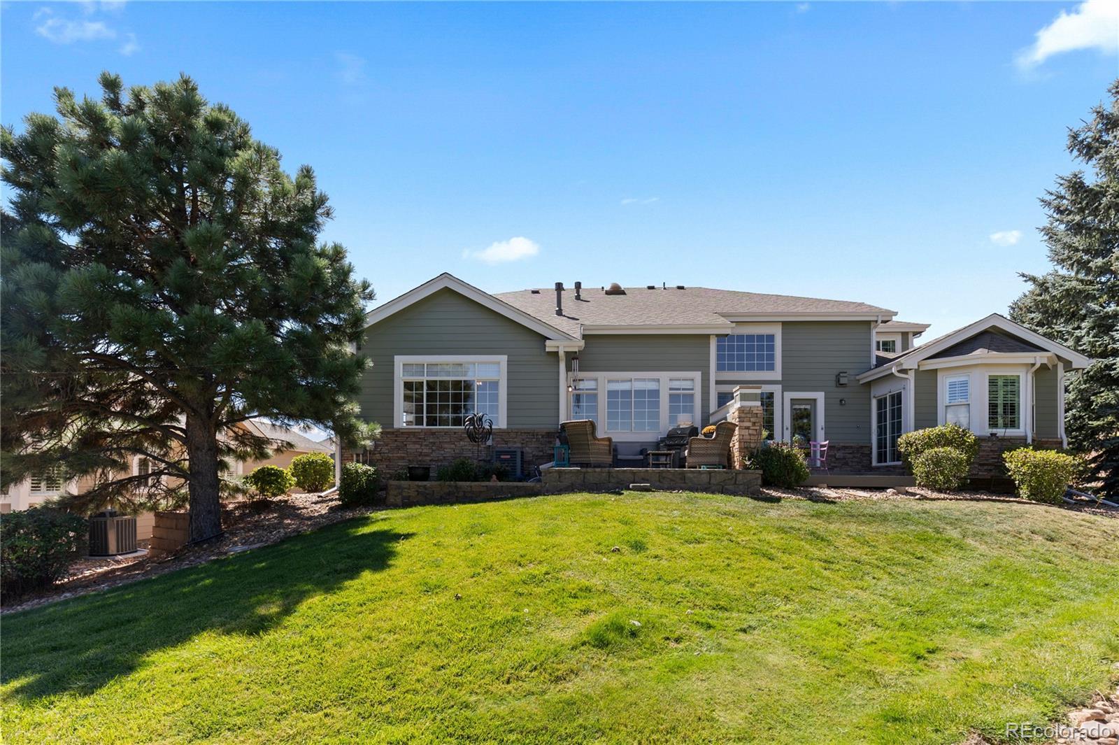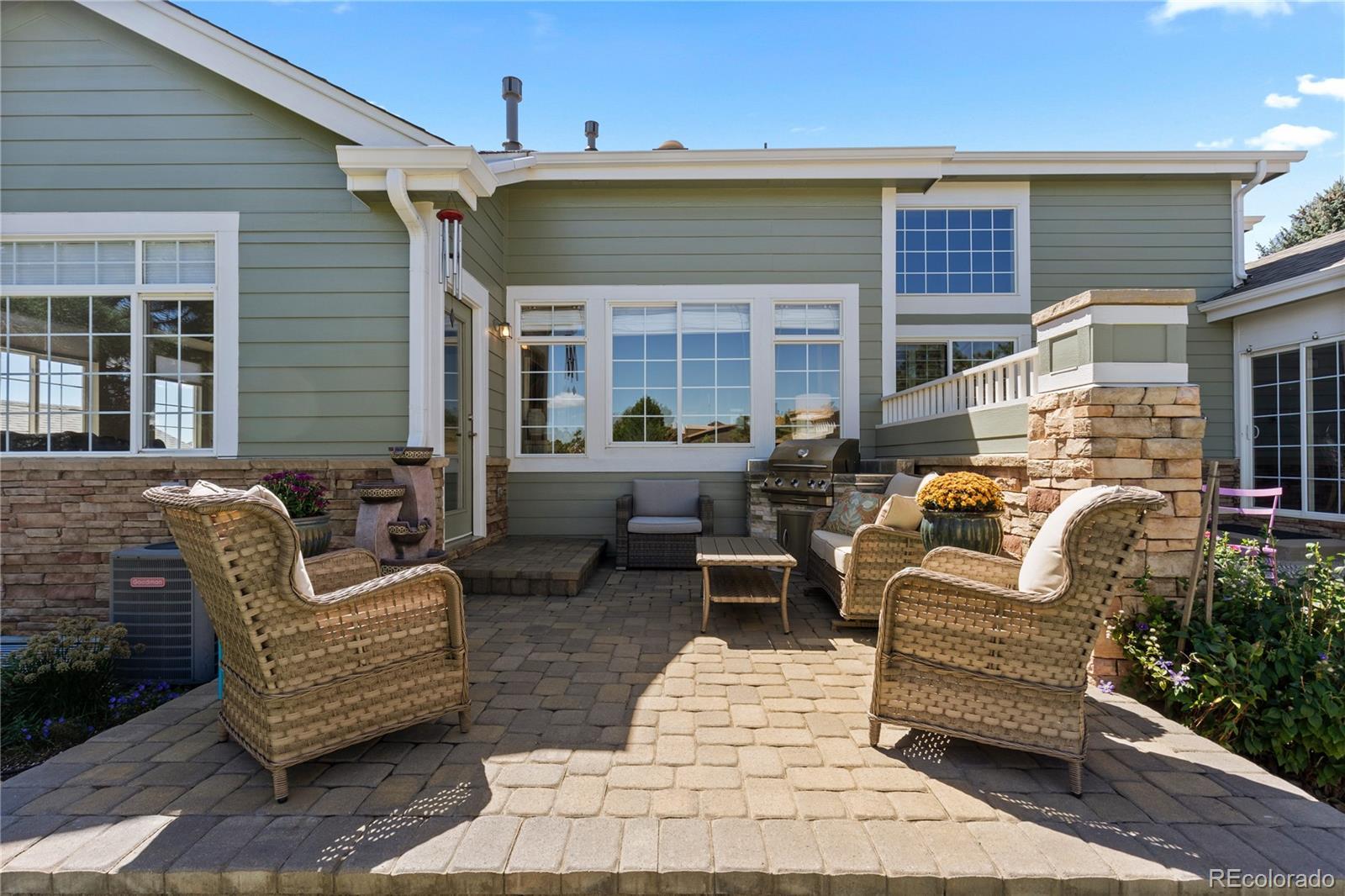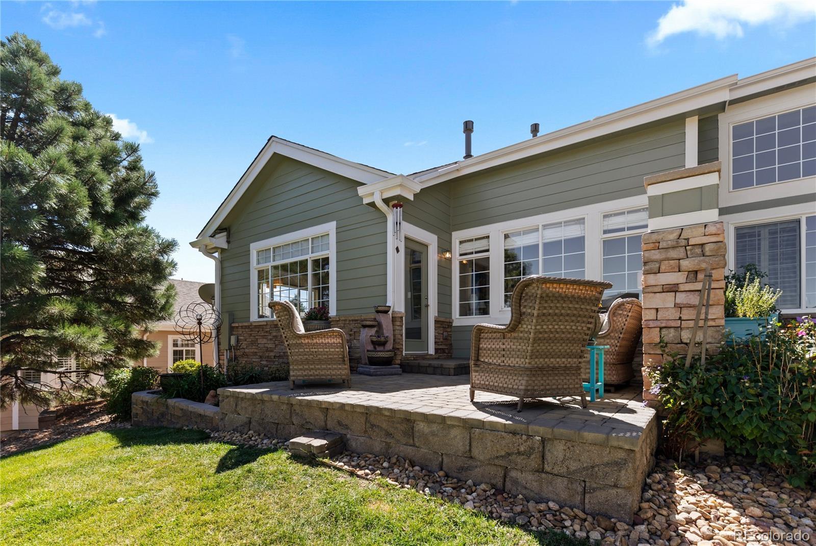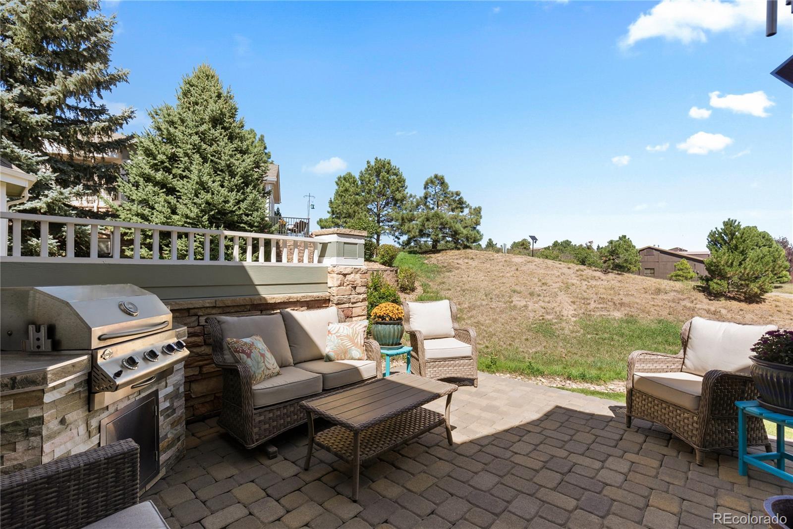 Nestled in the exclusive, low-maintenance enclave of Villa Carriage at Pineridge - adjacent to The Ridge Golf Course and overlooking the scenic expanse of Daniels Park - this beautifully remodeled 3-bedroom, 4-bath townhome offers luxurious living and a true lock-and-leave lifestyle. Rarely available and highly sought-after, this residence has been thoughtfully updated with high-end designer finishes throughout. The light-filled main level welcomes you with soaring vaulted ceilings, hickory hardwood floors, and a striking fireplace wrapped in elegant tile. The gourmet kitchen is both functional and stylish, featuring crisp white cabinetry, granite countertops, glass tile backsplash, newer stainless steel appliances, and tile flooring. A charming bay window in the breakfast nook adds character and natural light. The spacious main-floor primary suite offers privacy and comfort, complete with a fully customized walk-in closet and a spa-like en suite bath featuring a zero-entry tiled shower, dual sinks, upgraded fixtures, and custom lighting. Upstairs, you’ll find a second expansive primary suite with its own ensuite full bath and dual-sink vanity, along with a flexible loft space ideal for a home office, lounge, or reading retreat. The fully finished lower level enhances the home’s versatility, showcasing a new third bedroom and bathroom - perfect for guests or multigenerational living. Step outside to your private patio with a new built-in grill - ideal for outdoor dining with beautifully landscaped surroundings. Located in one of Castle Pines’ most peaceful and well-maintained communities, this turn-key townhome is minutes from golf, trails, shopping, and I-25. A rare opportunity for the discerning buyer seeking elegance, convenience, and timeless Colorado charm.