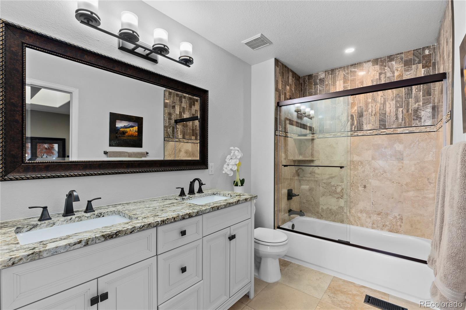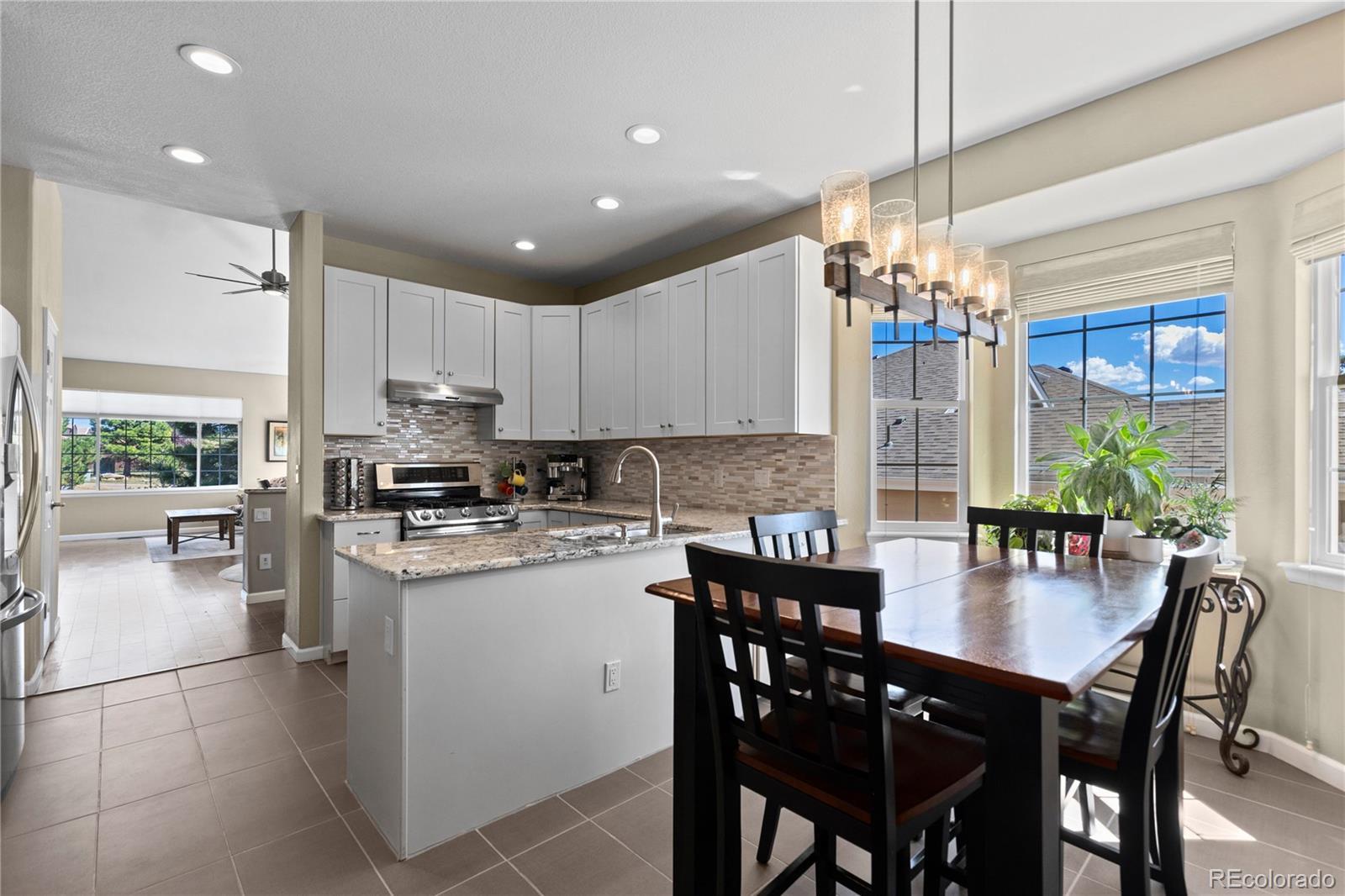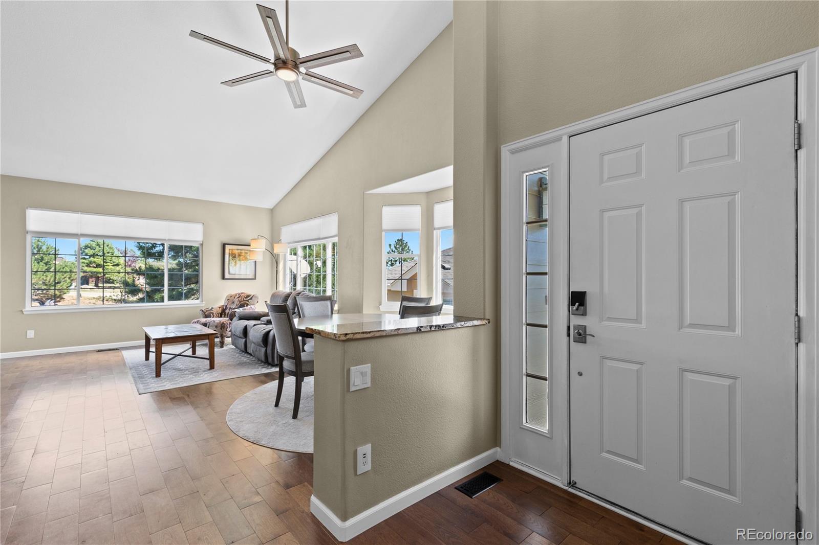 Nestled in the exclusive, low-maintenance enclave of Villa Carriage at Pineridge - adjacent to The Ridge Golf Course and overlooking the scenic expanse of Daniels Park - this beautifully remodeled 3-bedroom, 4-bath townhome offers luxurious living and a true lock-and-leave lifestyle. Rarely available and highly sought-after, this residence has been thoughtfully updated with high-end designer finishes throughout. The light-filled main level welcomes you with soaring vaulted ceilings, hickory hardwood floors, and a striking fireplace wrapped in elegant tile. The gourmet kitchen is both functional and stylish, featuring crisp white cabinetry, granite countertops, glass tile backsplash, newer stainless steel appliances, and tile flooring. A charming bay window in the breakfast nook adds character and natural light. The spacious main-floor primary suite offers privacy and comfort, complete with a fully customized walk-in closet and a spa-like en suite bath featuring a zero-entry tiled shower, dual sinks, upgraded fixtures, and custom lighting. Upstairs, you’ll find a second expansive primary suite with its own ensuite full bath and dual-sink vanity, along with a flexible loft space ideal for a home office, lounge, or reading retreat. The fully finished lower level enhances the home’s versatility, showcasing a new third bedroom and bathroom - perfect for guests or multigenerational living. Step outside to your private patio with a new built-in grill - ideal for outdoor dining with beautifully landscaped surroundings. Located in one of Castle Pines’ most peaceful and well-maintained communities, this turn-key townhome is minutes from golf, trails, shopping, and I-25. A rare opportunity for the discerning buyer seeking elegance, convenience, and timeless Colorado charm.