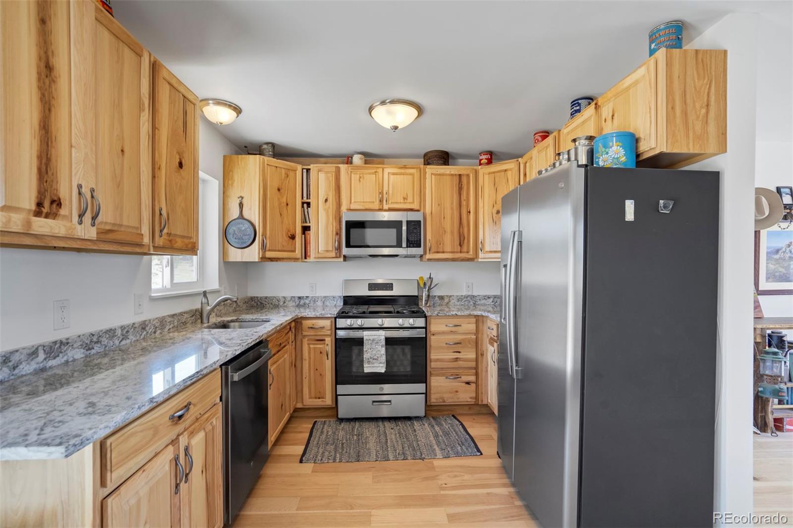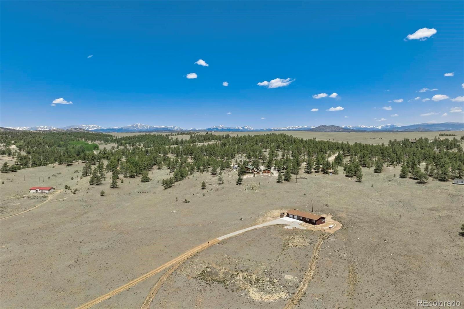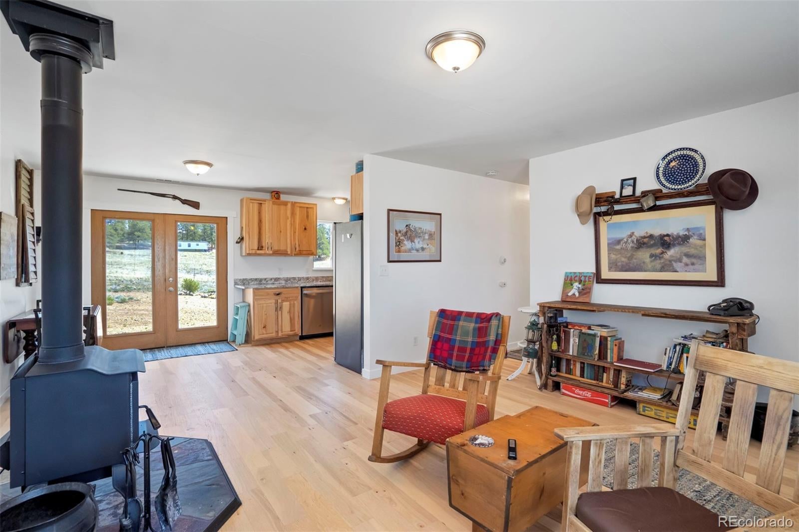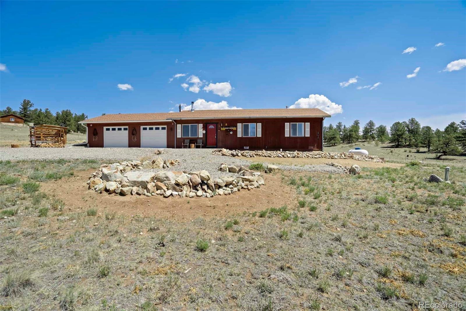 This beautifully updated 3-bedroom, 2-bathroom ranch home in Wildwood Rec Village offers 1,056 ft² of living space on a rare, level 10-acre lot. Featuring hickory floors throughout, this cheery abode exudes charm with a cozy living room that flows into the kitchen, complete with matching hickory cabinets. A wood-burning stove adds both ambiance and warmth, perfect for chilly evenings. The primary bedroom includes an attached bath with a unique Shabby Chic barn door and modern fixtures, while two additional bedrooms provide ample space for family, guests, or an office. A second bath and a laundry closet with a full-size washer and dryer are conveniently located in the hall for added functionality. Positioned perfectly for southern exposure, the home enjoys all-day sunlight, filling every room with abundant natural light. The attached 2-car garage is reinforced with spray foam insulation and offers a dedicated workspace area, windows, and an exterior door leading to the backyard. The cemented driveway and porches provide low-maintenance durability, making this property ideal for mountain living. A cool rock fire pit out front adds a welcoming touch, providing an excellent space for outdoor gatherings while enjoying sweeping views of meadows, treed mountain ranges, distant Thirtynine Mile Mountain, and breathtaking sunsets. Although the lot is open with few trees, the surrounding vistas are stunning and expansive. Residents of Wildwood Rec Village enjoy several amenities, including a full-time caretaker, a stocked fishing pond, picnic areas, and RV parking. Located near National Forests, Gold Medal fishing areas, and outdoor activities like skiing, rafting, and hiking, this home offers the ultimate retreat for those seeking both adventure and tranquility in the Colorado Rockies. Whether you're looking for a full-time residence or a weekend getaway, this home combines modern comfort with nature’s beauty, offering a distinctive gem in an exceptional location!