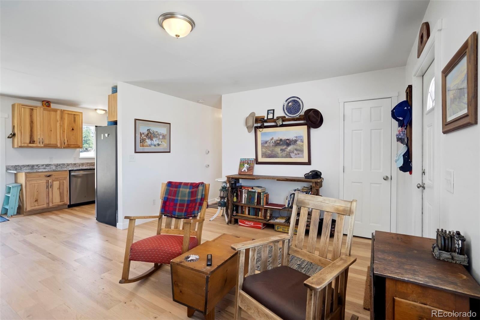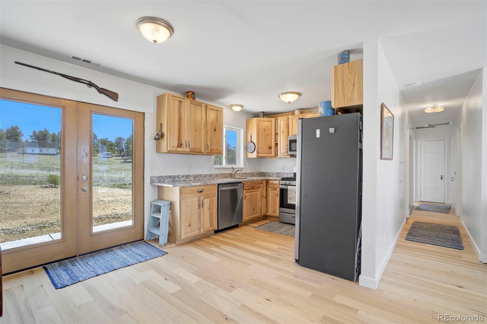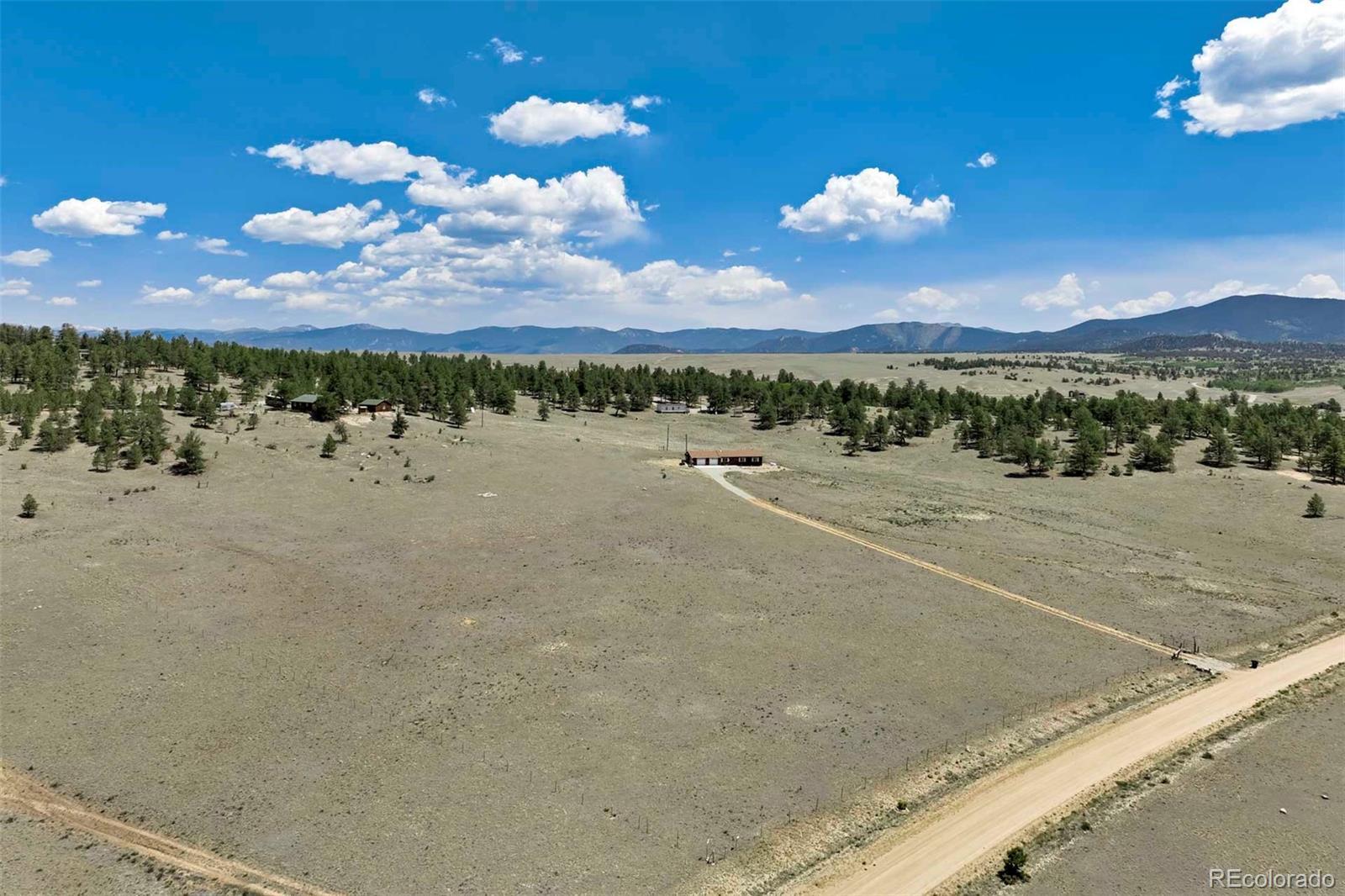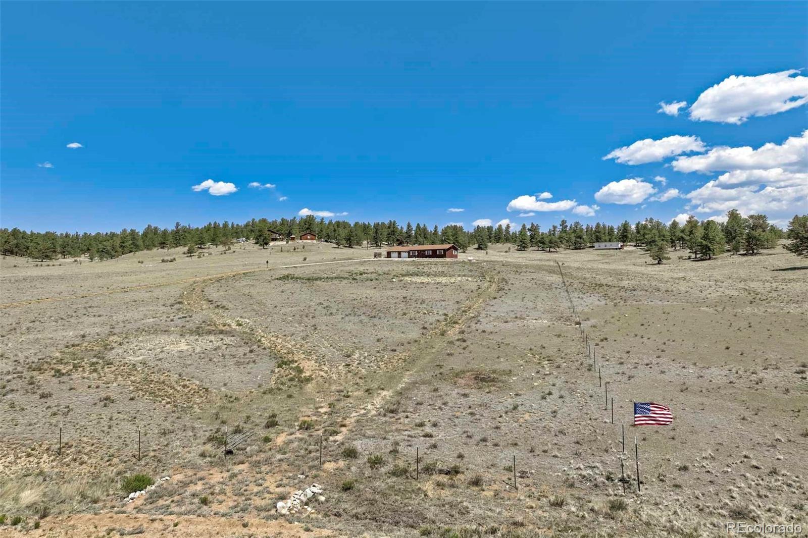This beautifully updated 3-bedroom, 2-bathroom ranch home in Wildwood Rec Village offers 1,056 ft² of living space on a rare, level 10-acre lot. Featuring hickory floors throughout, this cheery abode exudes charm with a cozy living room that flows into the kitchen, complete with matching hickory cabinets. A wood-burning stove adds both ambiance and warmth, perfect for chilly evenings. The primary bedroom includes an attached bath with a unique Shabby Chic barn door and modern fixtures, while two additional bedrooms provide ample space for family, guests, or an office. A second bath and a laundry closet with a full-size washer and dryer are conveniently located in the hall for added functionality. Positioned perfectly for southern exposure, the home enjoys all-day sunlight, filling every room with abundant natural light. The attached 2-car garage is reinforced with spray foam insulation and offers a dedicated workspace area, windows, and an exterior door leading to the backyard. The cemented driveway and porches provide low-maintenance durability, making this property ideal for mountain living. A cool rock fire pit out front adds a welcoming touch, providing an excellent space for outdoor gatherings while enjoying sweeping views of meadows, treed mountain ranges, distant Thirtynine Mile Mountain, and breathtaking sunsets. Although the lot is open with few trees, the surrounding vistas are stunning and expansive. Residents of Wildwood Rec Village enjoy several amenities, including a full-time caretaker, a stocked fishing pond, picnic areas, and RV parking. Located near National Forests, Gold Medal fishing areas, and outdoor activities like skiing, rafting, and hiking, this home offers the ultimate retreat for those seeking both adventure and tranquility in the Colorado Rockies. Whether you're looking for a full-time residence or a weekend getaway, this home combines modern comfort with nature’s beauty, offering a distinctive gem in an exceptional location!