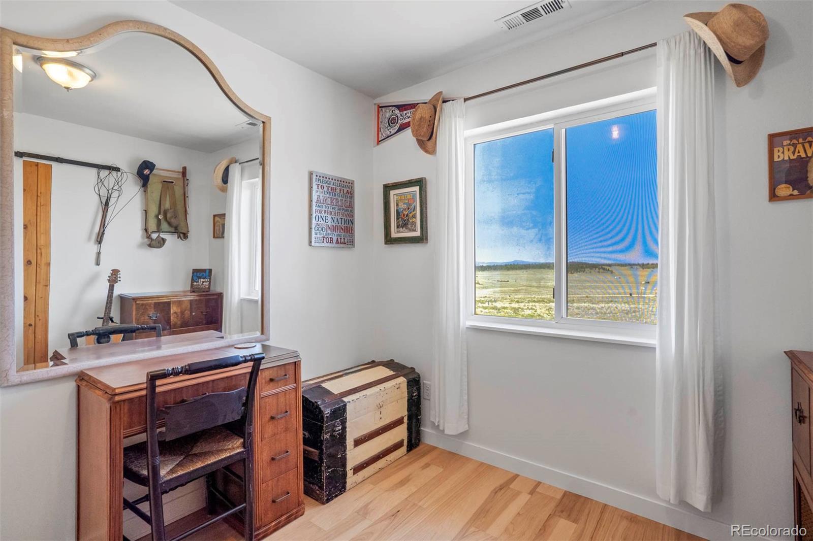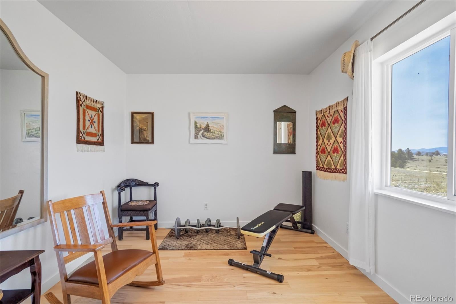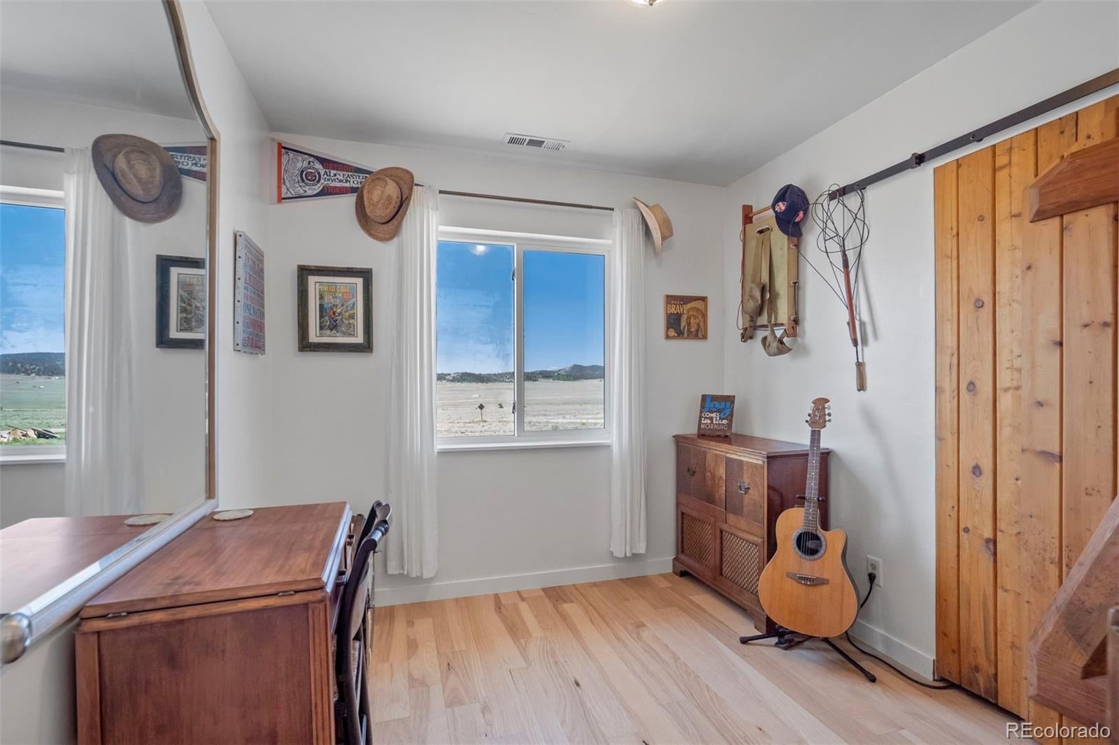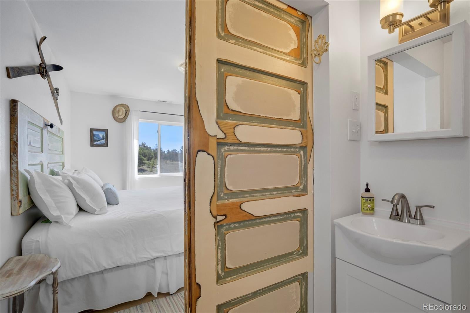 This beautifully updated 3-bedroom, 2-bathroom ranch home in Wildwood Rec Village offers 1,056 ft² of living space on a rare, level 10-acre lot. Featuring hickory floors throughout, this cheery abode exudes charm with a cozy living room that flows into the kitchen, complete with matching hickory cabinets. A wood-burning stove adds both ambiance and warmth, perfect for chilly evenings. The primary bedroom includes an attached bath with a unique Shabby Chic barn door and modern fixtures, while two additional bedrooms provide ample space for family, guests, or an office. A second bath and a laundry closet with a full-size washer and dryer are conveniently located in the hall for added functionality. Positioned perfectly for southern exposure, the home enjoys all-day sunlight, filling every room with abundant natural light. The attached 2-car garage is reinforced with spray foam insulation and offers a dedicated workspace area, windows, and an exterior door leading to the backyard. The cemented driveway and porches provide low-maintenance durability, making this property ideal for mountain living. A cool rock fire pit out front adds a welcoming touch, providing an excellent space for outdoor gatherings while enjoying sweeping views of meadows, treed mountain ranges, distant Thirtynine Mile Mountain, and breathtaking sunsets. Although the lot is open with few trees, the surrounding vistas are stunning and expansive. Residents of Wildwood Rec Village enjoy several amenities, including a full-time caretaker, a stocked fishing pond, picnic areas, and RV parking. Located near National Forests, Gold Medal fishing areas, and outdoor activities like skiing, rafting, and hiking, this home offers the ultimate retreat for those seeking both adventure and tranquility in the Colorado Rockies. Whether you're looking for a full-time residence or a weekend getaway, this home combines modern comfort with nature’s beauty, offering a distinctive gem in an exceptional location!