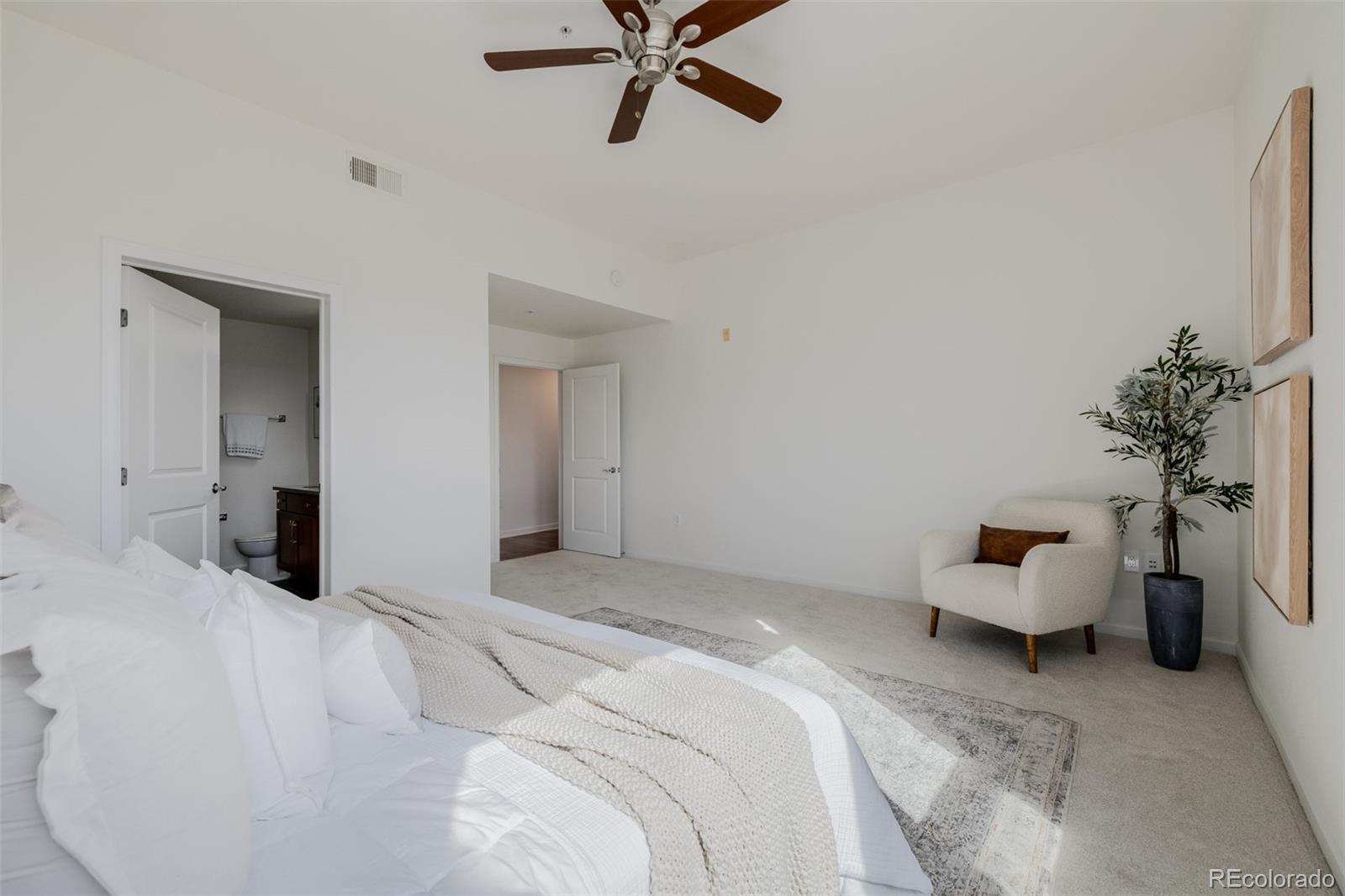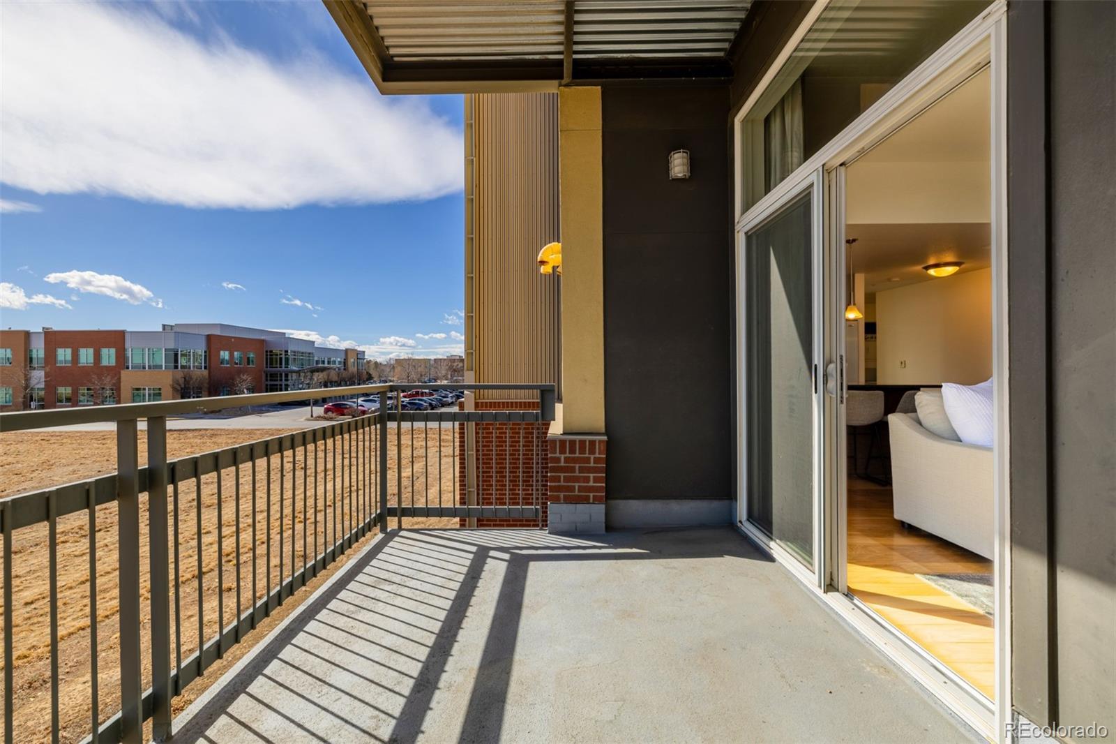 This thoughtfully updated condo in Hangar Lofts offers the perfect blend of modern design, comfort, and urban accessibility. From the moment you step inside, the scale and natural light stand out. Soaring 10-foot ceilings and oversized windows create an airy, loft-like feel, while the open floor plan allows each space to flow seamlessly into the next. Fresh interior paint and brand new carpet give the home a clean, move-in-ready finish, complemented by rich hardwood flooring that anchors the main living areas with warmth and style. The kitchen is designed for both connection and function. Expansive granite countertops provide plenty of prep space, and the oversized center island with seating naturally becomes the gathering place for casual meals or entertaining friends. The kitchen opens directly into the living and dining areas, making the entire space feel cohesive and welcoming. Natural light pours into the living room, which extends effortlessly to a private, south-facing balcony. Unlike many condo communities, this balcony enjoys rare separation from neighboring units, offering a quiet and secluded outdoor space. A spacious guest bedroom includes a walk-in closet and convenient access to a 3/4 bath, making it ideal for guests, a roommate, or a home office setup. The primary suite is complete with a luxurious five-piece bath featuring an oversized soaking tub, separate shower, and ample storage. Location is where this home truly shines. Close by you'll find Lowry Beer Garden, along with an expanding collection of neighborhood restaurants, shops, fitness options, daily conveniences and Town Center amenities, all within easy reach. Attractions like Wings Over the Rockies are minutes away, while quick access to Cherry Creek and downtown Denver keeps commuting and entertainment effortless. This home offers generous scale, thoughtful updates and a location that supports an active, connected lifestyle, all within one of Denver’s most desirable communities.
