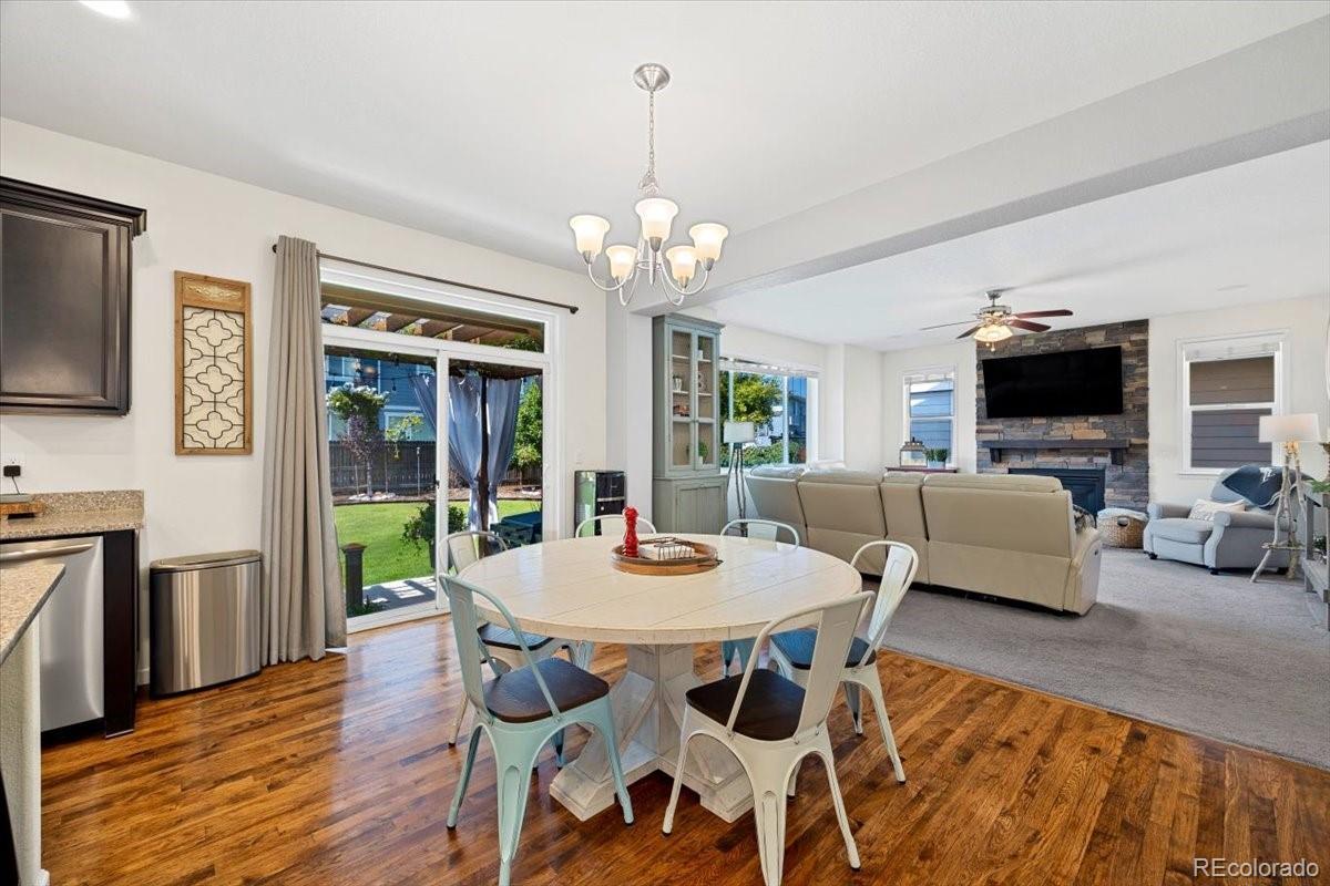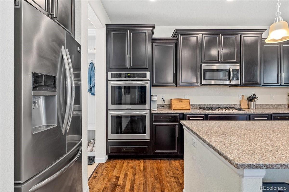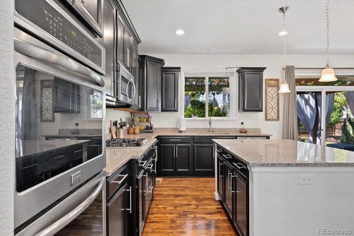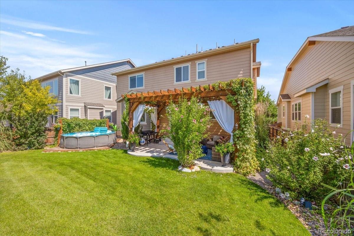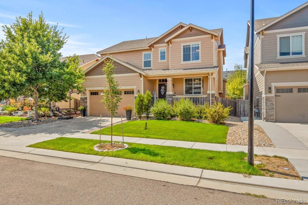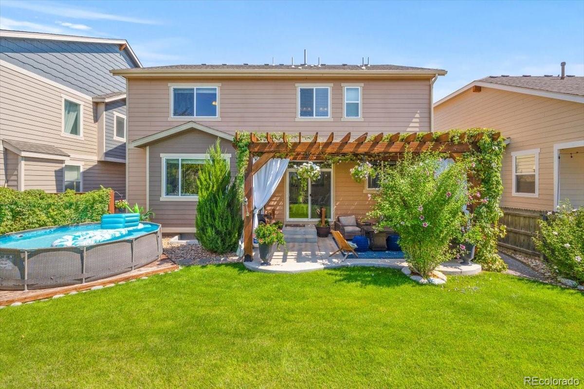 Up to $6800 or 1% of purchase price concessions available to use towards rate buydown or closing costs. Welcome Home to Buffalo Run! This immaculately maintained home shines with hardwood flooring, an open layout, and thoughtful upgrades throughout. The gourmet kitchen is a chef’s dream with dark wood cabinetry, a gas range, double ovens, and a spacious island perfect for gatherings. The sun-drenched family room features a cozy gas fireplace with a stone surround, ideal for cool Colorado evenings. Upstairs, retreat to your serene primary suite with a spa-like 5-piece bath and large walk-in closet. Two additional bedrooms, a full bath, and a versatile loft provide plenty of space for family and guests. Convenience meets style with an upper-level laundry room featuring custom cabinetry and a built-in folding area—making laundry a breeze. The fully finished basement expands your living options with a generous living space, bedroom, bathroom, and a stylish wet bar—perfect for entertaining. Step outside to your private backyard oasis with gorgeous landscaping, a pergola for shade, and a small above-ground pool for summer fun. The fenced yard also offers a large patio, built-in planters, and a sprinkler system for easy maintenance. Additional highlights include a 2-car garage with custom cabinetry and a workbench. Why build new when this home offers it all—move-in ready, beautifully upgraded, and loaded with charm—without the wait or added expense? Don’t miss your chance to make this one yours!