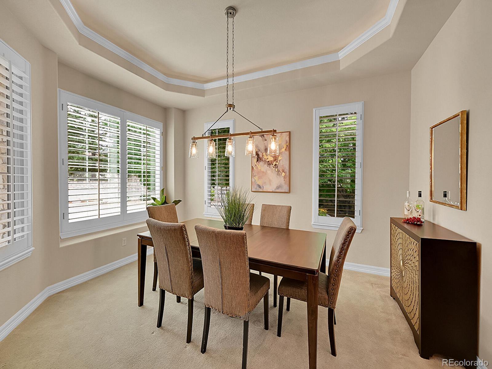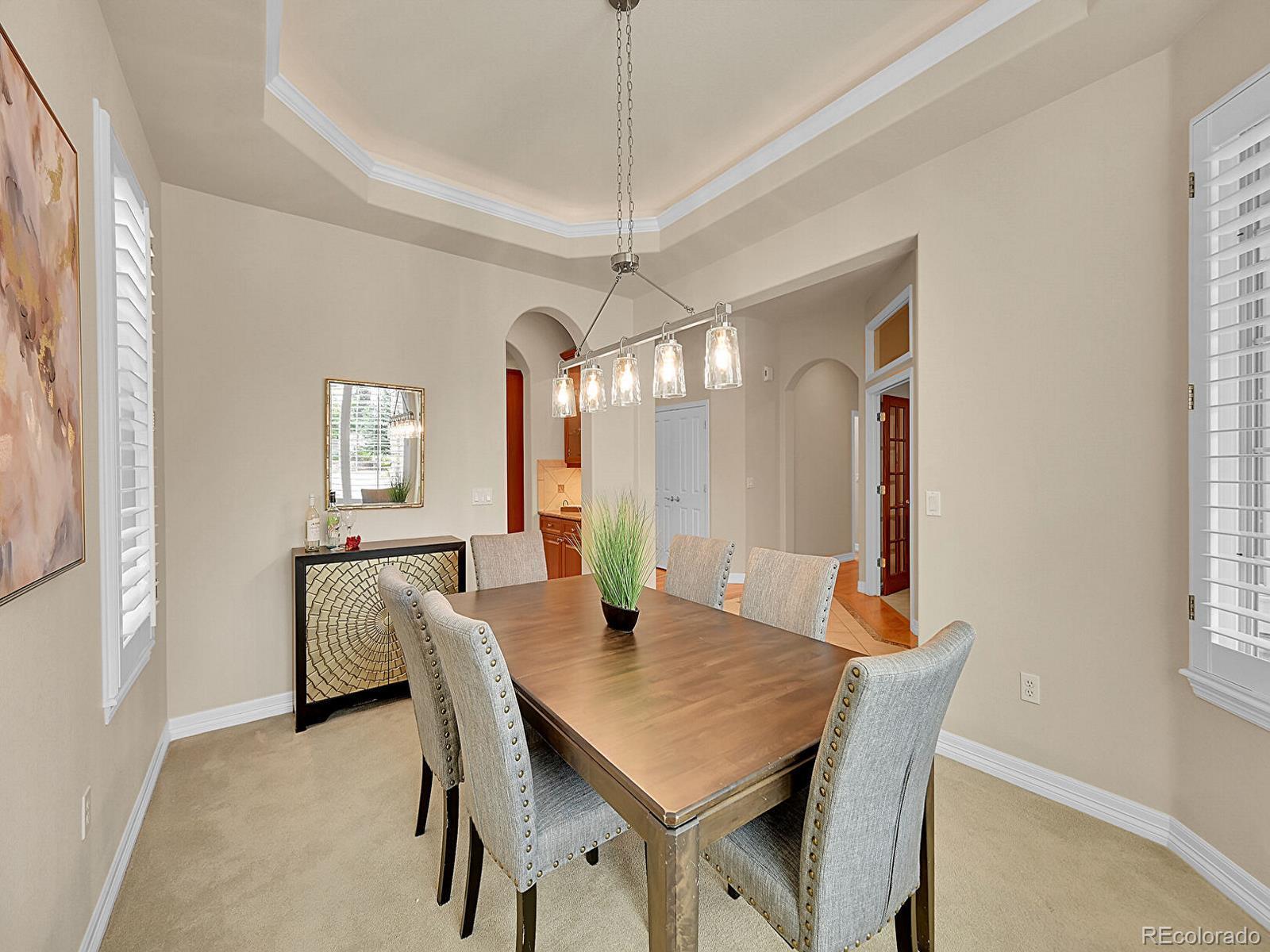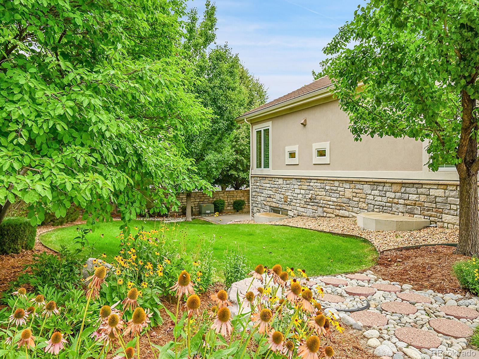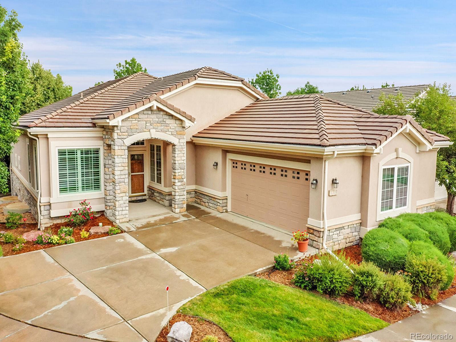 Outstanding south-facing 4-bed, 3-bath ranch with a finished garden-level basement in Windmill Reserve! Perfectly positioned on a private side-corner lot, this light-filled home offers over 4,400 sq. ft. of space with high ceilings, oversized windows, and a layout designed for main-level living and entertaining. Inside, the formal dining room features a tray ceiling and wraparound windows and connects to the kitchen via a butler’s pantry for seamless dinner service. A chef’s dream, the kitchen boasts double ovens, stainless-steel appliances, abundant wood cabinetry, spacious granite counters, and an oversized peninsula for casual dining. A spacious breakfast nook opens to the deck for effortless hosting, indoors and out. The living room offers an inviting gathering space framed by wall-to-wall arched windows and a granite laden gas fireplace. The sprawling primary suite is a private retreat, with a bay-window seating area, deck access, and a spa-inspired 5-piece bath featuring separate vanities, a jetted tub, oversized shower, and walk-in closet. A second bedroom and three-quarter bath complete the main level, along with a versatile office and an oversized laundry room. Downstairs, an expansive rec room with a wet bar offers endless possibilities—game nights, movie marathons, or a home gym. Plus, two generous bedrooms and a three-quarter bath create a private space perfect for guests or multigenerational living, while unfinished basement storage and an oversized 2-car garage allow plenty of space for seasonal décor and hobby gear. Outside, enjoy a green lawn, blooming florals, upper deck, and patio ideal for sunny afternoons. Enjoy abundant guest parking, a rare perk of the home’s sought-after side-corner lot! Step out the front door to the Colorado Front Range Trail for a walk to Cherry Creek State Park, play a round at nearby Valley Country Club, or explore elite dining and shopping at Park Meadows Mall and the heart of DTC just 15 minutes away.