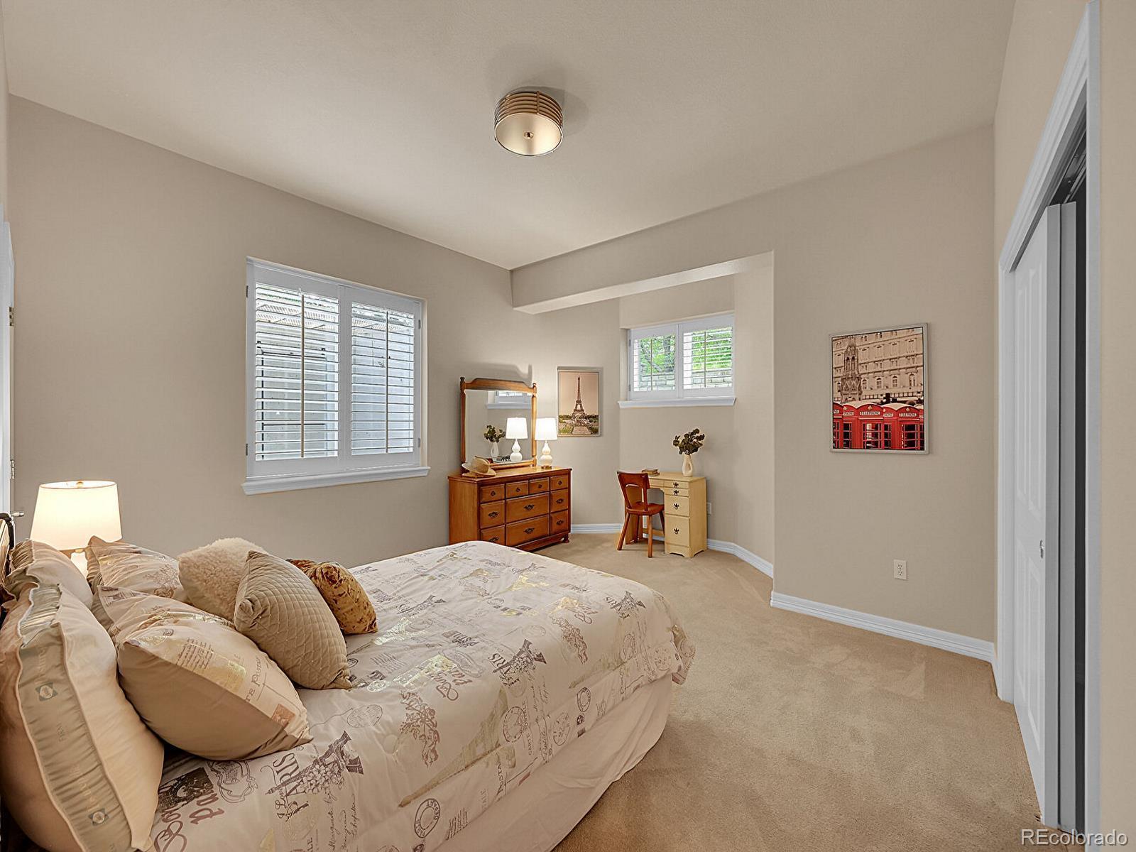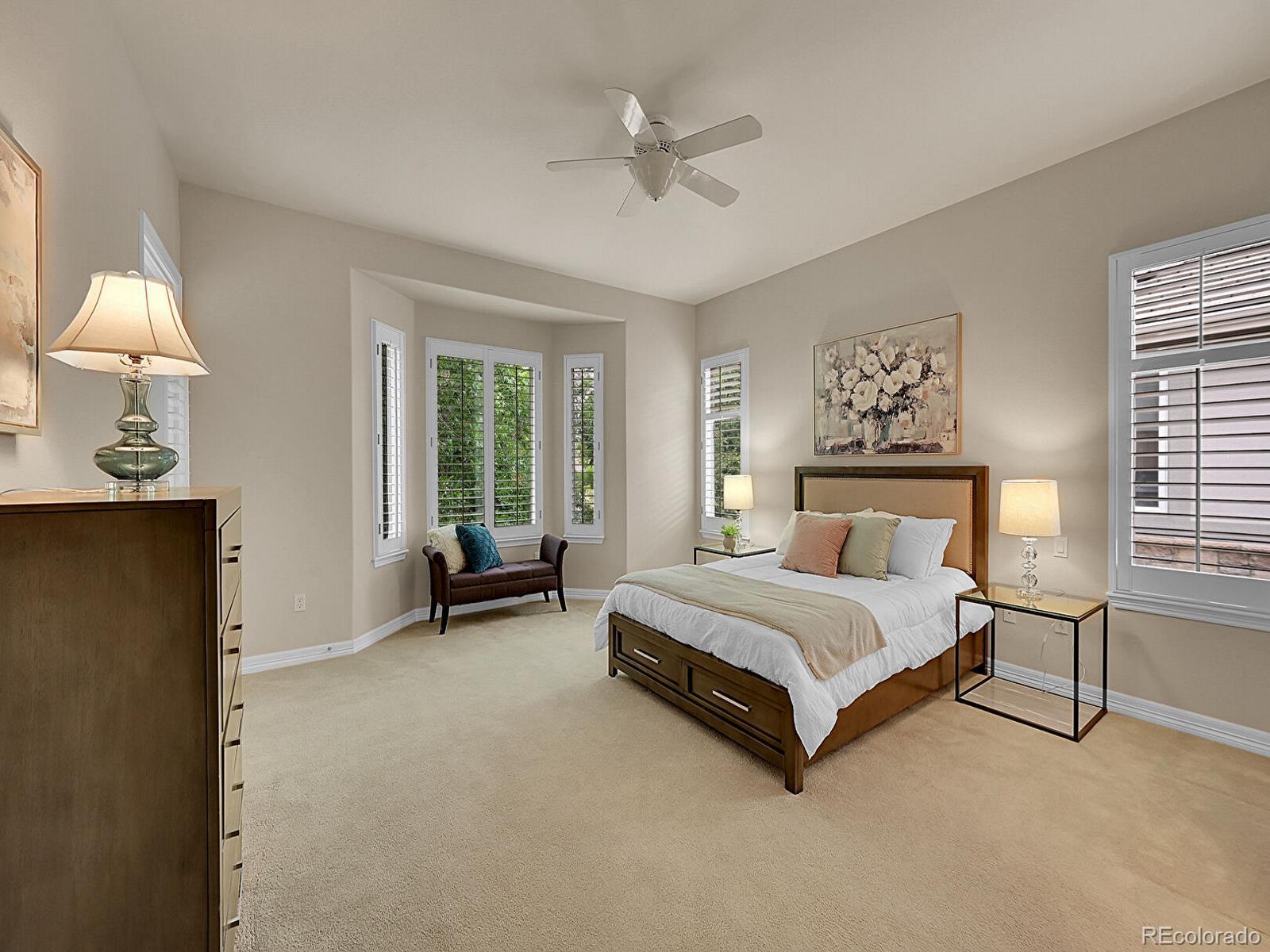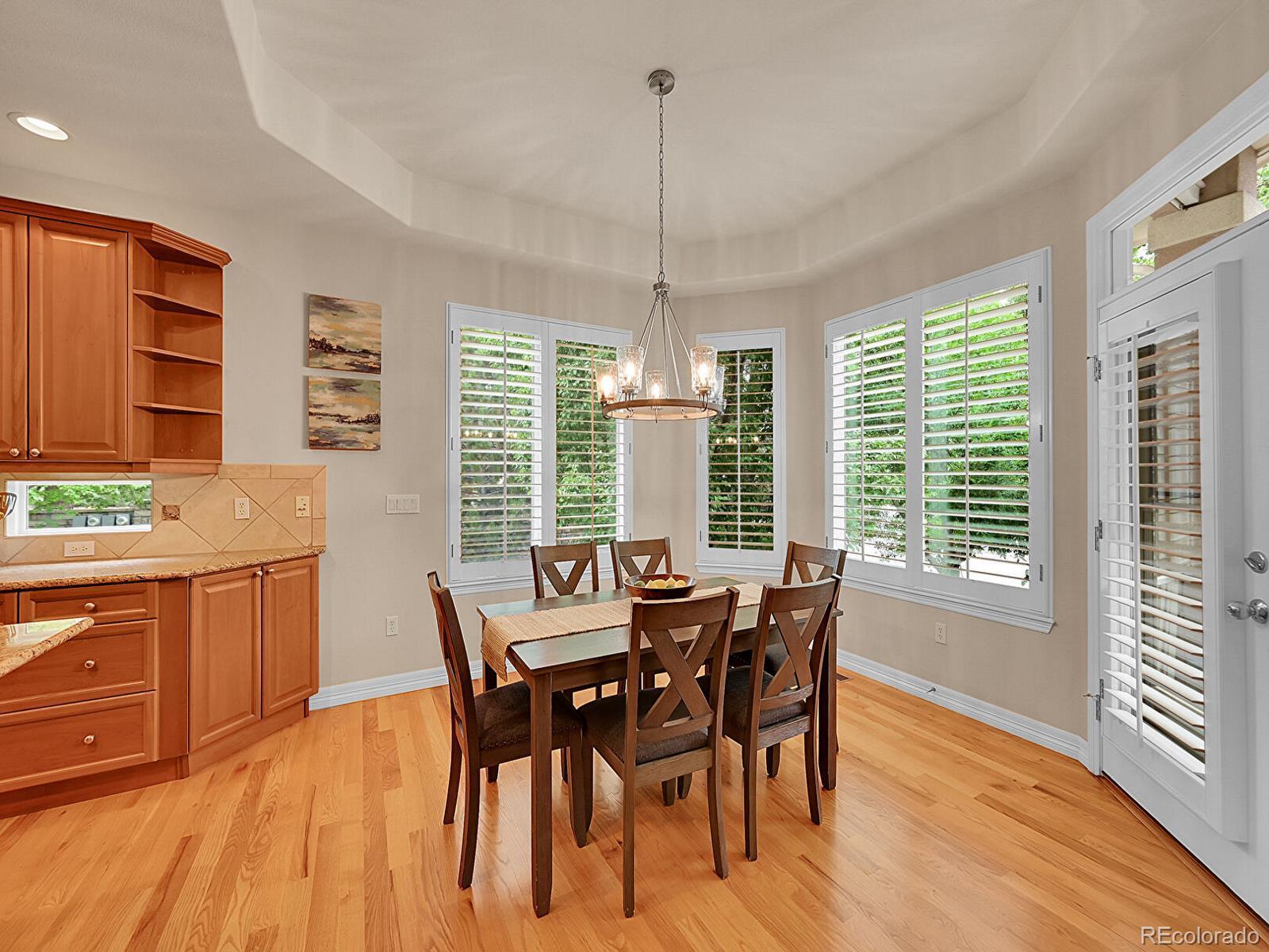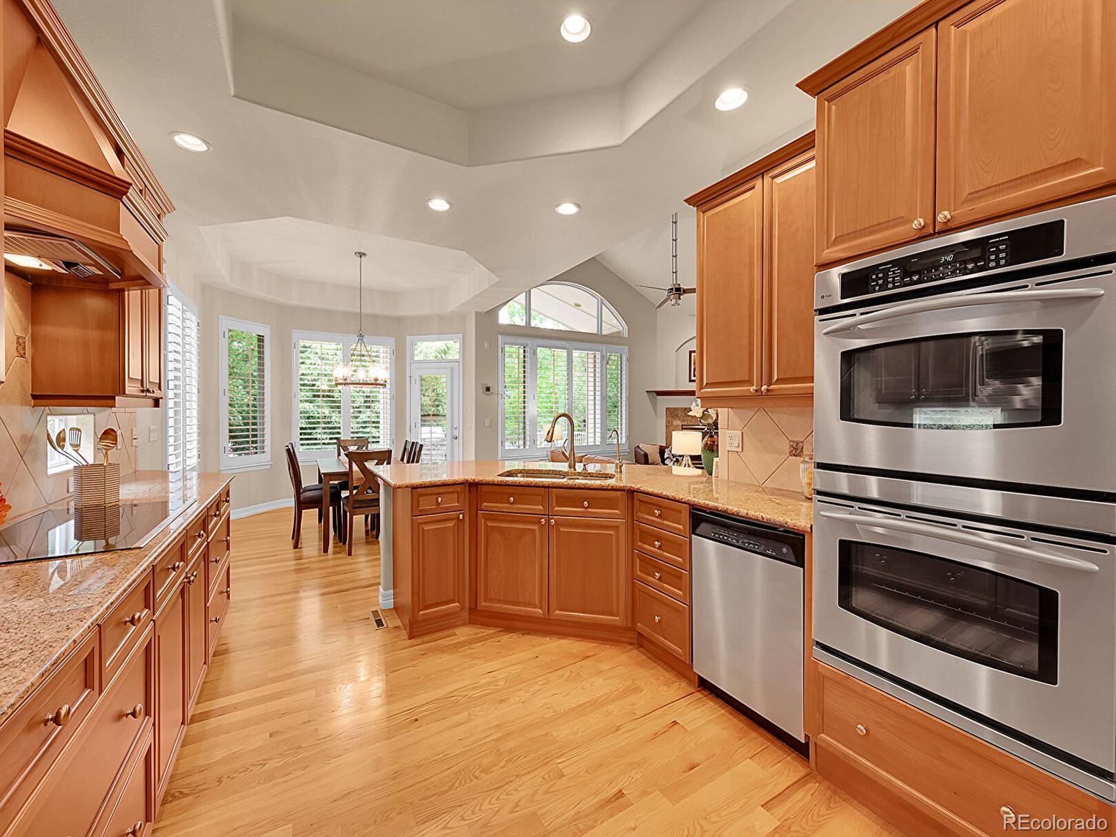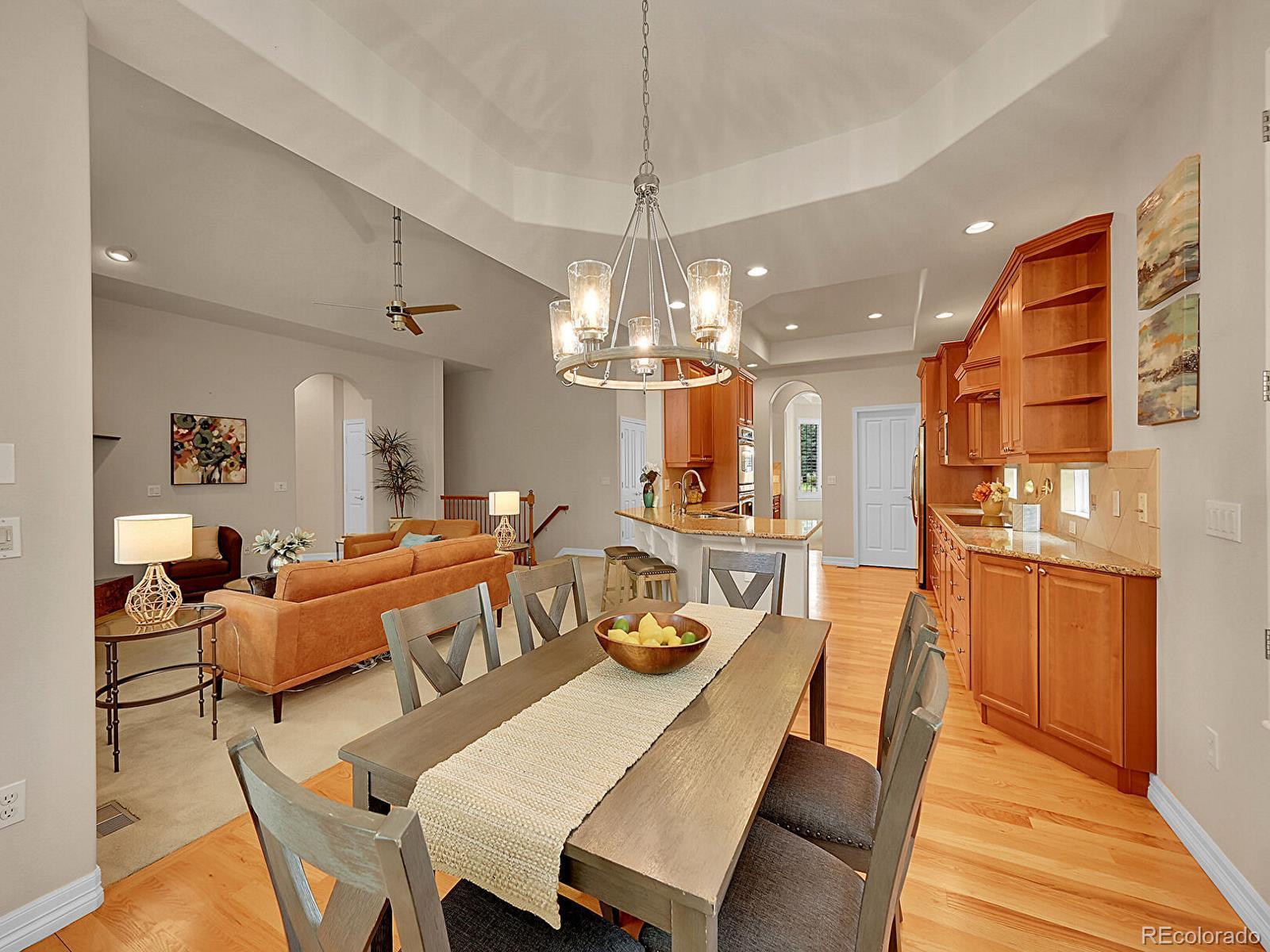 Outstanding south-facing 4-bed, 3-bath ranch with a finished garden-level basement in Windmill Reserve! Perfectly positioned on a private side-corner lot, this light-filled home offers over 4,400 sq. ft. of space with high ceilings, oversized windows, and a layout designed for main-level living and entertaining. Inside, the formal dining room features a tray ceiling and wraparound windows and connects to the kitchen via a butler’s pantry for seamless dinner service. A chef’s dream, the kitchen boasts double ovens, stainless-steel appliances, abundant wood cabinetry, spacious granite counters, and an oversized peninsula for casual dining. A spacious breakfast nook opens to the deck for effortless hosting, indoors and out. The living room offers an inviting gathering space framed by wall-to-wall arched windows and a granite laden gas fireplace. The sprawling primary suite is a private retreat, with a bay-window seating area, deck access, and a spa-inspired 5-piece bath featuring separate vanities, a jetted tub, oversized shower, and walk-in closet. A second bedroom and three-quarter bath complete the main level, along with a versatile office and an oversized laundry room. Downstairs, an expansive rec room with a wet bar offers endless possibilities—game nights, movie marathons, or a home gym. Plus, two generous bedrooms and a three-quarter bath create a private space perfect for guests or multigenerational living, while unfinished basement storage and an oversized 2-car garage allow plenty of space for seasonal décor and hobby gear. Outside, enjoy a green lawn, blooming florals, upper deck, and patio ideal for sunny afternoons. Enjoy abundant guest parking, a rare perk of the home’s sought-after side-corner lot! Step out the front door to the Colorado Front Range Trail for a walk to Cherry Creek State Park, play a round at nearby Valley Country Club, or explore elite dining and shopping at Park Meadows Mall and the heart of DTC just 15 minutes away.