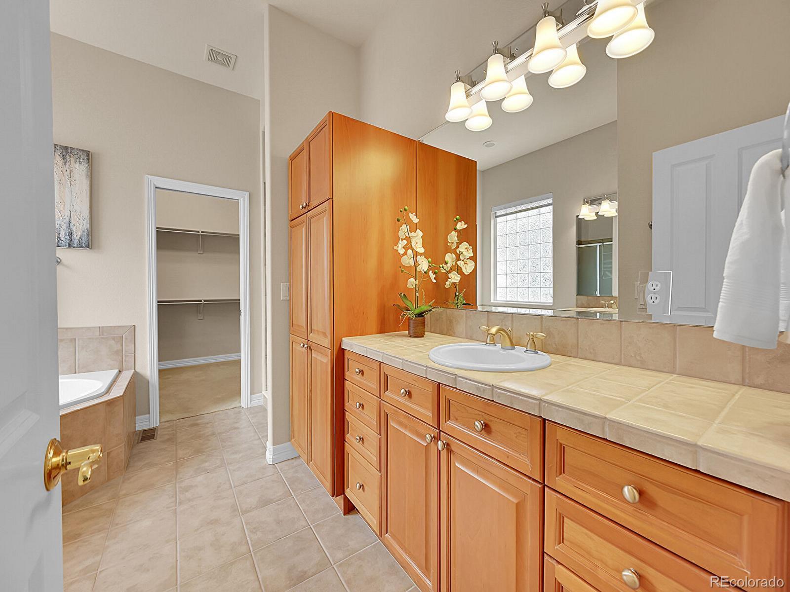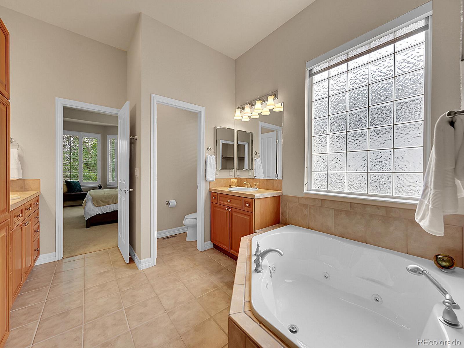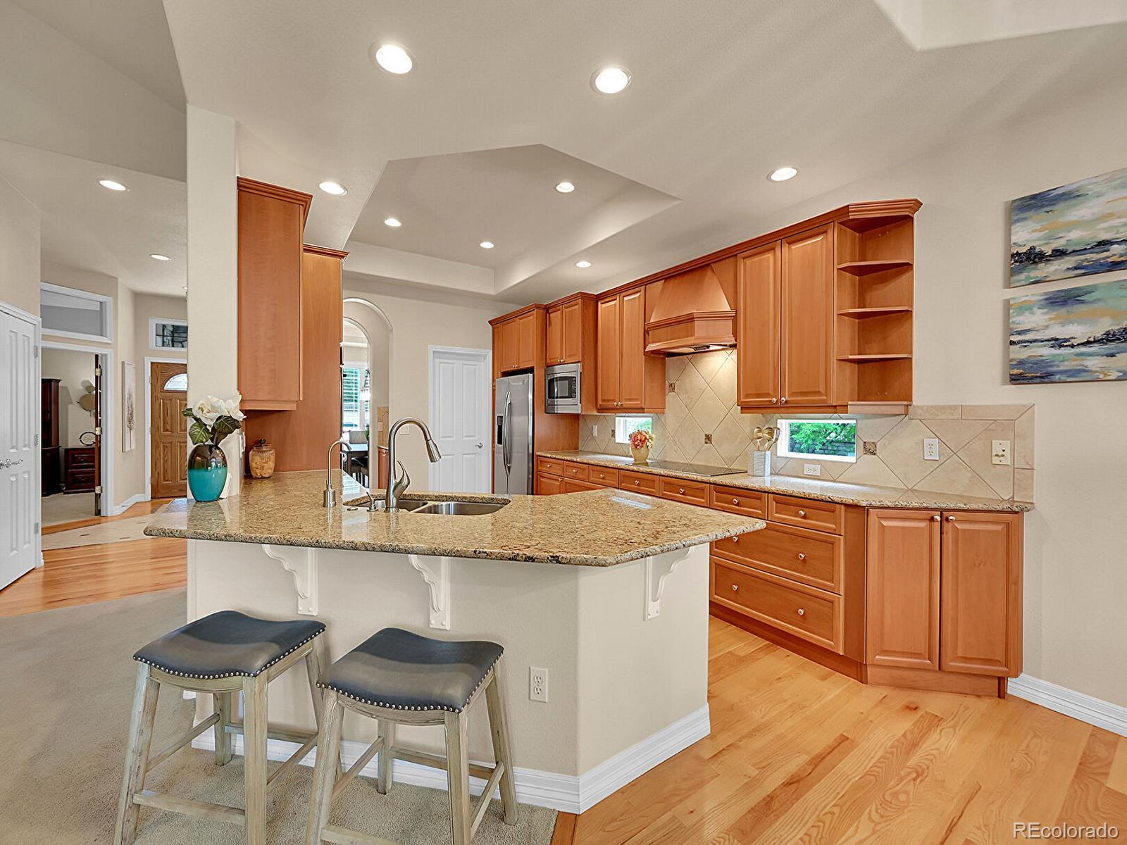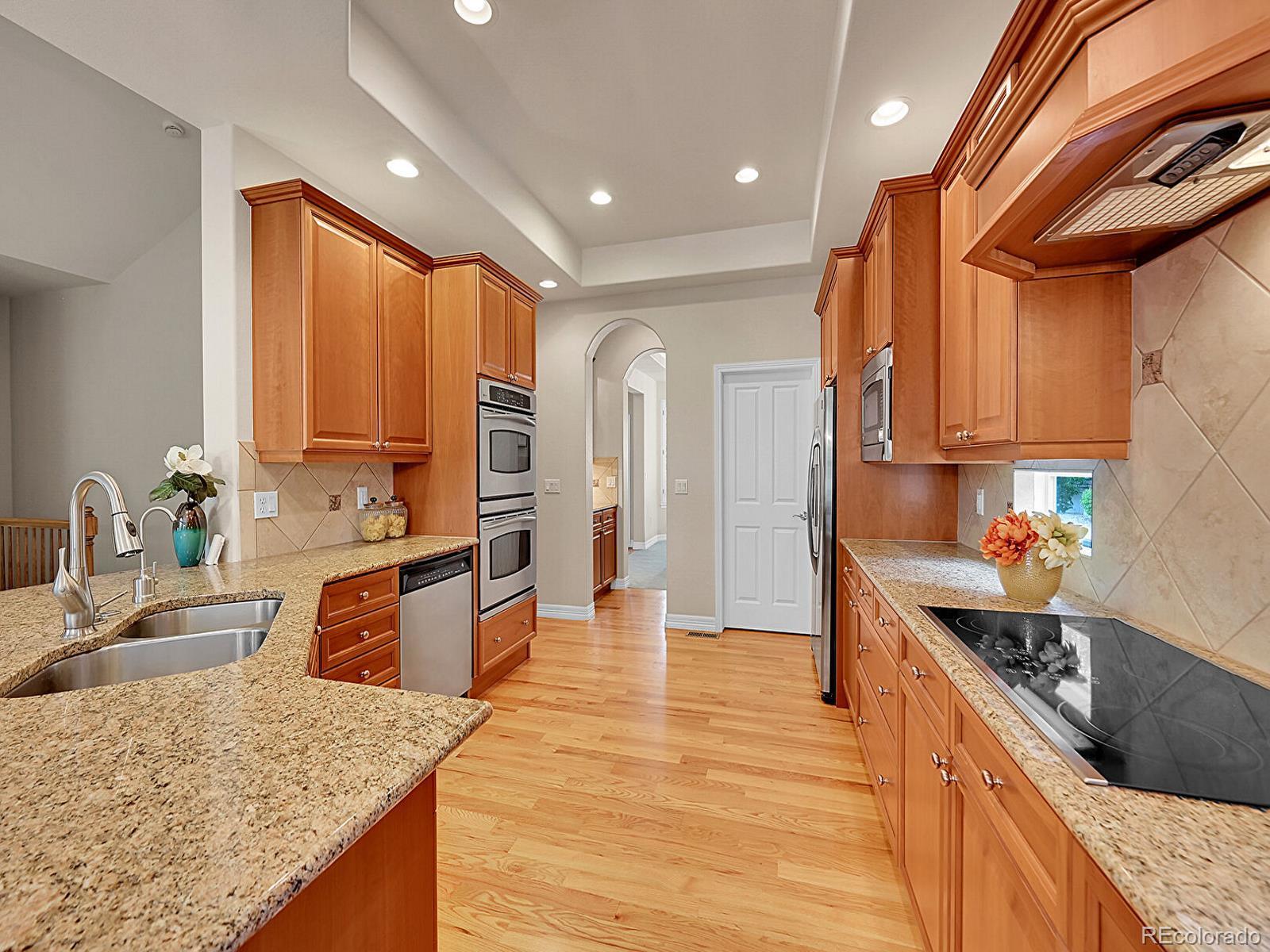 Outstanding south-facing 4-bed, 3-bath ranch with a finished garden-level basement in Windmill Reserve! Perfectly positioned on a private side-corner lot, this light-filled home offers over 4,400 sq. ft. of space with high ceilings, oversized windows, and a layout designed for main-level living and entertaining. Inside, the formal dining room features a tray ceiling and wraparound windows and connects to the kitchen via a butler’s pantry for seamless dinner service. A chef’s dream, the kitchen boasts double ovens, stainless-steel appliances, abundant wood cabinetry, spacious granite counters, and an oversized peninsula for casual dining. A spacious breakfast nook opens to the deck for effortless hosting, indoors and out. The living room offers an inviting gathering space framed by wall-to-wall arched windows and a granite laden gas fireplace. The sprawling primary suite is a private retreat, with a bay-window seating area, deck access, and a spa-inspired 5-piece bath featuring separate vanities, a jetted tub, oversized shower, and walk-in closet. A second bedroom and three-quarter bath complete the main level, along with a versatile office and an oversized laundry room. Downstairs, an expansive rec room with a wet bar offers endless possibilities—game nights, movie marathons, or a home gym. Plus, two generous bedrooms and a three-quarter bath create a private space perfect for guests or multigenerational living, while unfinished basement storage and an oversized 2-car garage allow plenty of space for seasonal décor and hobby gear. Outside, enjoy a green lawn, blooming florals, upper deck, and patio ideal for sunny afternoons. Enjoy abundant guest parking, a rare perk of the home’s sought-after side-corner lot! Step out the front door to the Colorado Front Range Trail for a walk to Cherry Creek State Park, play a round at nearby Valley Country Club, or explore elite dining and shopping at Park Meadows Mall and the heart of DTC just 15 minutes away.