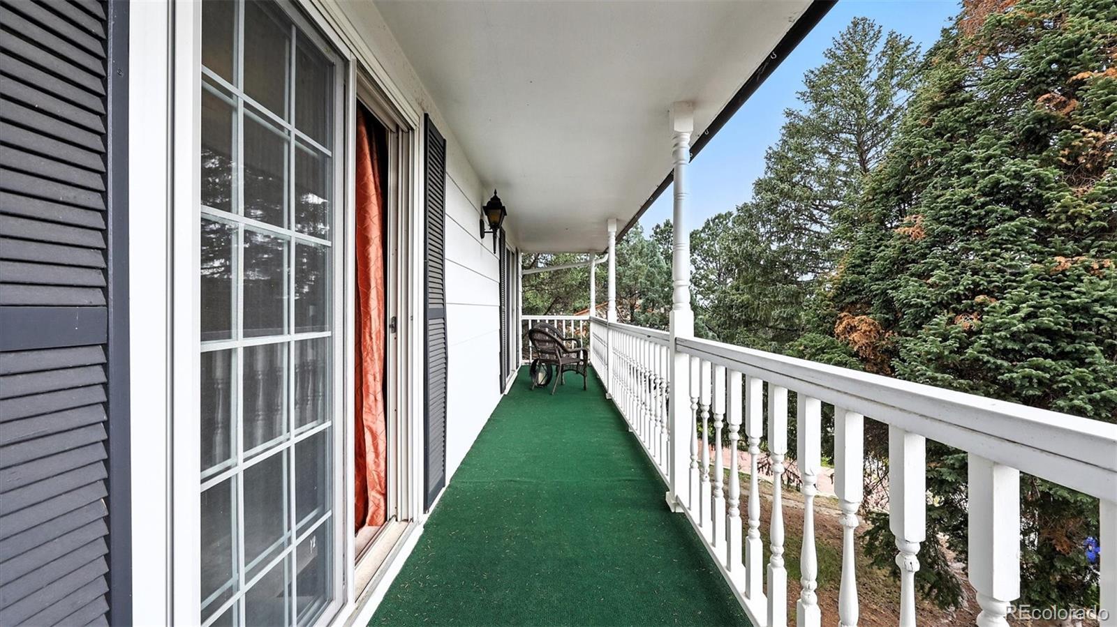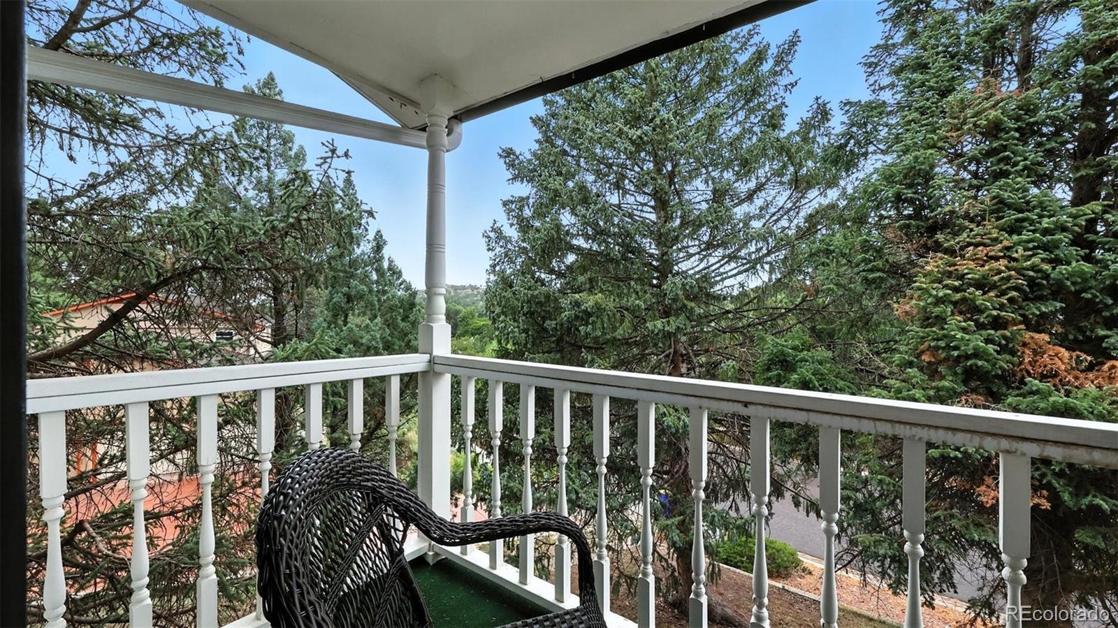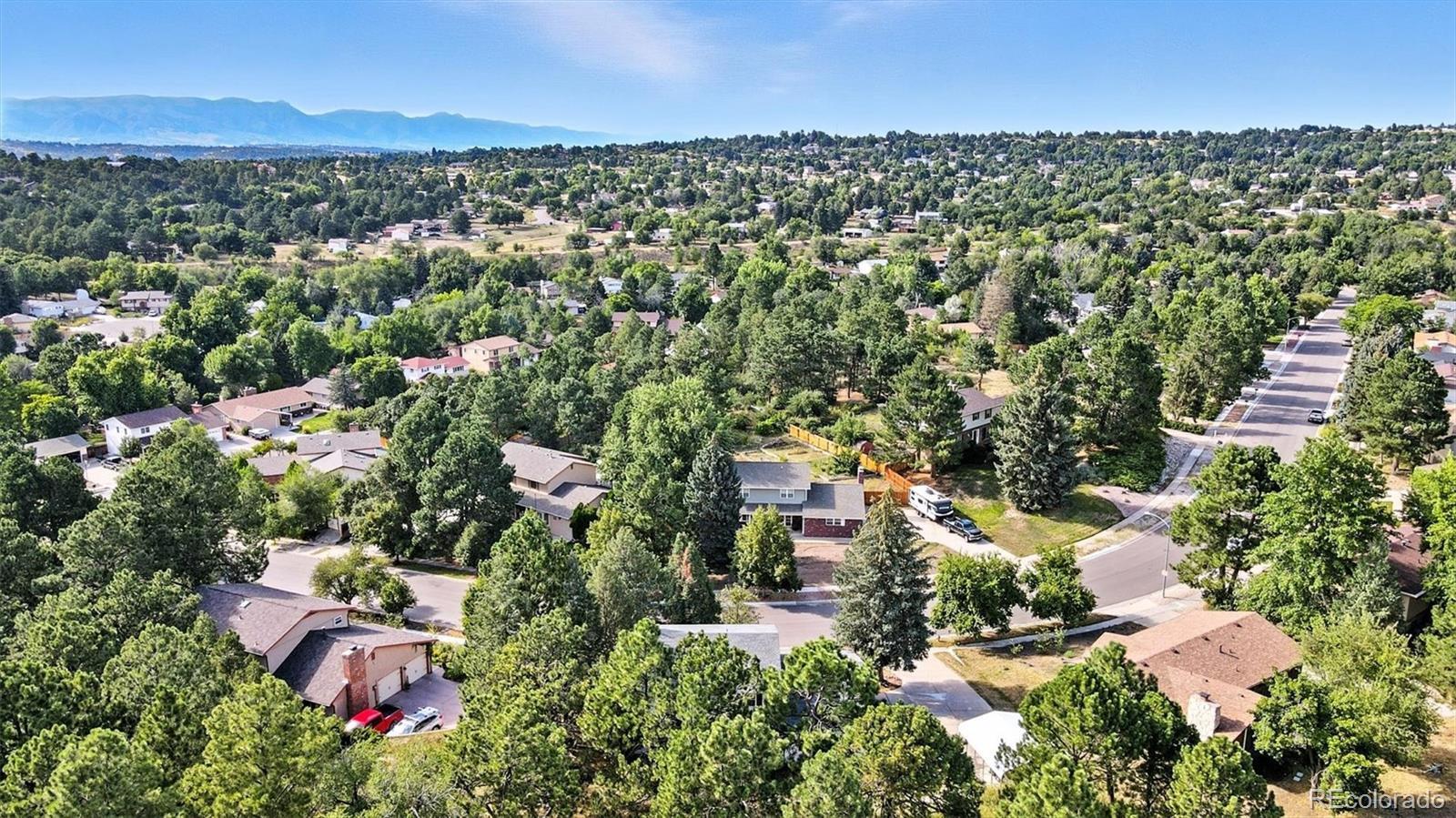 Inviting 5BR, 3.5BA home nestled in the desirable Rustic Hills neighborhood of Colorado Springs. Situated on a generous 0.57-acre treed lot, this 2-story residence with a finished basement offers privacy, tranquility, & room to grow. Mature trees & lush green shrubs surround the property, creating a serene outdoor retreat. Step inside through double doors into a tiled entryway with a coat closet, leading to a bright & airy living room featuring neutral carpet & a bay window. The formal dining room boasts hardwood floors, a lighted ceiling fan, & bay window with picturesque backyard views, perfect for entertaining. The adjacent eat-in kitchen incl tile flooring, wood cabinetry, & modern appliances incl a new smooth-top range oven, microwave, dishwasher, & side-by-side refrigerator. A cozy breakfast nook opens to the backyard patio, ideal for BBQs & relaxation. The step-down family room exudes warmth with hardwood floors, wood-paneled walls, built-in shelving, a bay window, & a wood-burning fireplace with brick surround. A convenient powder room & garage access complete the main level. Upstairs, you'll find 3 spacious BRs with lighted ceiling fans & neutral carpet. The primary suite is a true retreat with a sitting area, double closets, & private access to a covered balcony, perfect for enjoying morning coffee & evening sunsets. The en-suite bathroom has a tiled shower & vanity. BR#2 also offers balcony access & a walk-in closet. A full hall bath serves the addtl BRs. The finished basement incl a large family room, laundry area with washer & dryer, 2 addtl BRs, one ideal as a home office with built-in desk & shelving, & a shower bathroom. Outside, enjoy a beautifully landscaped backyard with a concrete & brick patio, walkway, & storage shed. The oversized 2-car garage & extended driveway with covered canopy provides ample space for a small boat & addtl off-street parking. Located minutes from schools, parks, shopping, & an easy commute to Peterson Space Force Base.