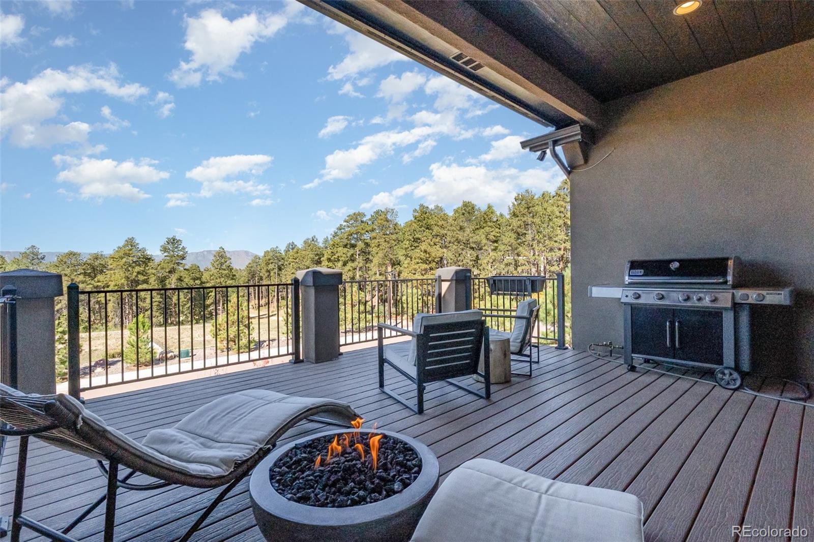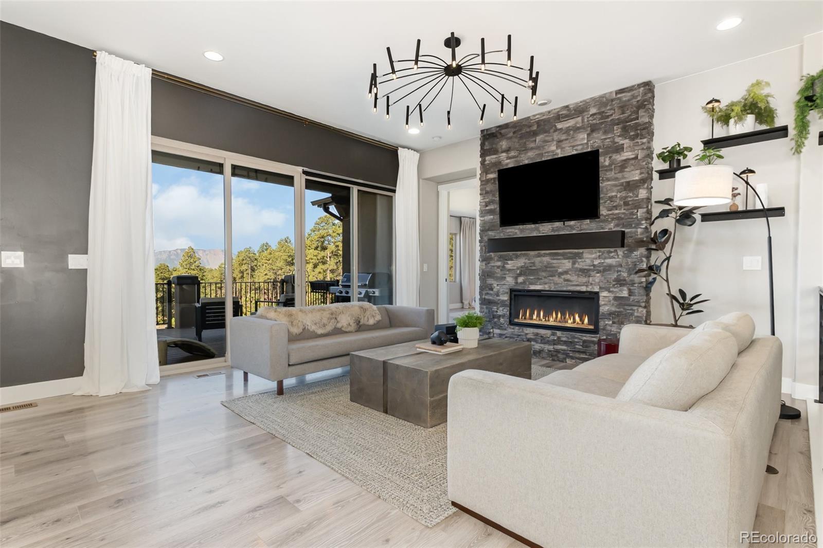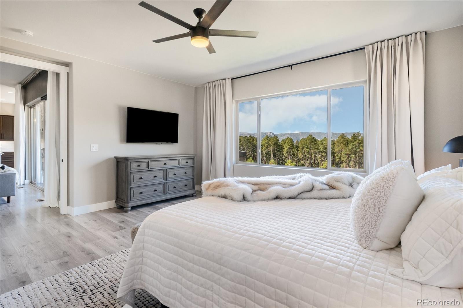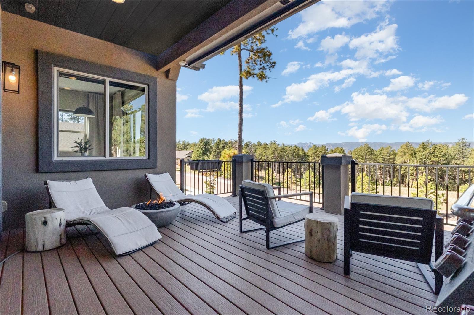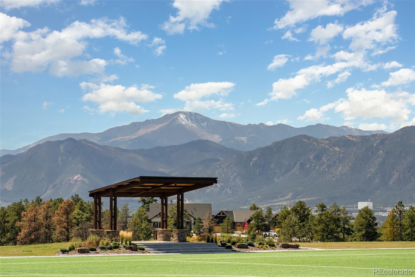 Welcome to one of the most coveted lots in the prestigious Sanctuary Pointe community—where luxury meets nature in breathtaking harmony. Perched above open space and scenic trails with unobstructed views of Pikes Peak, this expanded Classic Paradise model is a masterclass in refined Colorado living! Versatile layout with the master on the main floor and Junior suite in basement, ideal for guests or multi-generational living! Hand-troweled walls, tall baseboards, and chic black-accented finishes throughout. Custom glass slider doors in dining/study for flexible use. Modern railing, designer light fixtures, and gorgeous contemporary fireplace! The fantastic kitchen features cherry cabinetry, quartz countertops, pantry and KitchenAid appliances! Serene Master retreat with views of Pikes Peak and soothing waterfall sounds from neighboring water feature and walkout to large composite deck! Laundry room conveniently located on main! TV hookups in all bedrooms and walk-in closets for optimal organization. Basement features 9-foot ceilings and walk-out access to covered patio with hot tub! Wet bar with full-size fridge, dishwasher space, and custom barn door shelving. Custom carpet, organized closet space, and radon mitigation system. Custom landscaping with split rail fencing, extended patio and fire pit! Trail system directly across the street and regular snow plowing for convenience Located along the AFA flight path—enjoy thrilling Thunderbird flyovers! Vibrant neighborhood with food trucks, soccer games, hiking, clubs, and seasonal picnics. Close proximity to Fox Run trails and natural beauty This home is a rare blend of style, serenity, and sophistication—offering privacy, versatility, and modern luxury in one of Colorado’s most desirable enclaves. Whether you're hosting under the stars or enjoying quiet mornings with mountain views, this Sanctuary Pointe gem is truly a dream come true and waiting for you!