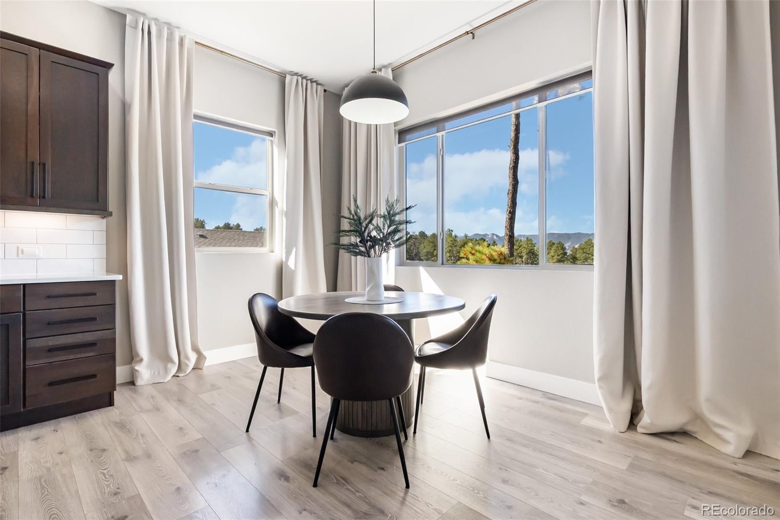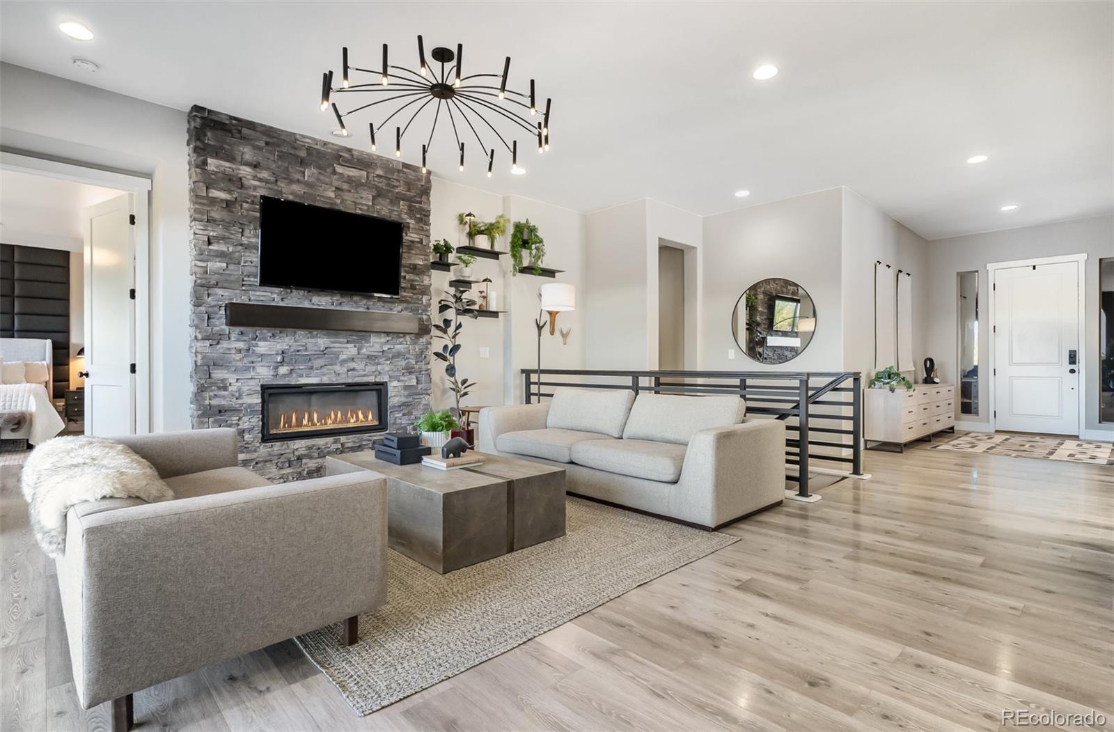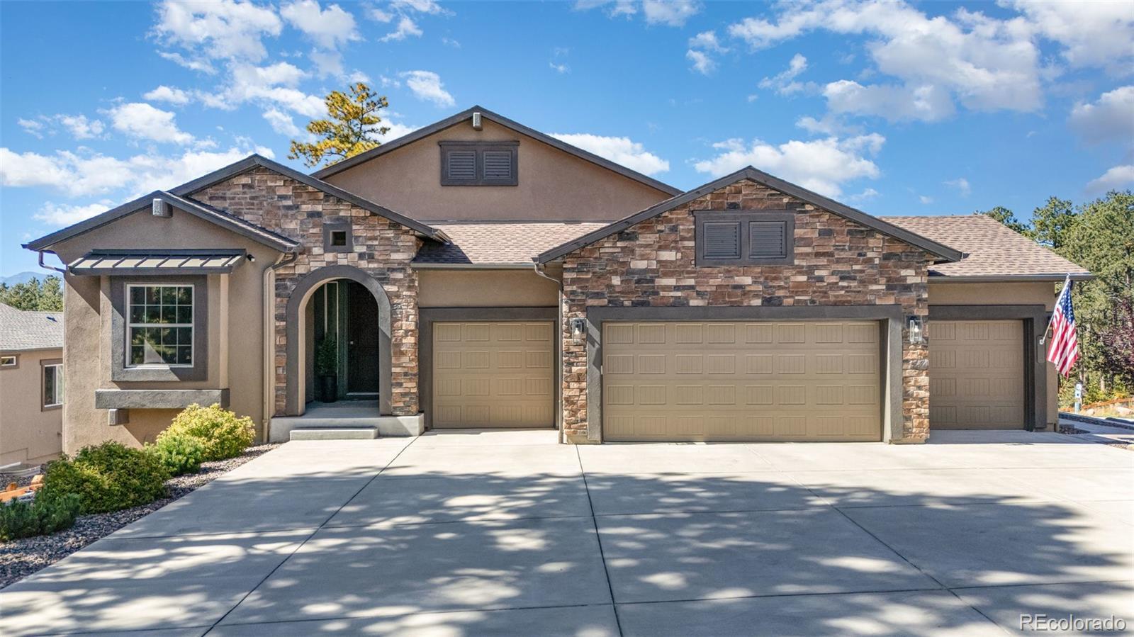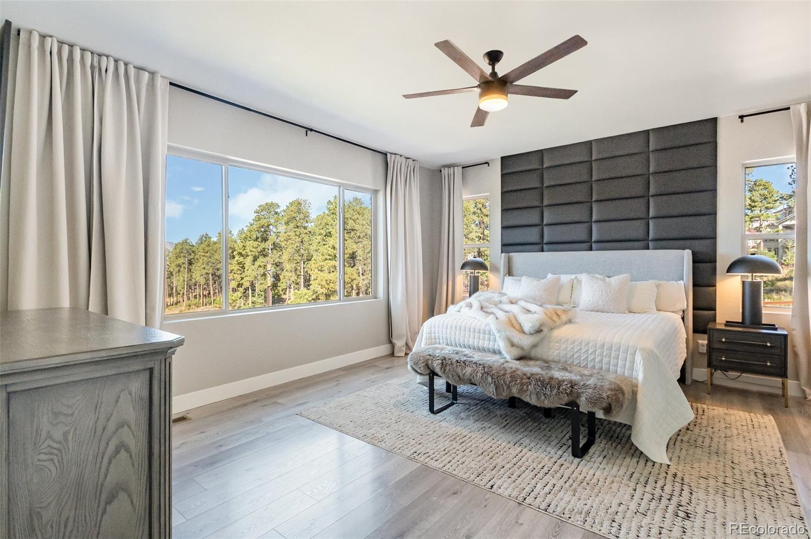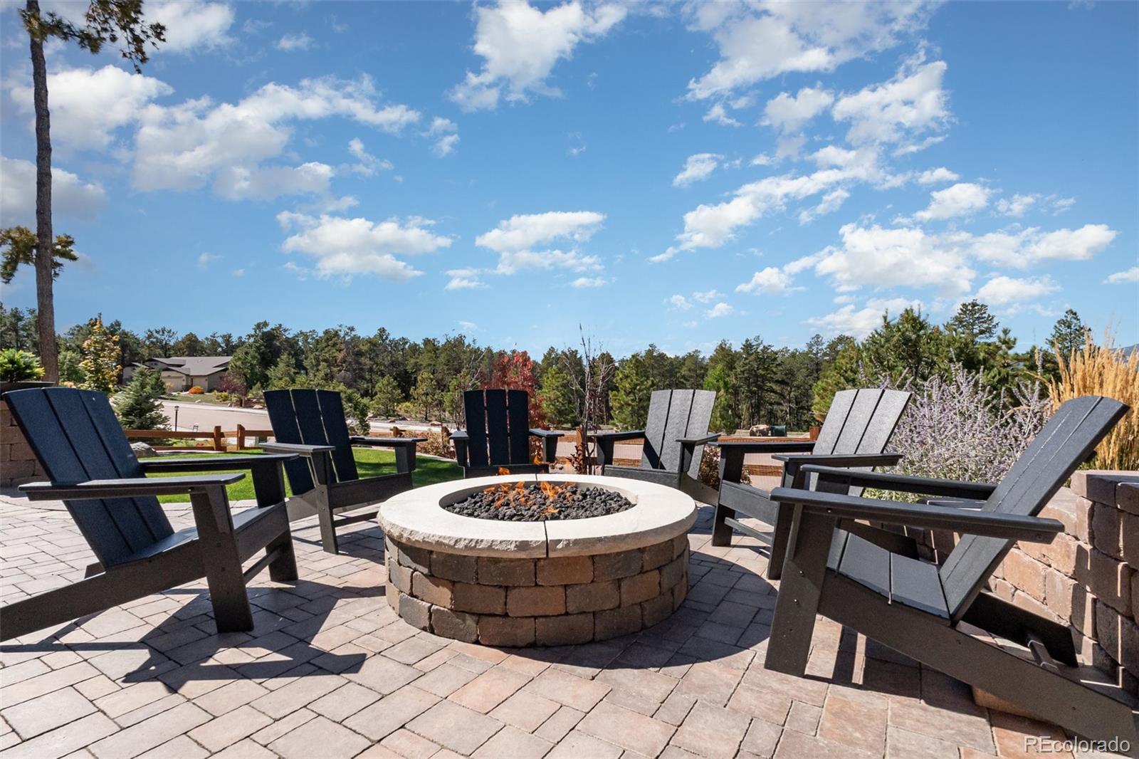 Welcome to one of the most coveted lots in the prestigious Sanctuary Pointe community—where luxury meets nature in breathtaking harmony. Perched above open space and scenic trails with unobstructed views of Pikes Peak, this expanded Classic Paradise model is a masterclass in refined Colorado living! Versatile layout with the master on the main floor and Junior suite in basement, ideal for guests or multi-generational living! Hand-troweled walls, tall baseboards, and chic black-accented finishes throughout. Custom glass slider doors in dining/study for flexible use. Modern railing, designer light fixtures, and gorgeous contemporary fireplace! The fantastic kitchen features cherry cabinetry, quartz countertops, pantry and KitchenAid appliances! Serene Master retreat with views of Pikes Peak and soothing waterfall sounds from neighboring water feature and walkout to large composite deck! Laundry room conveniently located on main! TV hookups in all bedrooms and walk-in closets for optimal organization. Basement features 9-foot ceilings and walk-out access to covered patio with hot tub! Wet bar with full-size fridge, dishwasher space, and custom barn door shelving. Custom carpet, organized closet space, and radon mitigation system. Custom landscaping with split rail fencing, extended patio and fire pit! Trail system directly across the street and regular snow plowing for convenience Located along the AFA flight path—enjoy thrilling Thunderbird flyovers! Vibrant neighborhood with food trucks, soccer games, hiking, clubs, and seasonal picnics. Close proximity to Fox Run trails and natural beauty This home is a rare blend of style, serenity, and sophistication—offering privacy, versatility, and modern luxury in one of Colorado’s most desirable enclaves. Whether you're hosting under the stars or enjoying quiet mornings with mountain views, this Sanctuary Pointe gem is truly a dream come true and waiting for you!