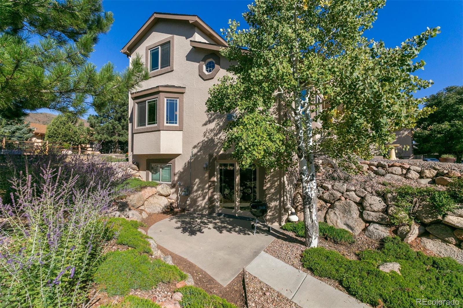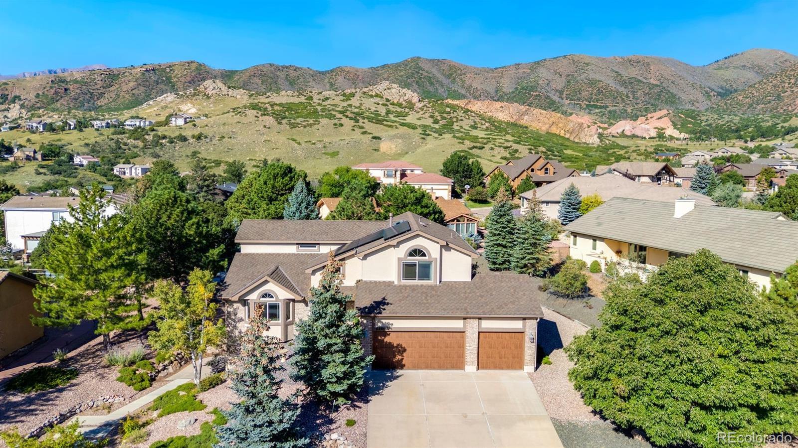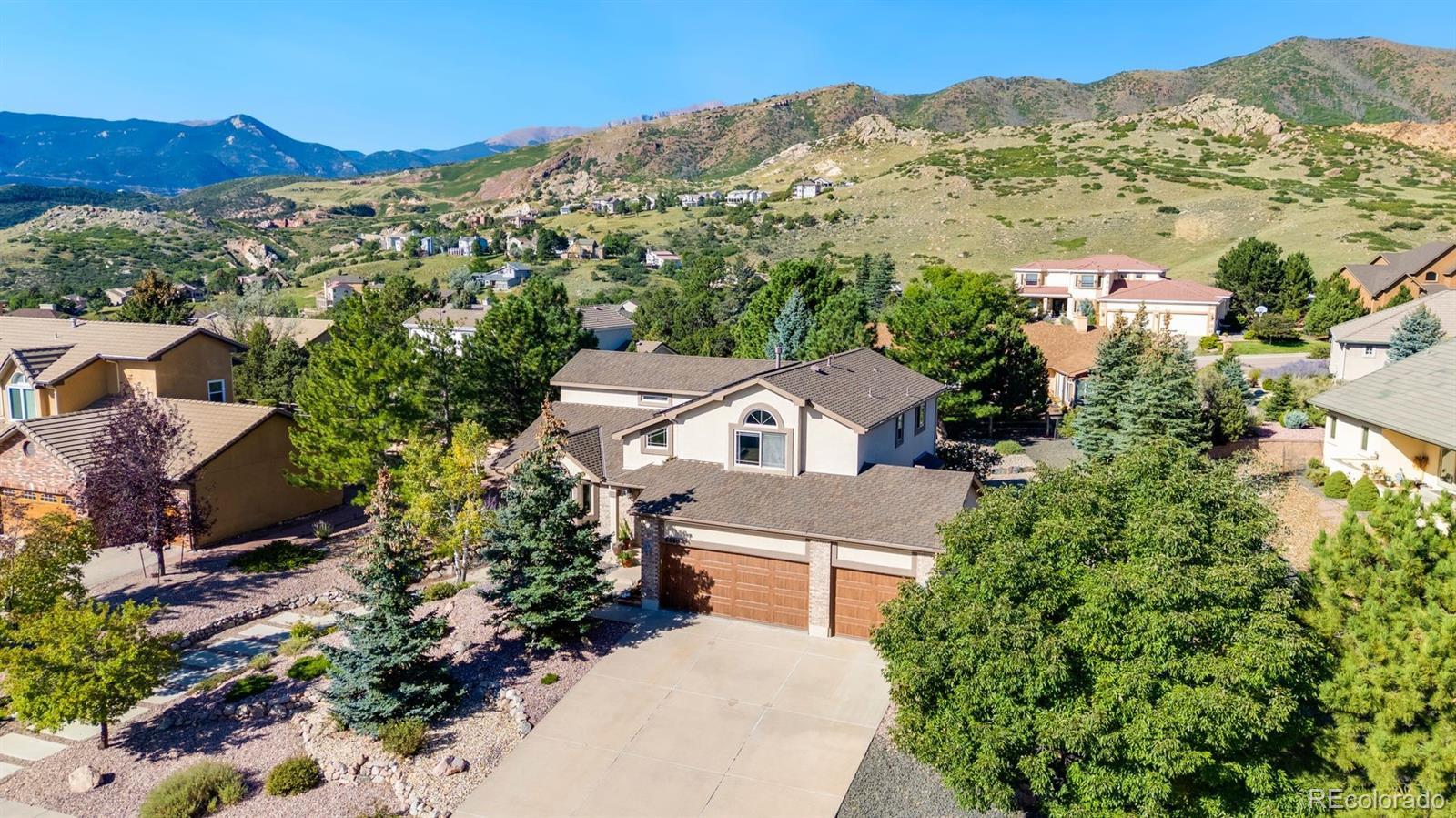 The One for Sophistication. Extensively remodeled with premium craftsmanship and enduring materials throughout. Genuine white oak hardwoods span the main and upper levels, matched by engineered planks on the stairs and lower level for a seamless, modern aesthetic. Every room reflects thoughtful updates—vinyl Milgard windows, wood trim, fresh finishes, and cohesive detail. The redesigned entry features a striking staircase with horizontal metal railings rising to the two-story living room, where a soapstone-surround gas fireplace with custom prairie art tile and floating bookshelves create a functional focal point. The remodeled kitchen centers on a two-level soapstone island, hickory cabinetry, stainless steel LG gas range with ducted hood, floating shelves, and rich soapstone accents. The adjacent family room includes a second fireplace and opens to a backyard designed with premium xeriscaping, raised garden beds, and a gas fire feature framed in stone. The vaulted primary suite offers picture-window views of Ute Valley Park, and evening city lights. The complementing en suite includes a remodeled bath with a stylish clawfoot tub, & frameless glass shower with custom tile. Three upper bedrooms share a full bath, and each bedroom has their own unique westerly views, be it rock formations or the shoulder of Pike's Peak. The basement includes a bright recreation room with walkout access, granite wet bar, and guest suite. Paid-off Solar Panels keep utility costs efficient, and the stucco exterior provides enduring style and value. The finished three-car garage with 200-amp service and two 220V outlets offers ample storage and organization. Set on a quiet cul-de-sac in Colorado Springs’ established Mountain Shadows community, this home offers no HOA dues, sweeping views, and a location minutes from Garden of the Gods, Ute Valley Park, and the Air Force Academy. Colorado Springs District 11 schools. Passionate refinement meets everyday function. Elevate your lifestyle.