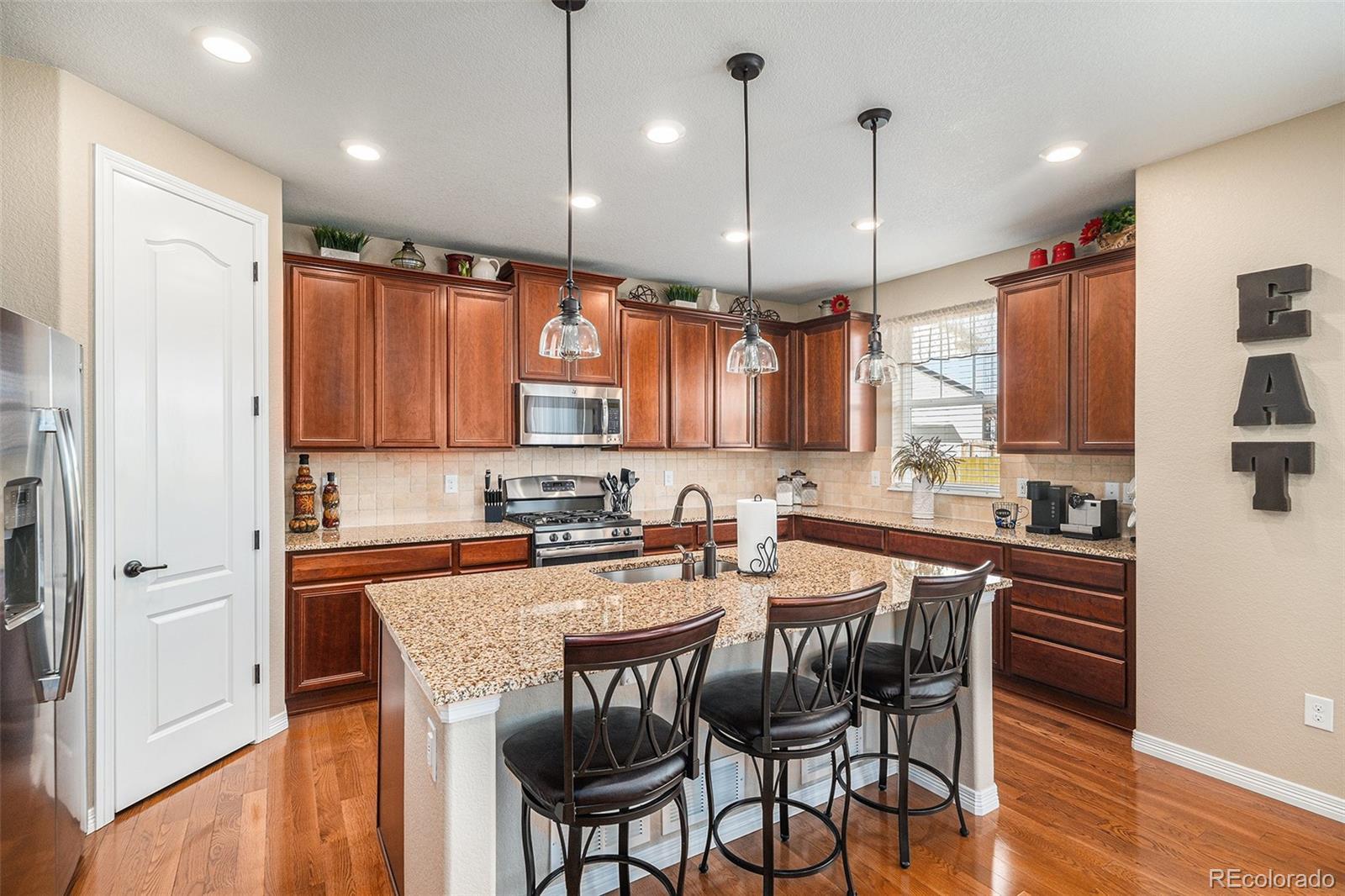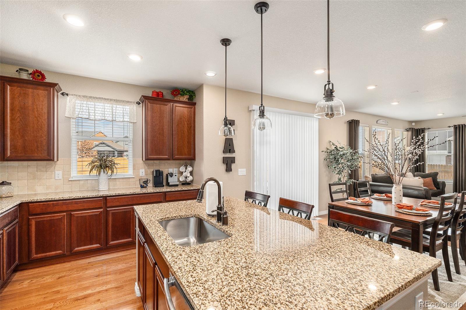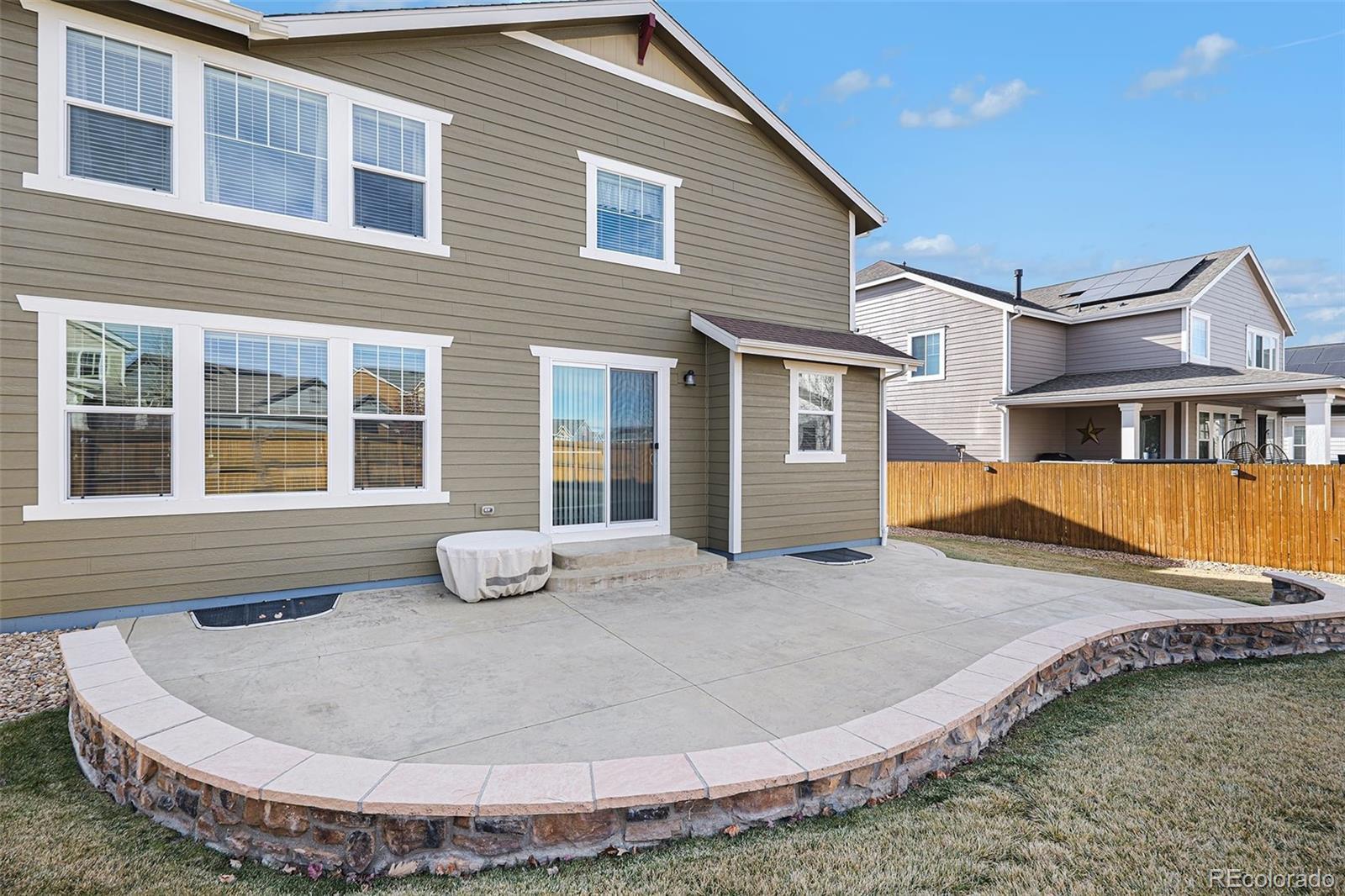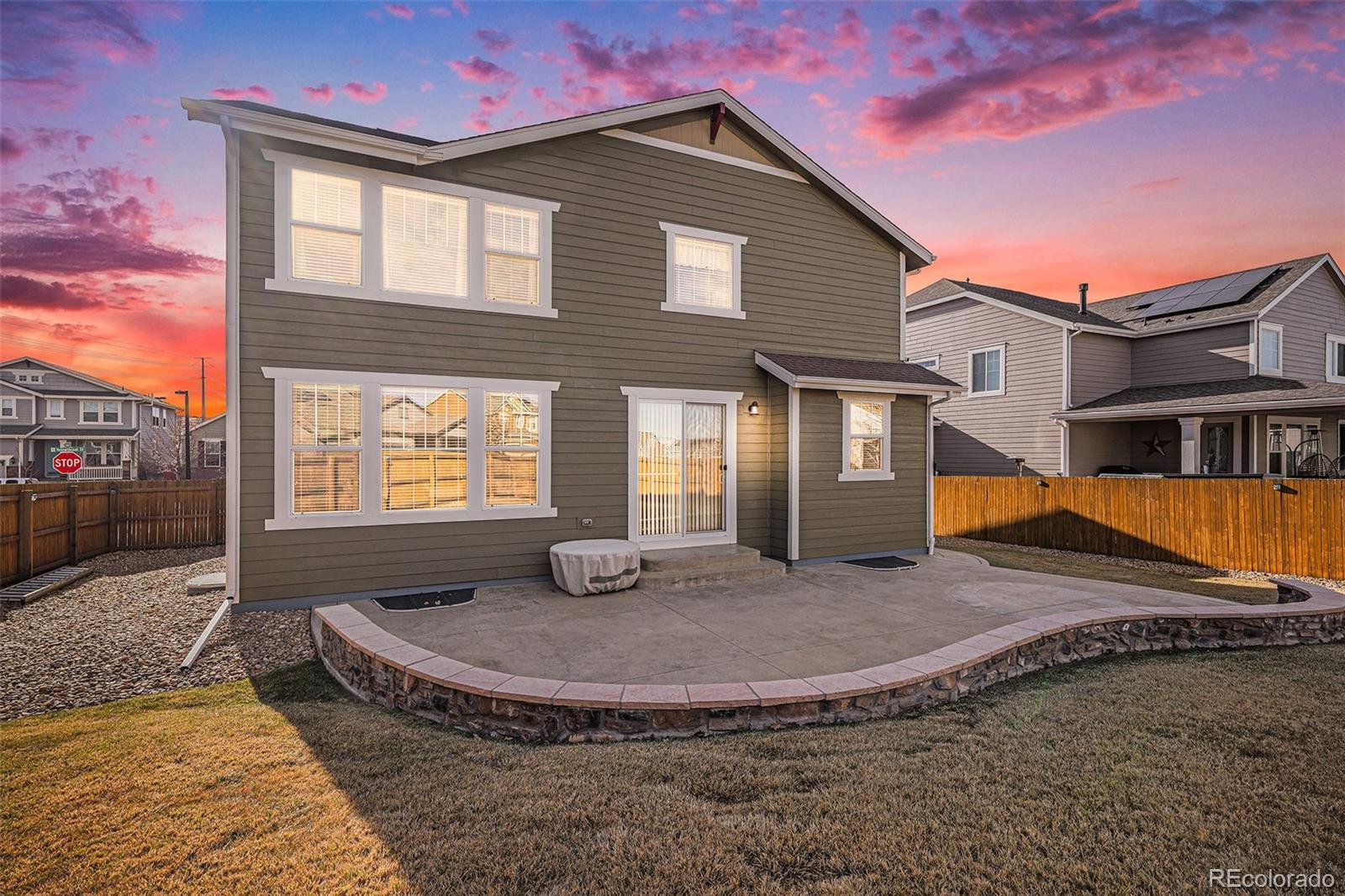 Welcome home to this beautifully maintained Parker Homestead gem that blends comfort, space, and thoughtful upgrades in all the right ways. Built in 2015 and sitting on a spacious corner lot, this two-story home offers a bright, open layout designed for everyday living and easy entertaining. The house and driveway are south-facing, allowing the sun to help melt snow and ice in the Colorado winters! The main level welcomes you with high ceilings, 8 foot doorways, hardwood floors, cozy living room centered around a gas fireplace and main floor bedroom (which would also be perfect as a home office) with connected Jack-n-Jill full bathroom. The kitchen is the heart of the home, featuring granite countertops, a large island with seating, stainless steel appliances, generous pantry space, and warm cabinetry that flows seamlessly into the dining area. Large windows throughout fill the space with natural light. Upstairs, the primary suite feels like a retreat with its oversized layout, recessed ceiling, and expansive walk-in closet. The five-piece primary bath includes a dual sink vanity, granite counters, a soaking tub, and a spacious shower. Two additional bedrooms are connected by a Jack-and-Jill bath, and the conveniently located upstairs laundry makes daily routines simple. The unfinished basement offers over 1,100 square feet of future potential—perfect for adding a rec room, another bedroom, a gym, or storage. Step outside to a fully fenced yard with a large patio, ideal for summer BBQs or quiet evenings. Notable upgrades include a whole-house water filtration system, water softener, and a whole-house humidifier—features Coloradans truly appreciate for comfort and water quality year-round. A three-car attached garage, central air, and low HOA round out the package. Located near neighborhood parks, trails, schools, and everything Parker has to offer, this home is move-in ready and waiting for its next chapter. Virtual Tour Available