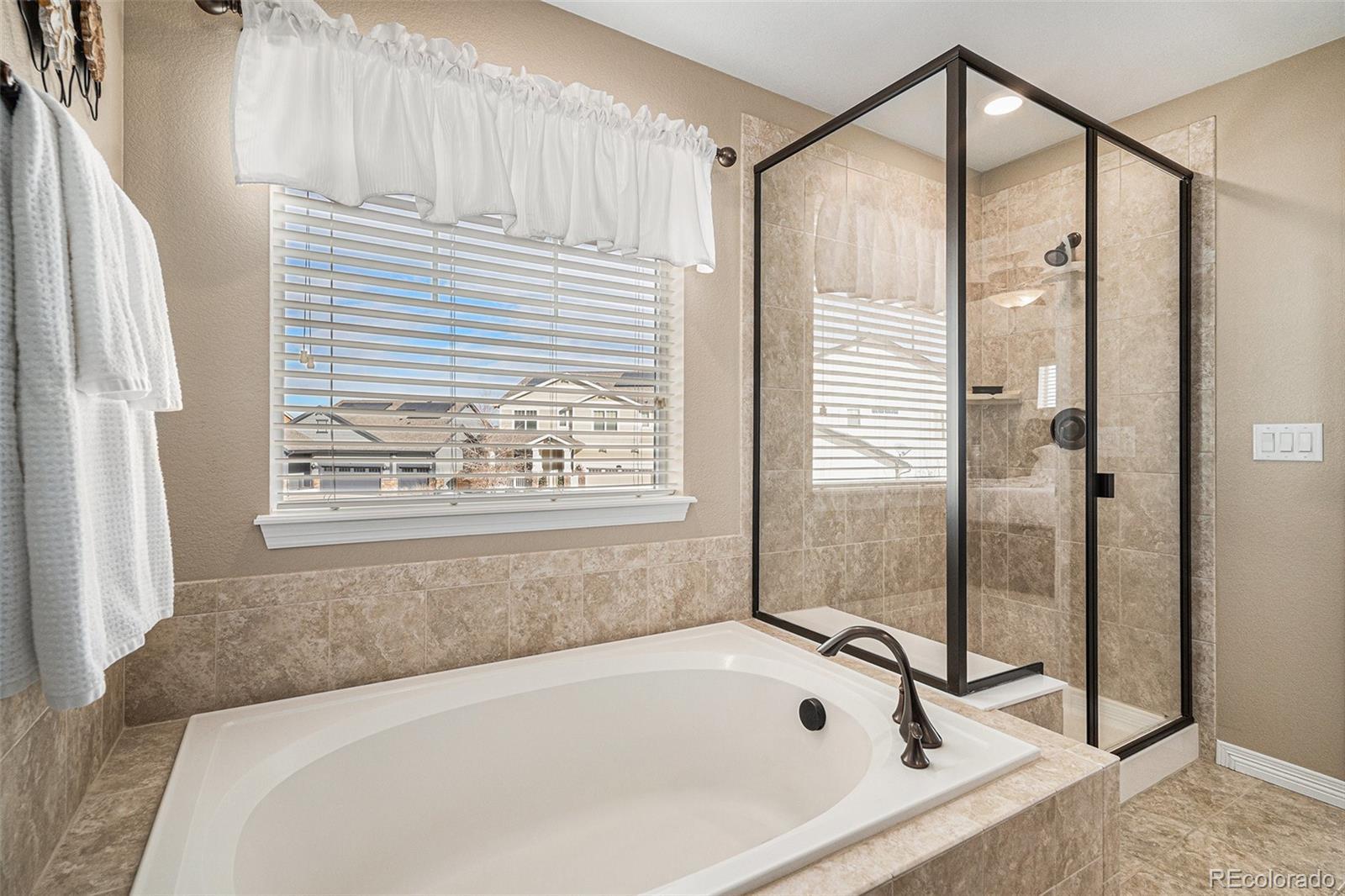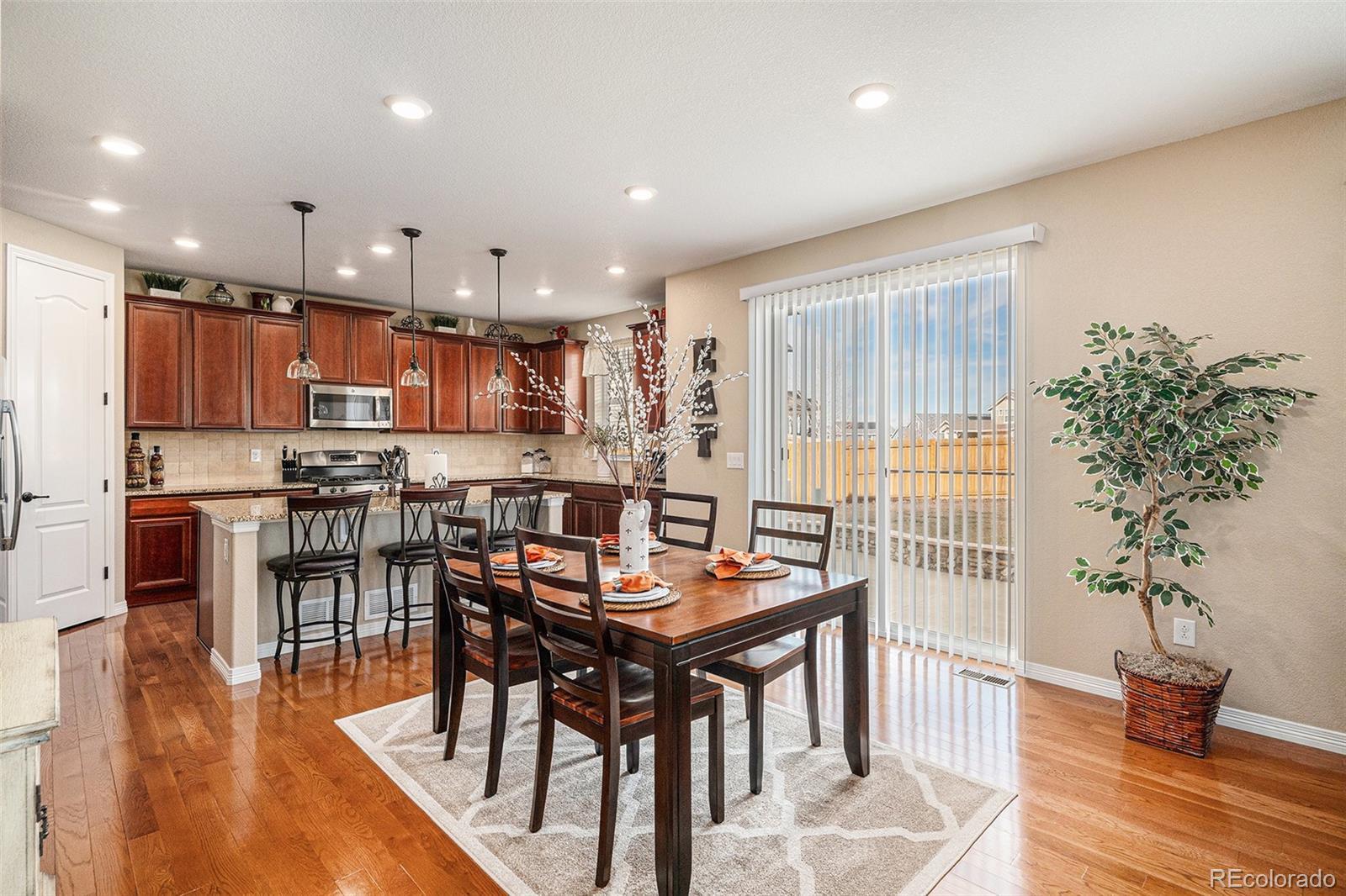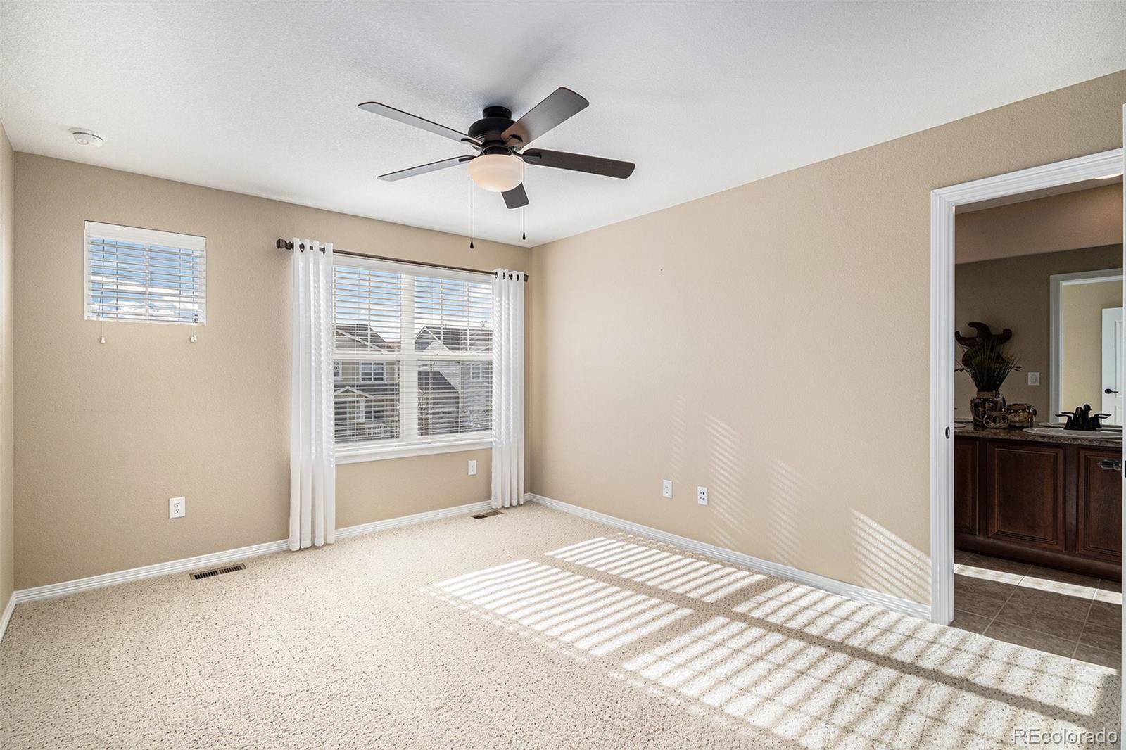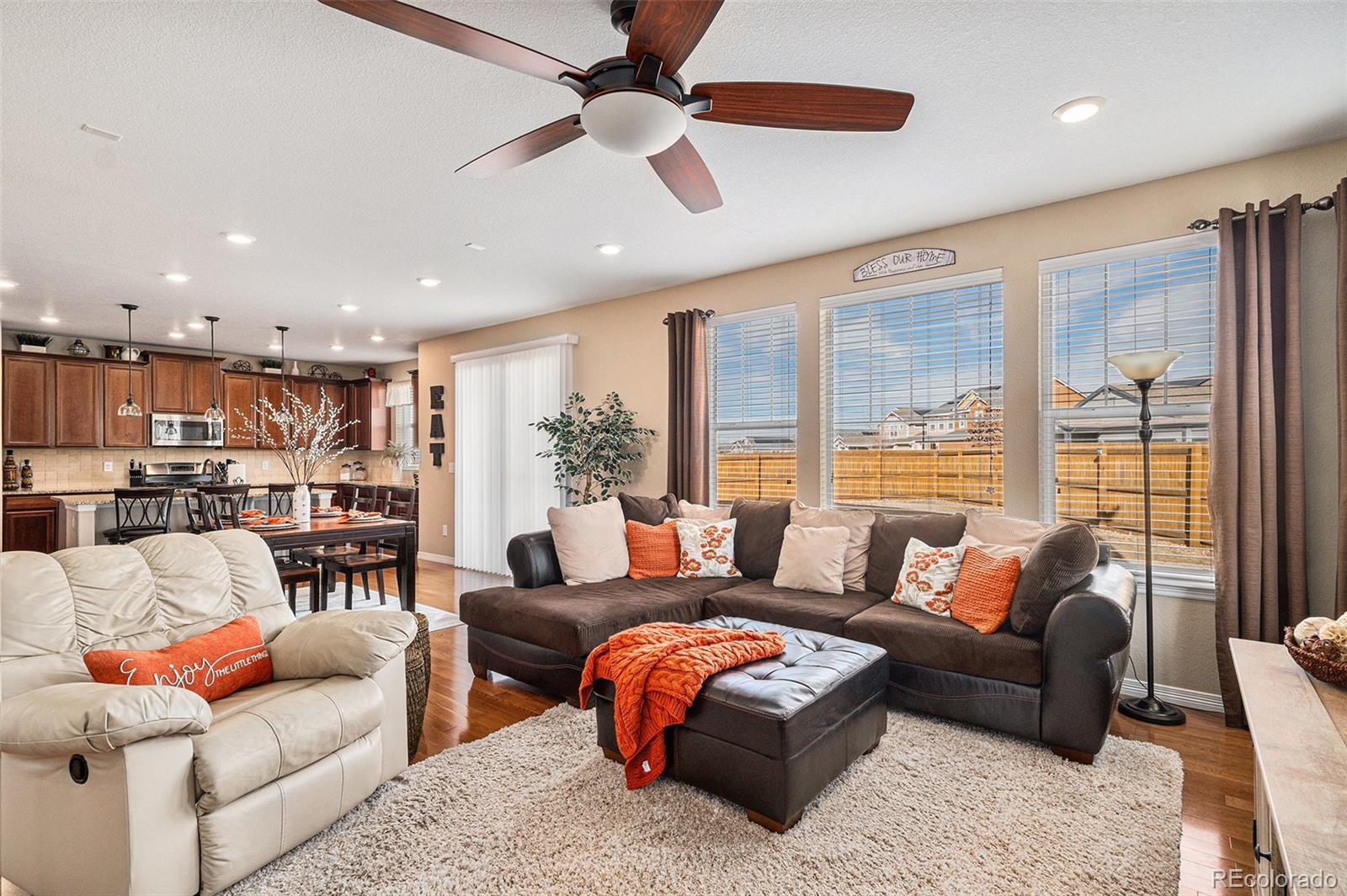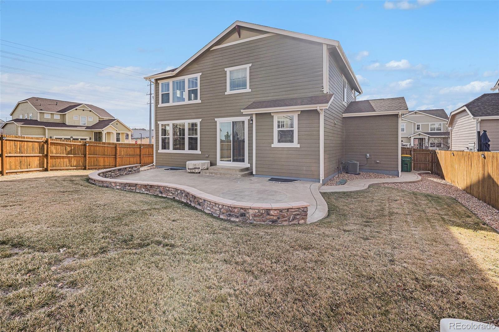Welcome home to this beautifully maintained Parker Homestead gem that blends comfort, space, and thoughtful upgrades in all the right ways. Built in 2015 and sitting on a spacious corner lot, this two-story home offers a bright, open layout designed for everyday living and easy entertaining. The house and driveway are south-facing, allowing the sun to help melt snow and ice in the Colorado winters! The main level welcomes you with high ceilings, 8 foot doorways, hardwood floors, cozy living room centered around a gas fireplace and main floor bedroom (which would also be perfect as a home office) with connected Jack-n-Jill full bathroom. The kitchen is the heart of the home, featuring granite countertops, a large island with seating, stainless steel appliances, generous pantry space, and warm cabinetry that flows seamlessly into the dining area. Large windows throughout fill the space with natural light. Upstairs, the primary suite feels like a retreat with its oversized layout, recessed ceiling, and expansive walk-in closet. The five-piece primary bath includes a dual sink vanity, granite counters, a soaking tub, and a spacious shower. Two additional bedrooms are connected by a Jack-and-Jill bath, and the conveniently located upstairs laundry makes daily routines simple. The unfinished basement offers over 1,100 square feet of future potential—perfect for adding a rec room, another bedroom, a gym, or storage. Step outside to a fully fenced yard with a large patio, ideal for summer BBQs or quiet evenings. Notable upgrades include a whole-house water filtration system, water softener, and a whole-house humidifier—features Coloradans truly appreciate for comfort and water quality year-round. A three-car attached garage, central air, and low HOA round out the package. Located near neighborhood parks, trails, schools, and everything Parker has to offer, this home is move-in ready and waiting for its next chapter. Virtual Tour Available