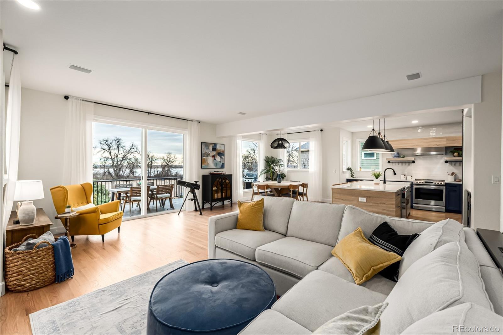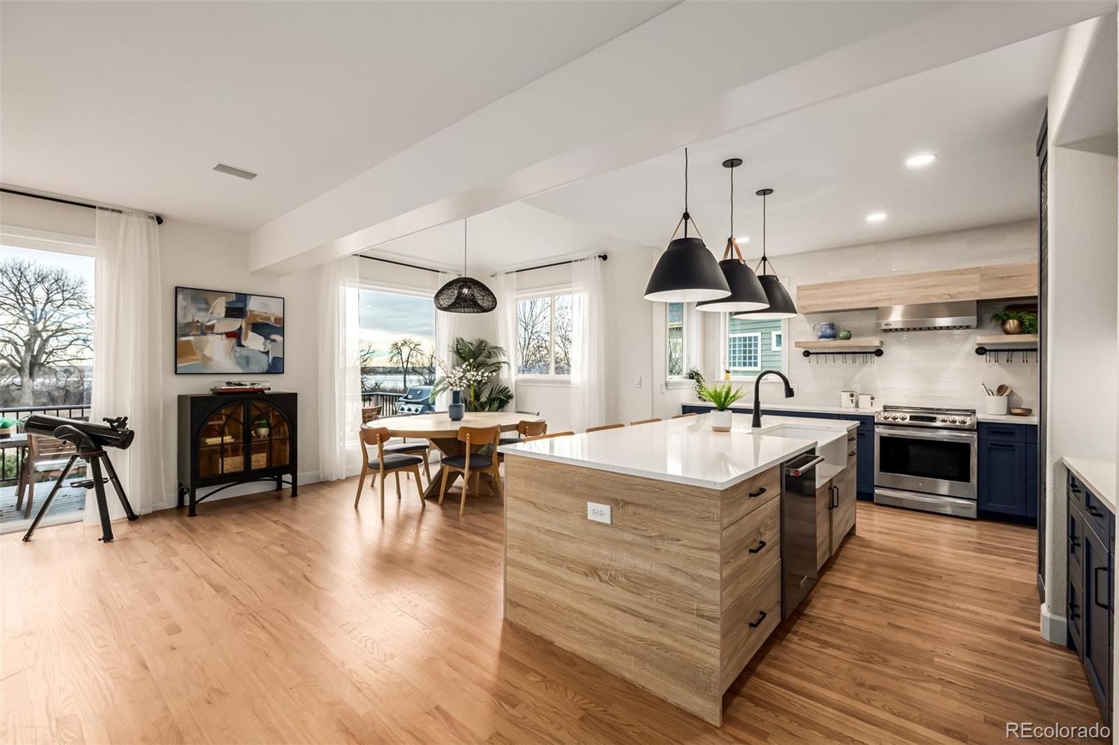 Stunning updated contemporary home backing to Waneka lake with views, views, views! Backing to acres of open space and the lake right out your back door, provides a quiet and serene sanctuary. The expansive main floor offers an airy, open-concept layout bathed in natural light, allowing you to savor breathtaking sunrises. As you enter, you are greeted by a sophisticated library, featuring custom bookshelves and an elegant sliding ladder. The family room is a true highlight, showcasing custom modern wood built-ins and a wall of windows overlooking your deck and the lake. The gourmet kitchen, professionally designed and remodeled in 2025, is equipped with an induction range, quartz counters, a generous island and farmhouse sink, butler's pantry, tons of storage. Al fresco dining on your deck offering stunning vistas where wildlife frequently graces your view. The beautifully landscaped backyard showcases vibrant perennials and a raised vegetable garden equipped with a drip irrigation system, a playset and the perfect amount of grass for playing before you hit the private trail to the lake. Experience ultimate relaxation with an infrared sauna, large soaking tub and a large walk-in closet. The upper-level features two additional bedrooms, each with generous closet space, full bath and an office nook. One delightful bedroom even includes a whimsical “secret door bookshelf". The finished walkout basement offers a spacious recreation room, an office overlooking the garden, an office and a sizable bedroom for guests along with a full bath. Many health and energy updates including owned solar panels, a newer energy-efficient furnace, tankless water heater, whole-house and reverse osmosis water purification systems, a water softener, fresh air exchanger, radon mitigation system, humidifier and dehumidfier (as you prefer) and a central vacuum system, every detail has been meticulously crafted to offer you peace of mind and comfort.