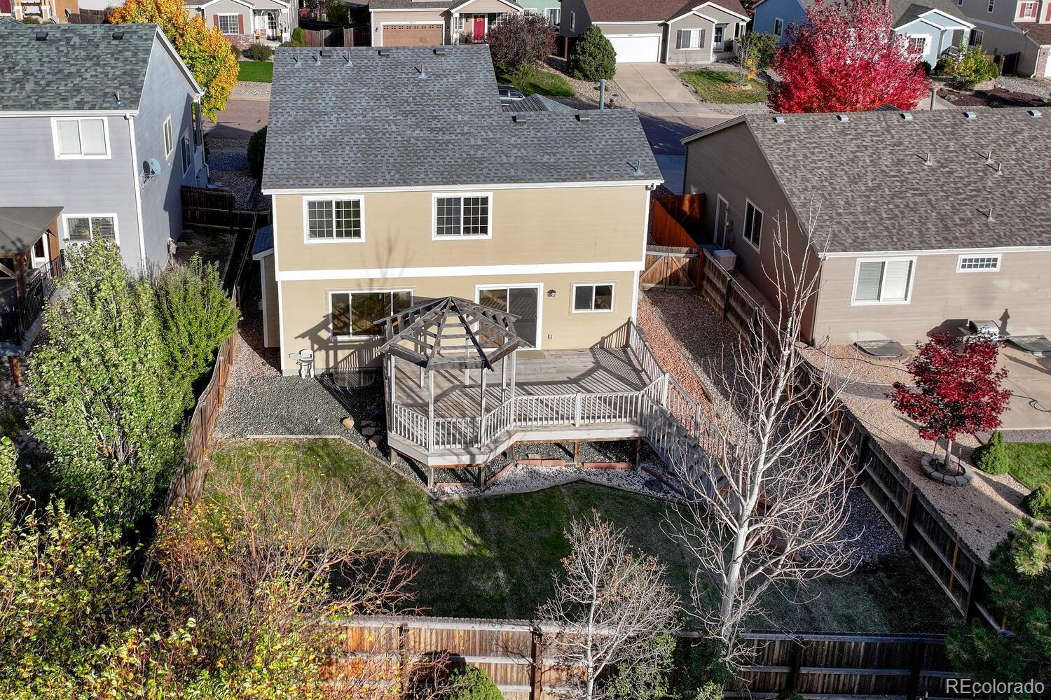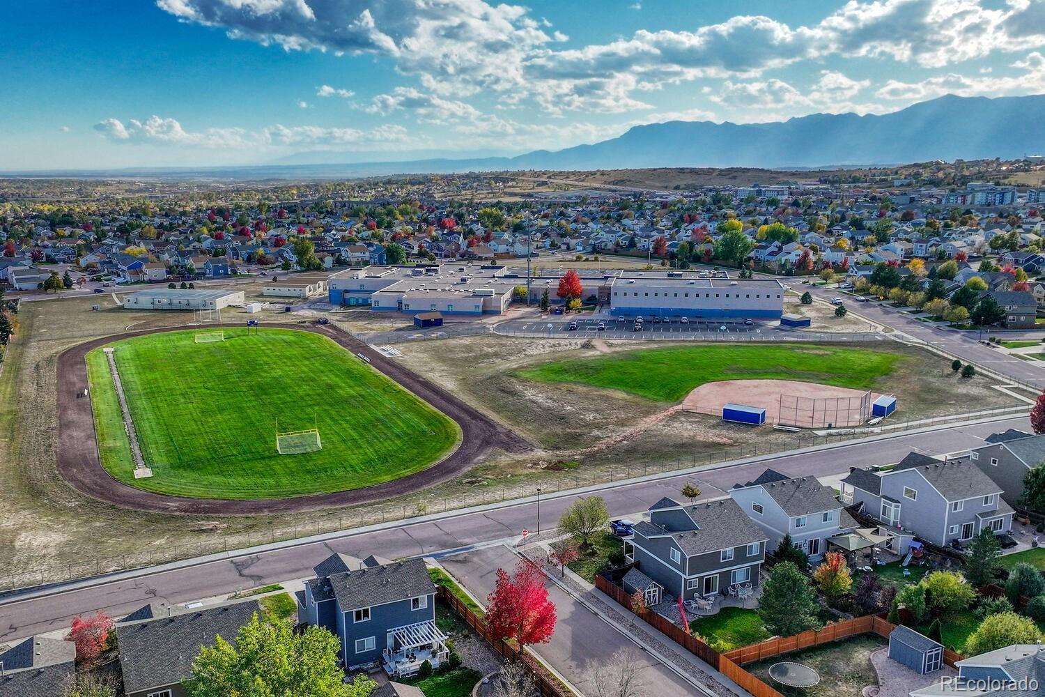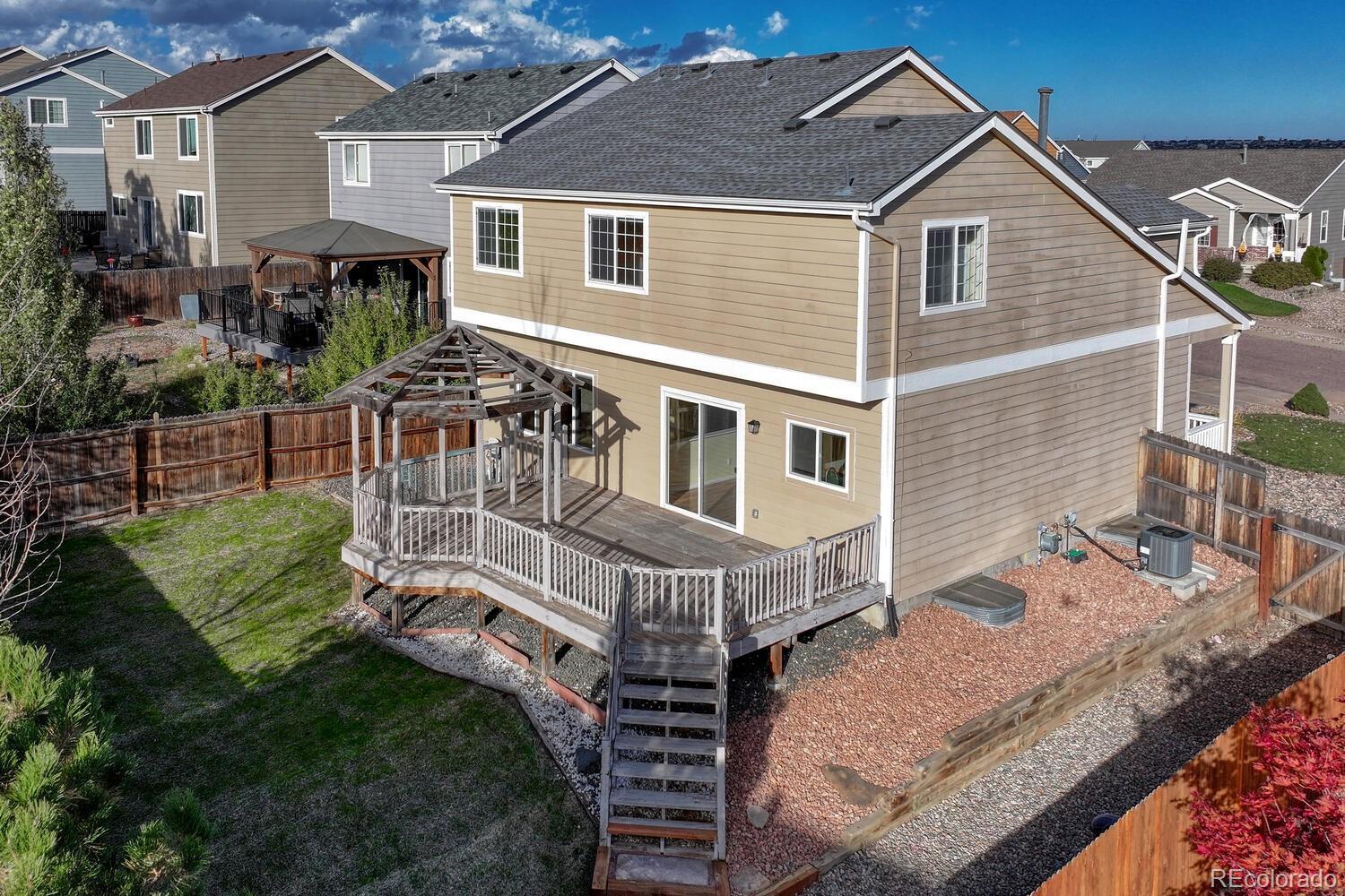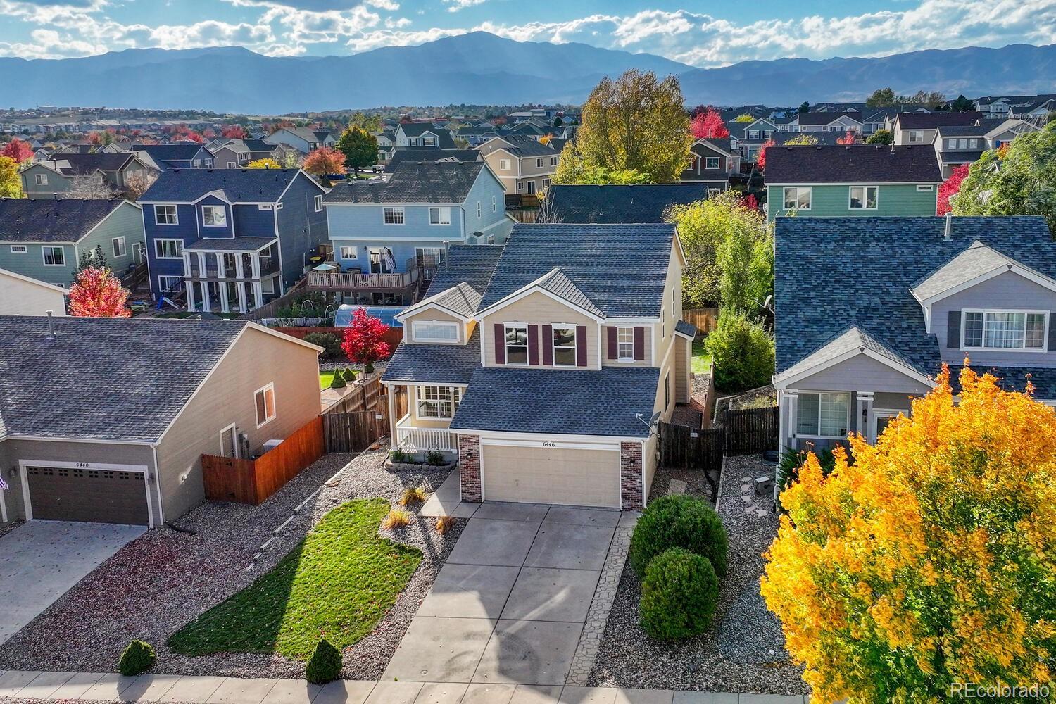 Welcome to this Ridgeview at Stetson Hills two story with Main Level Bedroom. Built in 2003, this pre-inspected 3007sqft home offers 5 bedrooms, 3 bathrooms, and 2-car attached garage plus space for an RV. Fully landscaped with auto sprinklers and fenced back yard, the home has both a covered front porch and large back deck for indoor-outdoor living. Enter to sunny living room with high vaulted ceiling and pretty blonde wood laminate floor. Kitchen features island, pantry, high celling, can lighting, newer stainless steel dishwasher and range oven, and oversized single bowl sink overlooking back yard. Designer kitchen upgrades include dark green cabinets with linear brushed nickel pulls, and a couple of sleek glass-front feature cabinets framing the stove. Dining room walks out to deck for cook-outs. Family room has gas fireplace with decorative tile surround. Main level bedroom has attached ¾ bathroom! Luxurious primary retreat features two walk-in closets and an attached five-piece bathroom with double sink vanity, large soaking tub, and separate shower. Three additional bedrooms upstairs, plus full bathroom and laundry room. Full unfinished basement with plumbing rough-in for lots of storage space now and room to expand in the future. Roof installed 2021, furnace and central A/C installed 2020. Additional highlights include a smart thermostat, honeycomb blinds, drywalled garage, radon mitigation system, and sump pumps. This quiet location is near Skyview Middle School, Ridgeview Elementary, and couple of neighborhood parks! Snowy River Park has playground, basketball court, walking paths, and green space; Jared Jensen Park offers playground, basketball, a climbing rock, a small skate park, and more. Near Powers and Woodmen, Ridgeview at Stetson Hills is convenient to medical centers, restaurants, stores, gyms, and entertainment venues. With a few quick projects to make it your own, this home has the layout, location, and size to become your favorite place to be!