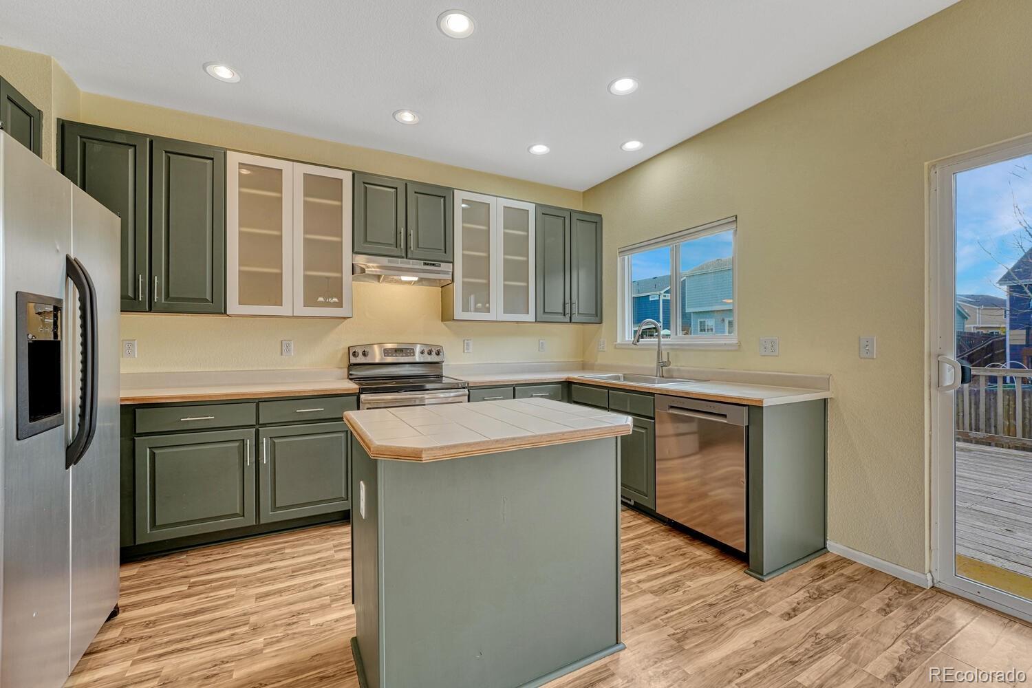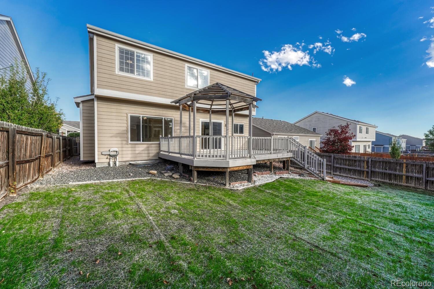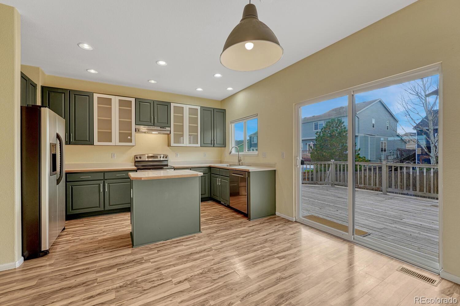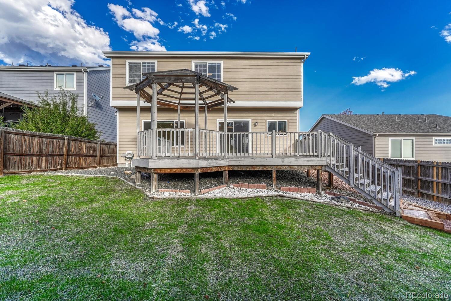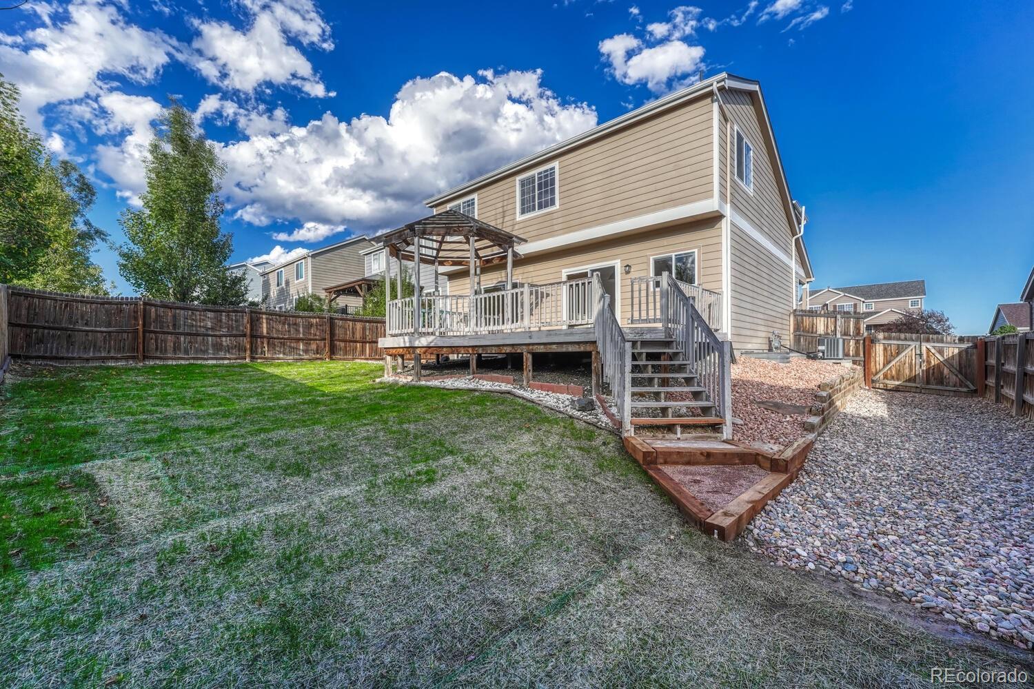 Welcome to this Ridgeview at Stetson Hills two story with Main Level Bedroom. Built in 2003, this pre-inspected 3007sqft home offers 5 bedrooms, 3 bathrooms, and 2-car attached garage plus space for an RV. Fully landscaped with auto sprinklers and fenced back yard, the home has both a covered front porch and large back deck for indoor-outdoor living. Enter to sunny living room with high vaulted ceiling and pretty blonde wood laminate floor. Kitchen features island, pantry, high celling, can lighting, newer stainless steel dishwasher and range oven, and oversized single bowl sink overlooking back yard. Designer kitchen upgrades include dark green cabinets with linear brushed nickel pulls, and a couple of sleek glass-front feature cabinets framing the stove. Dining room walks out to deck for cook-outs. Family room has gas fireplace with decorative tile surround. Main level bedroom has attached ¾ bathroom! Luxurious primary retreat features two walk-in closets and an attached five-piece bathroom with double sink vanity, large soaking tub, and separate shower. Three additional bedrooms upstairs, plus full bathroom and laundry room. Full unfinished basement with plumbing rough-in for lots of storage space now and room to expand in the future. Roof installed 2021, furnace and central A/C installed 2020. Additional highlights include a smart thermostat, honeycomb blinds, drywalled garage, radon mitigation system, and sump pumps. This quiet location is near Skyview Middle School, Ridgeview Elementary, and couple of neighborhood parks! Snowy River Park has playground, basketball court, walking paths, and green space; Jared Jensen Park offers playground, basketball, a climbing rock, a small skate park, and more. Near Powers and Woodmen, Ridgeview at Stetson Hills is convenient to medical centers, restaurants, stores, gyms, and entertainment venues. With a few quick projects to make it your own, this home has the layout, location, and size to become your favorite place to be!