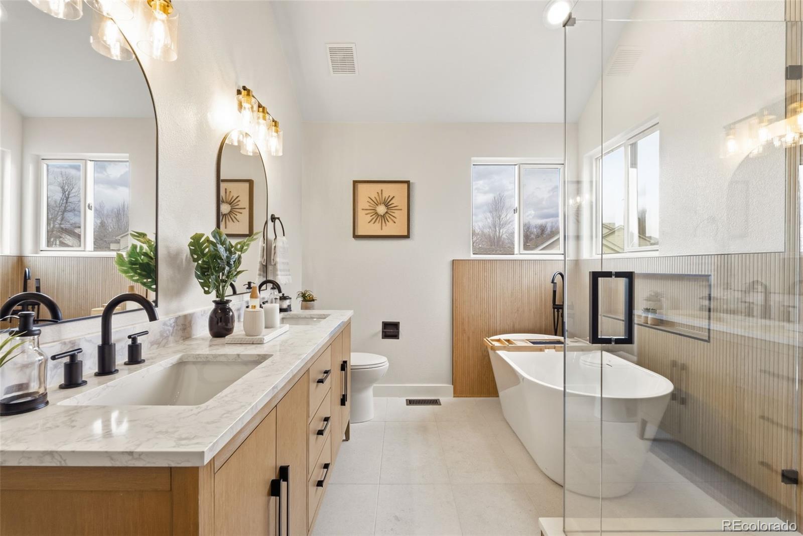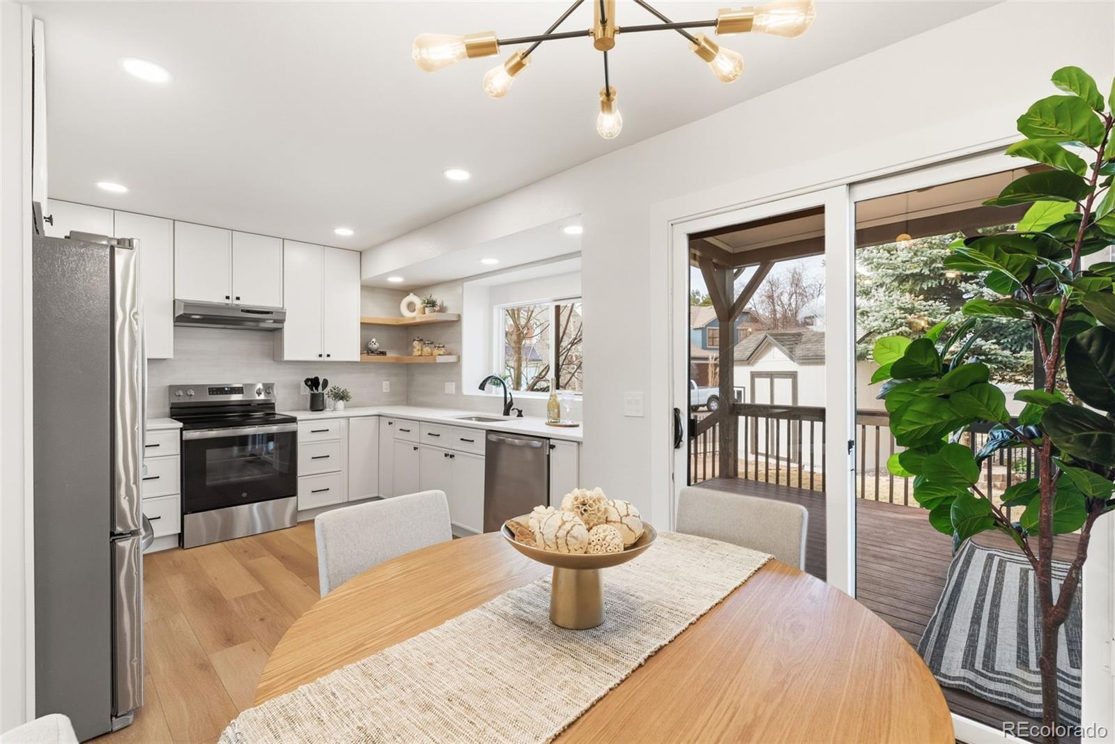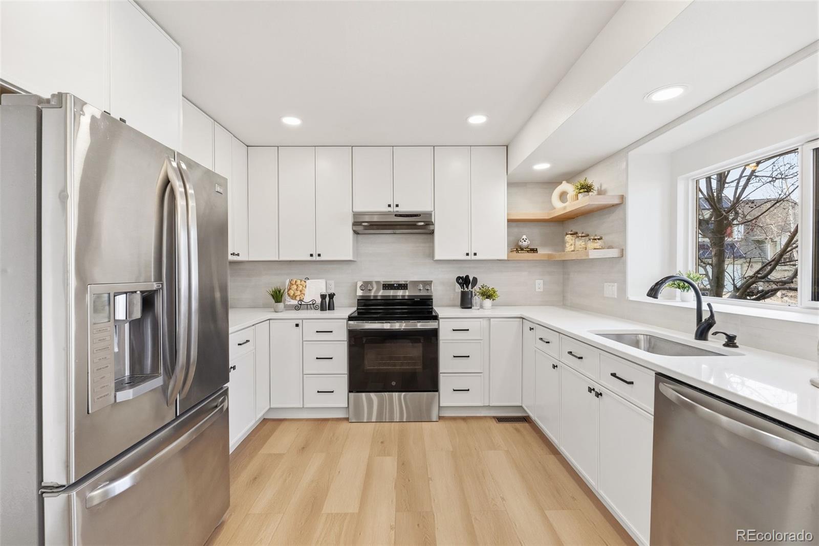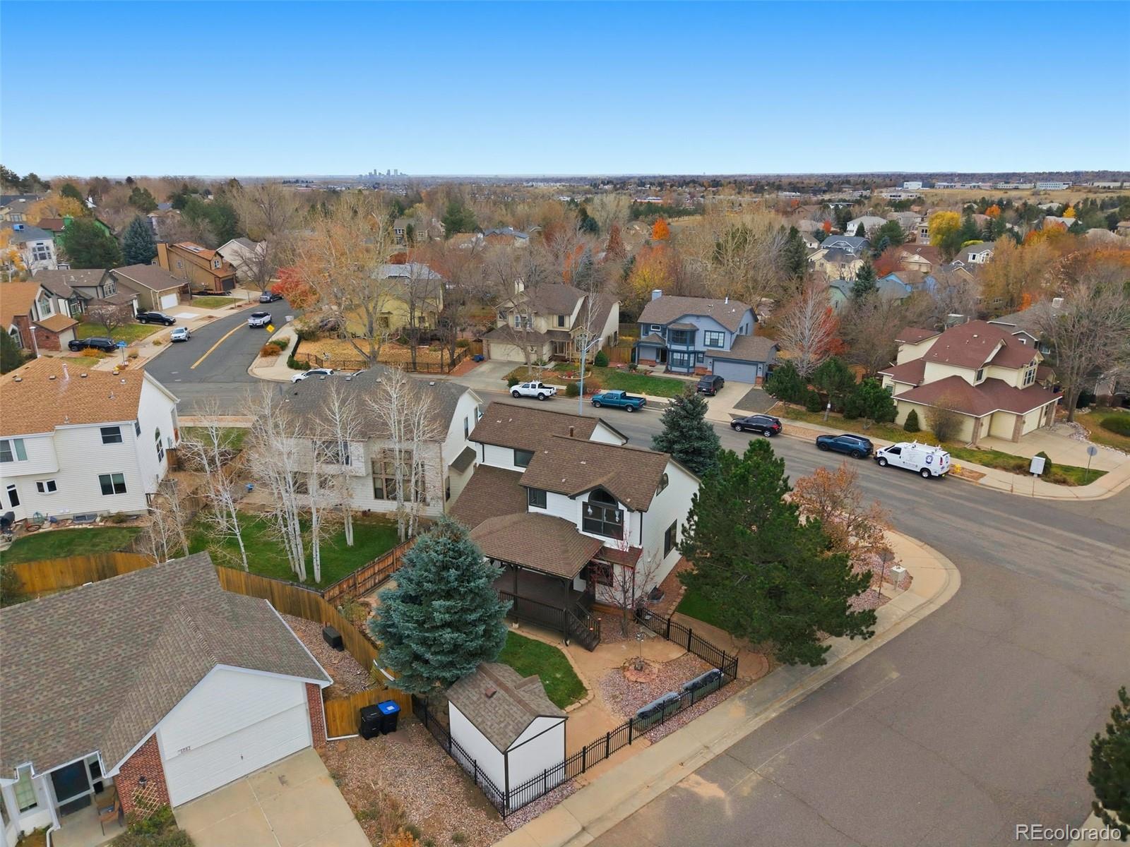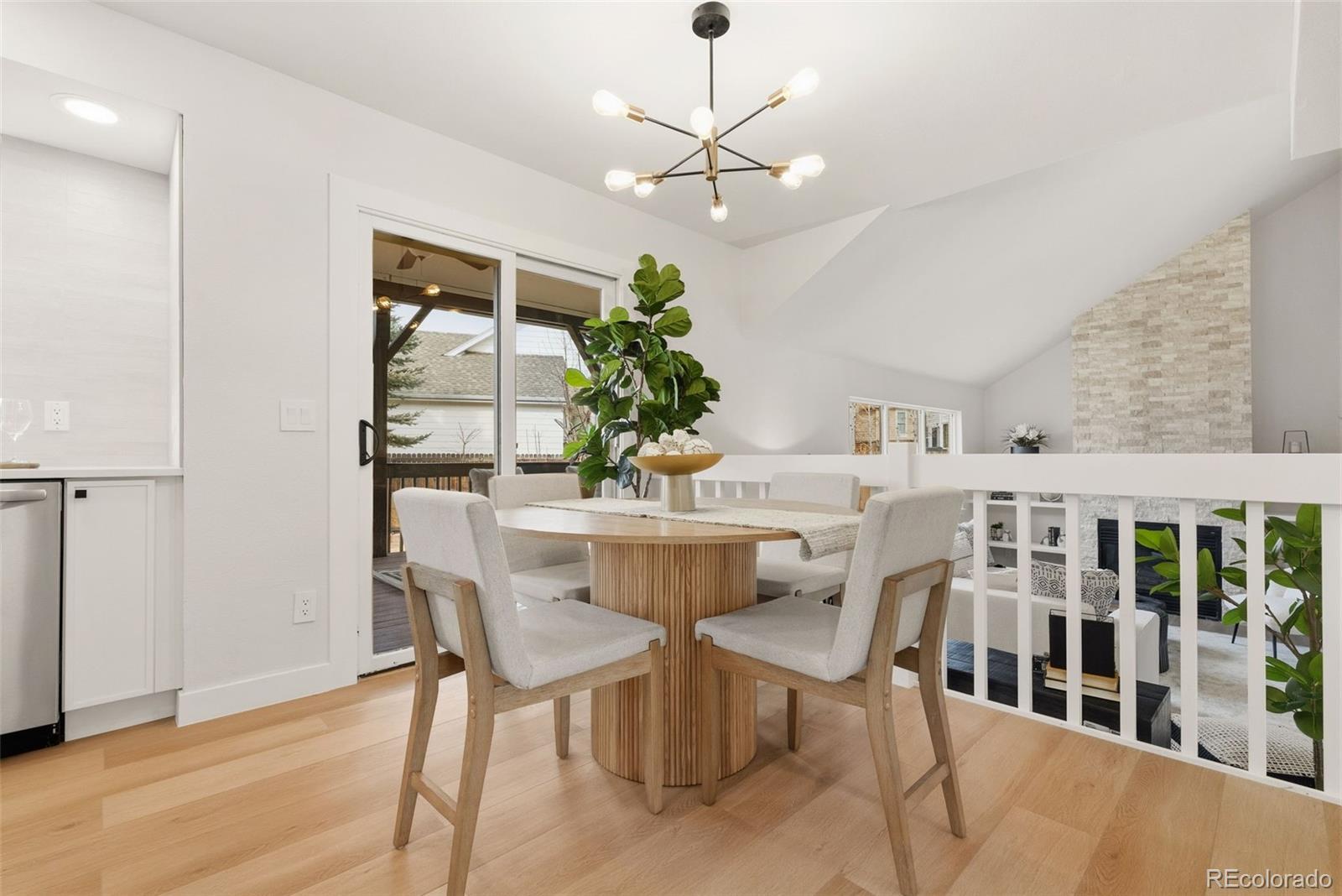 Beautifully updated throughout, this 4 bed, 4 bath home sits at the end of a quiet cul-de-sac in West Arvada, where vaulted ceilings, southwest-facing windows, and soft natural light create an inviting sense of openness from the moment you arrive. The main level features a welcoming living room, a separate dining room for larger gatherings, and a newly renovated contemporary kitchen with an eat-in dining area and seamless access to a large covered deck—perfect for slow weekend mornings, summer dinners, or enjoying the Colorado seasons. Just a few steps down is a comfortable family room enhanced by a stacked-stone electric fireplace and built-in open shelving. Upstairs, the spacious primary suite includes room for a cozy seating area and a spa-like 5-piece bath with a soaking tub and custom-tiled shower designed for everyday retreat. The two secondary bedrooms feel bright and airy with vaulted ceilings, charming window benches, and generous layouts with space for a desk or a cozy reading nook. The finished basement extends the home with a garden-level bedroom and en suite bath that bring in great natural light, plus a versatile bonus room ideal for a gym, media space, office, or playroom. Additional highlights include refreshed main-level flooring, updated vanities, mirrors, and lighting, complemented by a newer AC unit, range, and dishwasher. The corner lot also features a small turf putting area with two cups. Located just blocks from both Meadowlake Park and Wyndham Park, you'll enjoy lakeside paths, tennis courts, playgrounds, and open green space. With NO HOA, highly rated schools nearby, and convenient access to restaurants, groceries, and everyday essentials, this home blends comfort, style, and location into a warm, welcoming place to truly live.