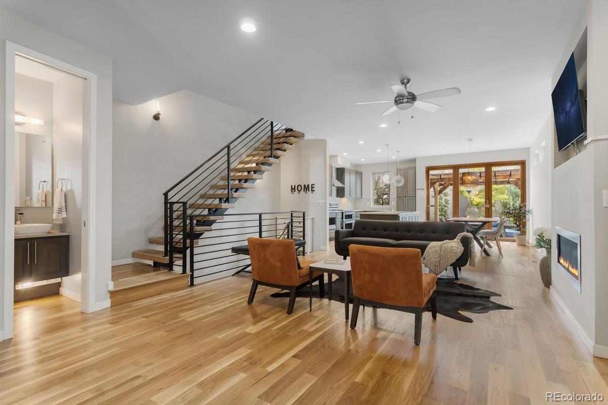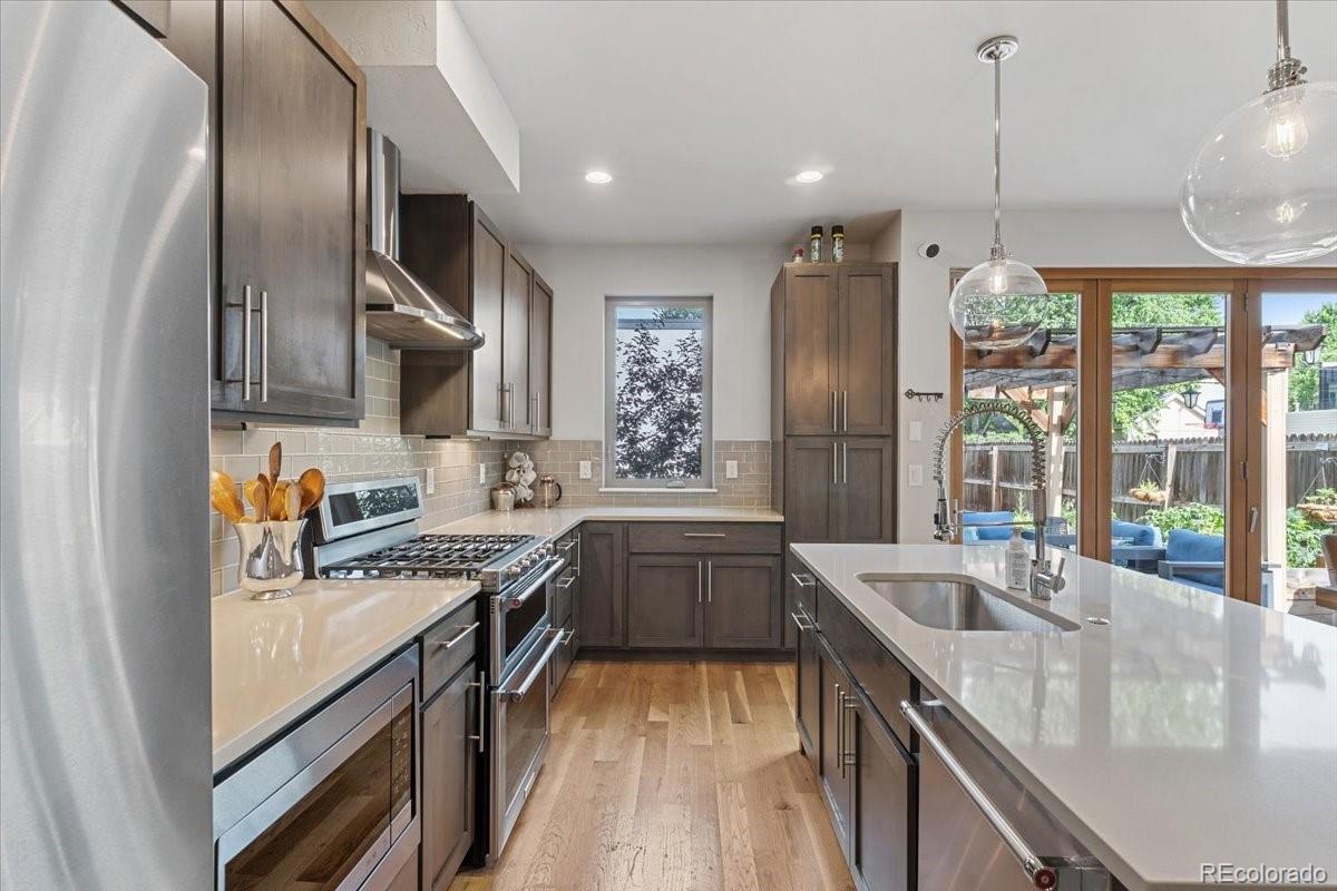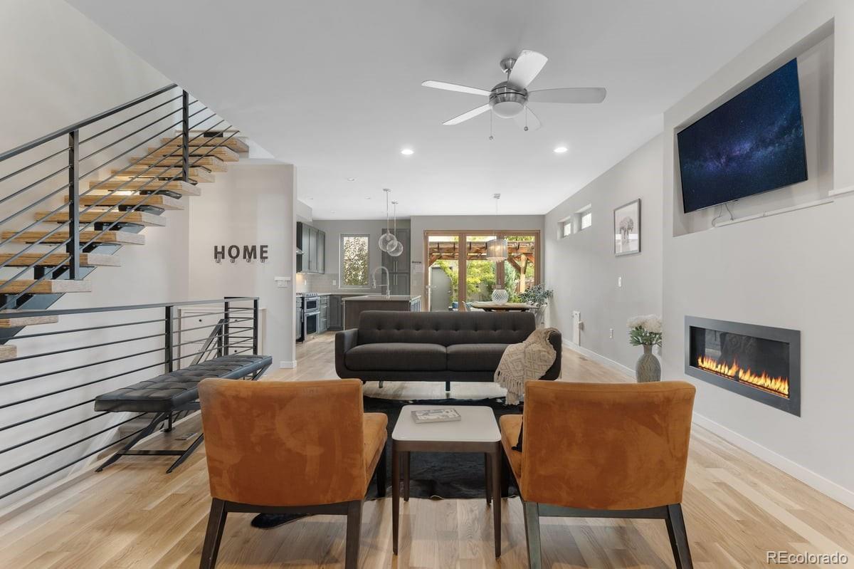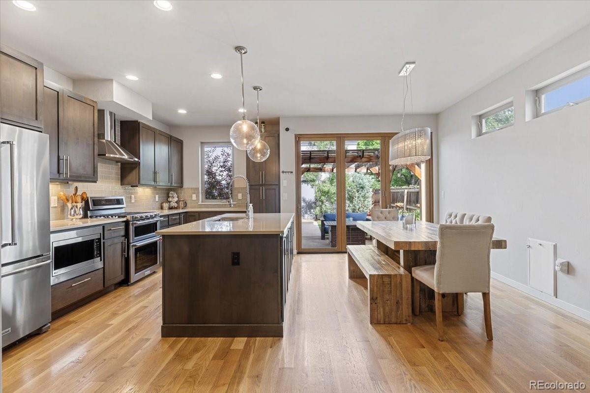 2420 S Gilpin is a stunning contemporary home with wonderful finishes and a smart floorplan in a fantastic neighborhood. Great natural light streams throughout thanks to southern exposure and a fantastic window package. La Cantina accordion doors seamlessly connect the indoor living spaces with the outdoor living space. Plus, there are three expansive skylights above a three-level open staircase that literally allows you to see stars & the moon at-times from inside the house. Whether you’re cooking for one person, or making a feast for 63 friends, this kitchen and the main living spaces are a dream. The kitchen is grand & open concept. It has beautiful quartz countertops and a great cabinet package. Want to be more environmentally friendly? Well, then THIS is the home for you. It has a big OWNED 8.4 kWh PV solar system, a 13.5 kWh Powerwall battery and a 240V Level 2 car charger (with both J1772 and NACS connectors) already installed in the garage. Also, the builder noted a Five-Star+ energy efficiency rating. Finishes here are way above what’s often found in this price range including, but not limited to: gorgeous wood floors, mesmerizing stair treads, nine-foot ceilings, eight-foot doors, five sweet bathrooms, incredible built-in storage in the basement and thoughtful finishes throughout. Plus, three balconies! Livability is at 100! with five bedrooms (three of which are together on the second floor) + an office/study just inside the front door + five bathrooms + three balconies + a wet bar on the top floor makes this “The One”. This home is skipping or rolling distance from 30+ restaurants on Evans, S. Downing and others in Platte Park.