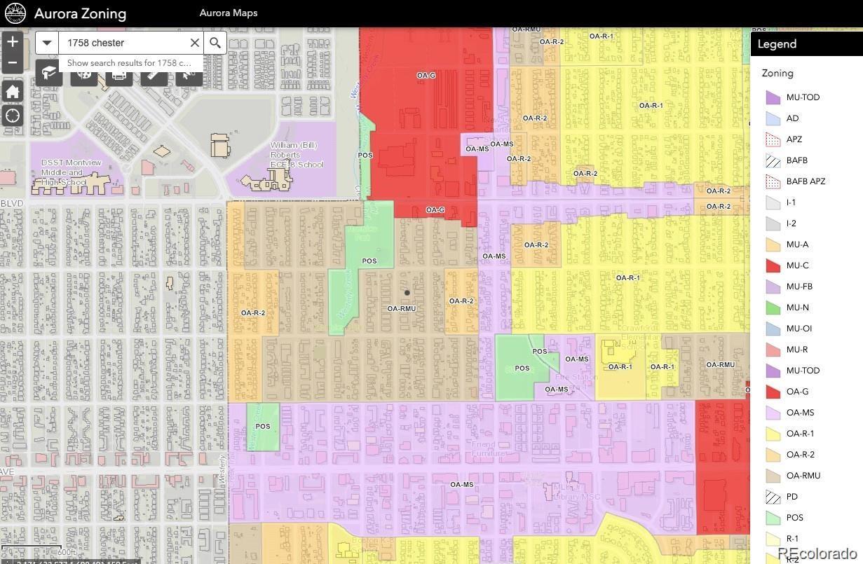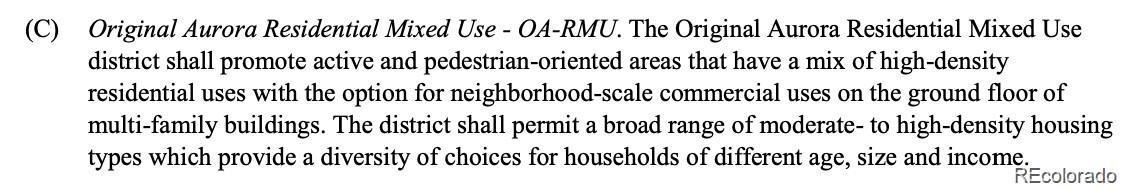 65 ft front by 127 lot depth and zoning OA-RMU, you could easily build 6 townhomes or four plex or even an apartment building. Steps away from Montview Park and Stanley Marketplace as well as Children's Hospital and Anschultz UCHealth University, this location will be very attractive to many tenants. Owners also looking to partner with a developer and build. OA-RMU: The Original Aurora Residential Mixed Use district shall promote active and pedestrian-oriented areas that have a mix of high-density residential uses with the option for neighborhood-scale commercial uses on the ground floor of multi-family buildings. The district shall permit a broad range of moderate- to high-density housing types which provide a diversity of choices for households of different age, size and income.