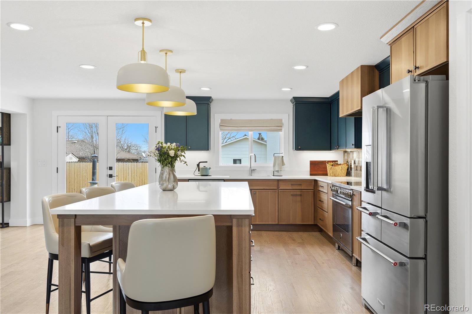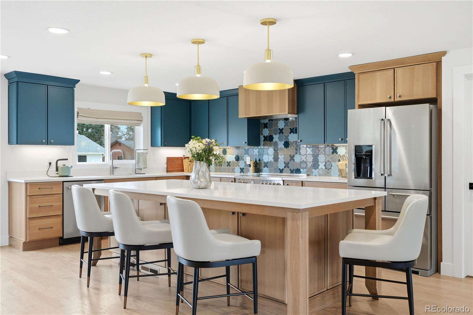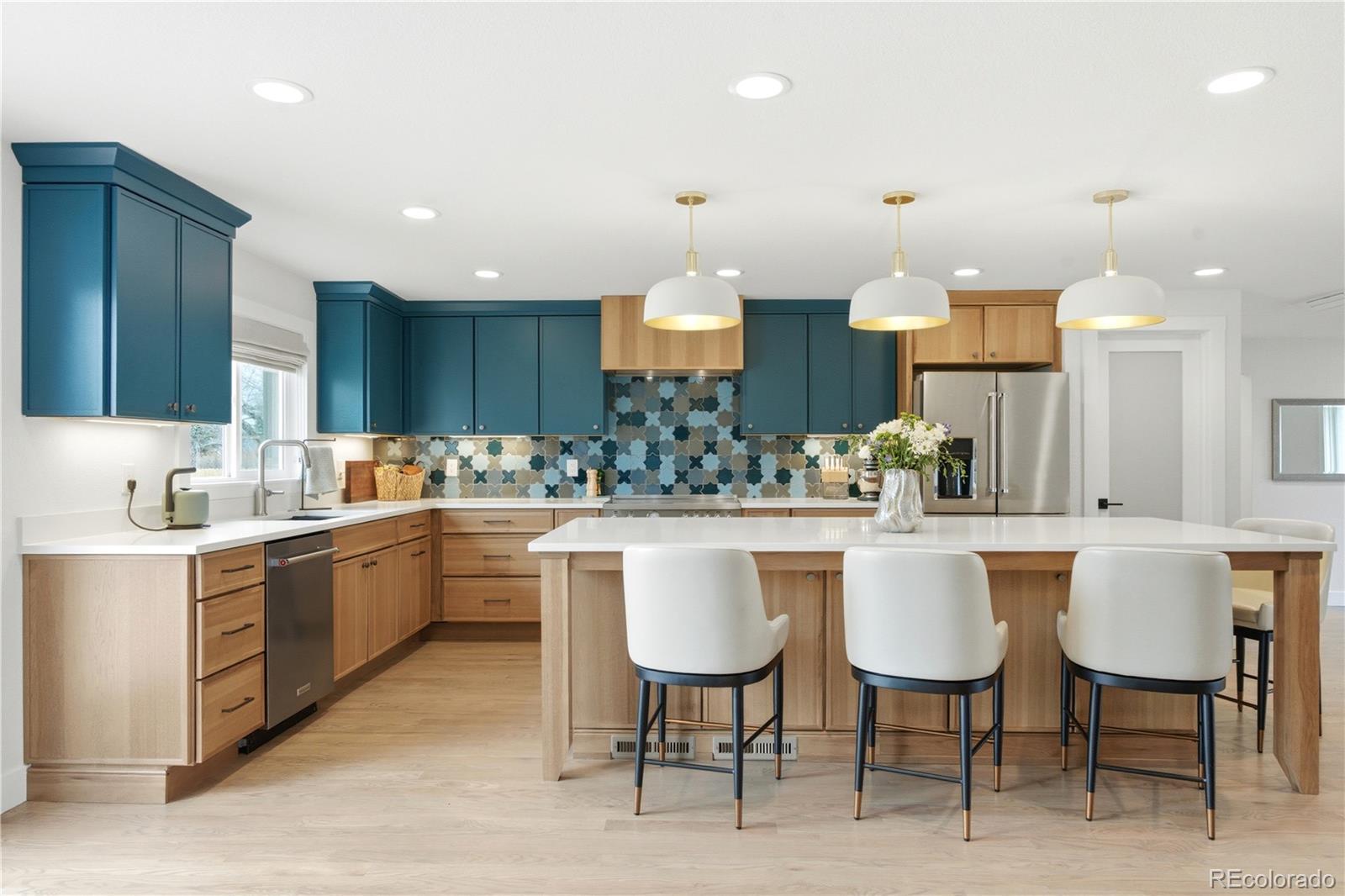 Discover refined modern living in this professionally reimagined mid-century ranch, ideally situated in the highly sought-after Columbine Knolls neighborhood. Thoughtfully renovated, this exceptional residence blends timeless architecture with elevated contemporary design, showcasing high-end finishes curated for both comfort and sophistication. The open-concept main level offers seamless indoor-outdoor living, highlighted by a chef’s kitchen with premium appliances, upgraded red pine wood flooring throughout, and expansive windows that bathe the home in natural light. The spa-inspired primary bath features radiant heated floors for everyday indulgence, while the fully finished basement provides versatile additional living space for entertaining, work, or relaxation. Outside, the expansive backyard presents endless opportunities for elevated entertainment, serene relaxation, or future customization. Extensive upgrades, too numerous to list, entail a water heater, furnace, roof, gutters, doors, trim, soft-close cabinets, upgraded tile, carpet, and an oversized garage door, among other improvements. This results in a truly turnkey, luxurious property with peace of mind, set in a timeless environment.