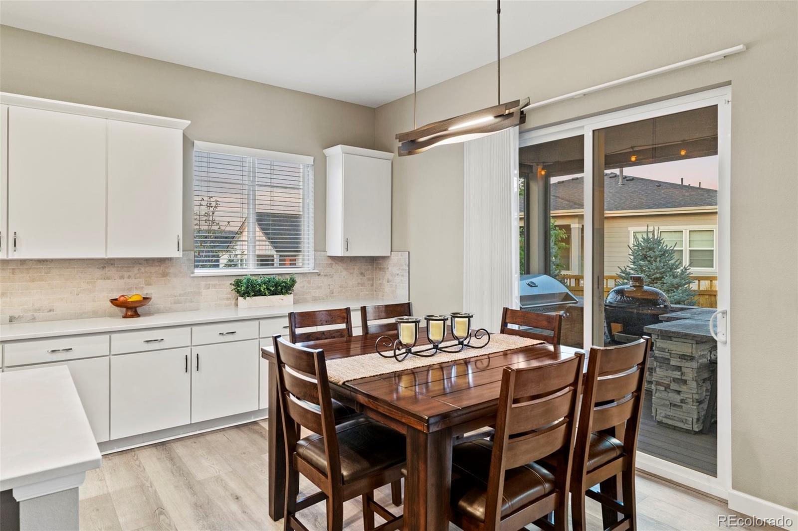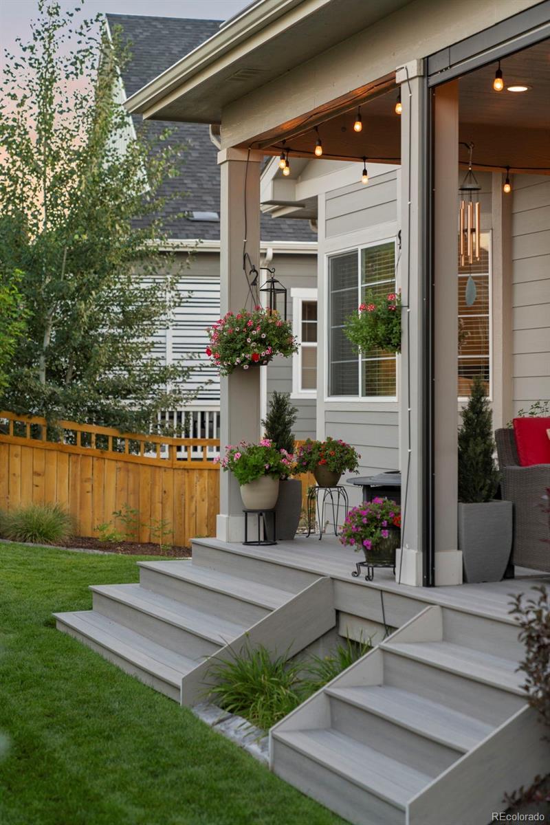 Welcome to a rare find, ranch-style retreat in The Meadows of Castle Rock—one of the top-ranked communities to live in the country. From the curb, this home makes its presence known: a striking three-panel glass front door, carriage lighting, and manicured landscaping that sets the tone for what’s inside. Step through the entry and your eyes are drawn immediately across the open floor plan to a wall of glass, framing views of your private backyard oasis. The great room flows effortlessly into the chef’s kitchen, where a sprawling island invites family gatherings and holiday meals. Quartz countertops, high-end appliances, and thoughtful touches like reverse osmosis and instant hot water make every detail feel considered, elevated, and ready for everyday living. The main floor is designed with intention—two guest bedrooms tucked into their own wing, a private office framed by French doors, and a laundry room with storage, sink, and drying station. The finished basement extends the possibilities with a recreation room perfect for game day or movie night, a guest suite, a 5th bedroom/gym, and over 1,000 sq ft of unfinished storage to grow into. Outdoors, the home truly shines. Mature trees and raised garden beds create a sense of seclusion, while hardwired privacy screens let you enjoy the patio in ultimate comfort—shielded from wind and weather! The custom outdoor kitchen steals the show, complete with Natural Gas Grill with Rotisserie Feature, Napoleon Sizzle Zone Side Burner, & Primo Extra Large Smoker. Even the garages reflect care and craftsmanship, with epoxy-coated floors, tall ceilings for storage, and permanent Jellyfish lighting that transforms the home for every season. Miles of trails, acres of open space, pools, concerts, family events, and community connections that make every day feel special. Why wait to build, when the perfect home—thoughtfully upgraded, fully landscaped, and move-in ready—is already waiting for you!