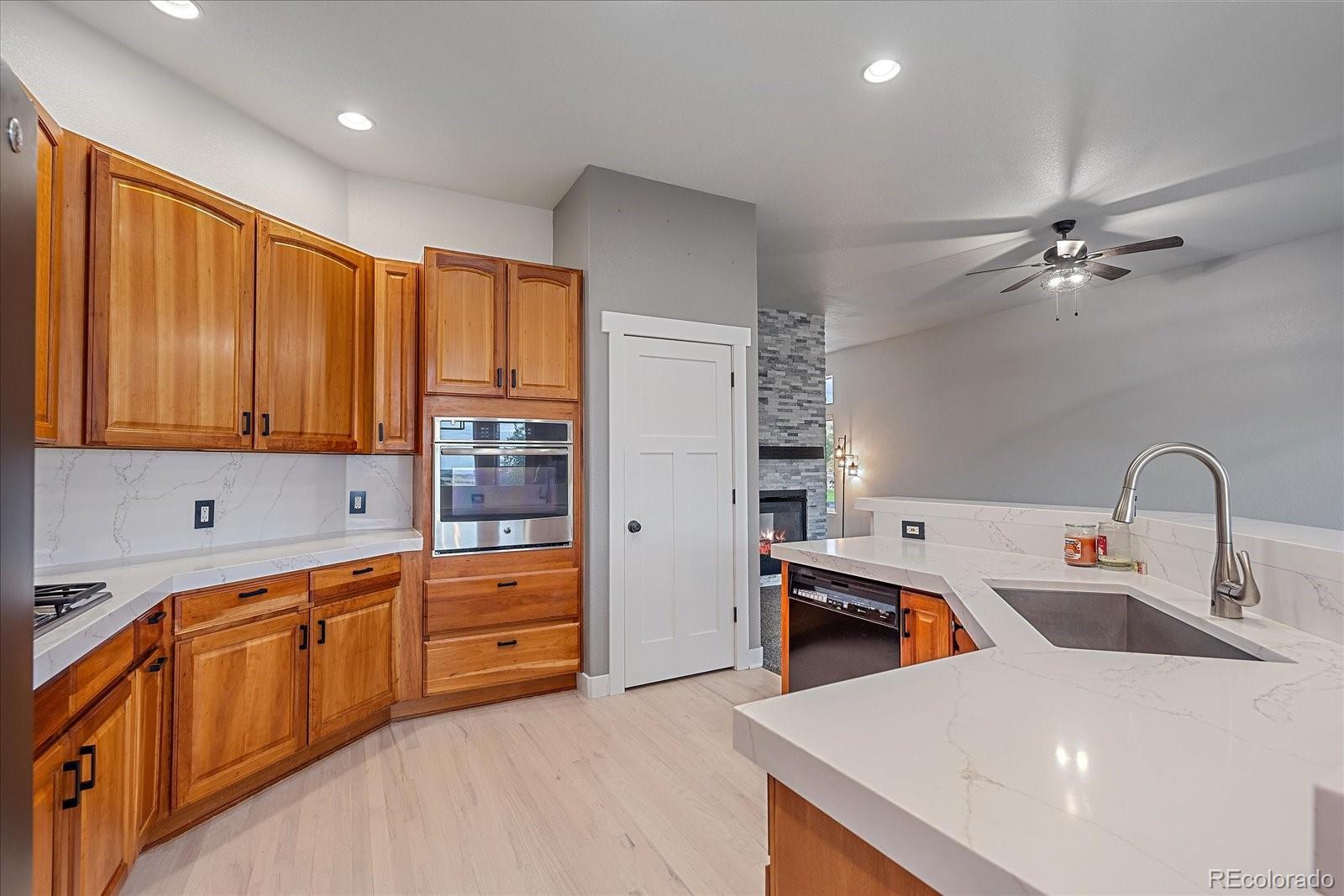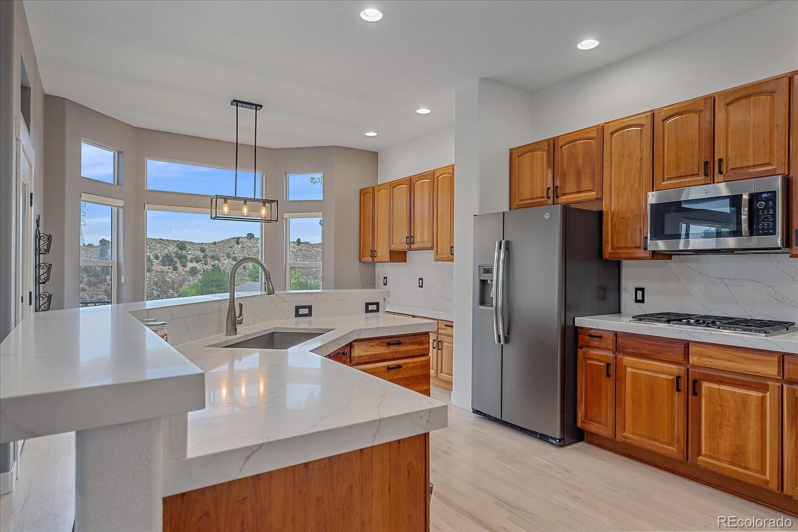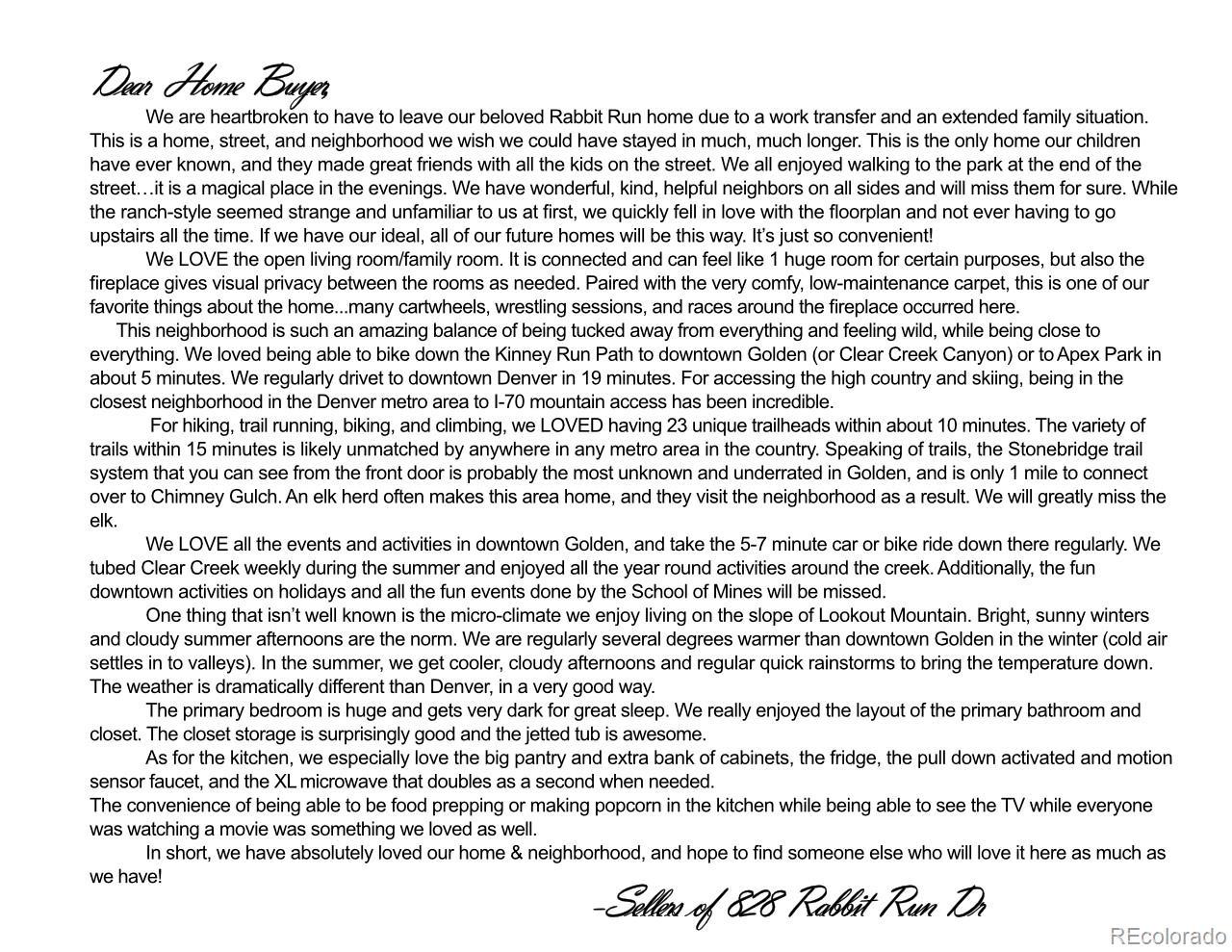 Colorado dream home in highly sought-after Stonebridge—a large ranch-style retreat that blends modern comfort with the best of mountain living. With sweeping mountain views, $200K+ in updates, and effortless access to trails, you can have both luxury and adventure. Watch the sun rise or set from the expanded back deck, or gather by the fire for a cozy evening. The open-concept main level features updated flooring, fresh paint, soaring ceilings, and a dramatic 3-sided brick fireplace. Multiple skylights over-sized windows frame the expansive mountain views and fill the home with natural light. The chef’s kitchen offers sleek quartz countertops, abundant storage, and a new, high-end microwave that also doubles as a second oven. The vast primary suite is a private retreat with a spa-like jetted tub and thoughtfully designed walk-in closet. Additional bedrooms and a main-floor laundry add convenience and function. Downstairs, the walk-out basement is designed for entertainment and flexibility. A spacious rec room with a full wet bar is perfect for gatherings, while a private guest suite with an ensuite bath provides comfort for visitors. A versatile flex space and 1,000 sq. ft. of uncounted storage make this level as practical as it is inviting, with two large patio doors extending your living space outdoors. Additional highlights include a three-car garage with sealed floors, a level backyard (rare in Stonebridge), and direct trail access just across the street. Walk over to Stonebridge park at the end of the street, take a 5 minute bike ride to Apex Park or downtown Golden via Kinney Run, or take advantage of 23 trailheads within 10 minutes. Rabbit Run offers easy neighborhood access, a new park & community area, and frequent elk & other wildlife sightings. With all major systems and appliances updated in recent years, a low-maintenance yard, and unbeatable access to the mountains, Golden, and downtown, this home is the Colorado lifestyle you’ve been waiting for.