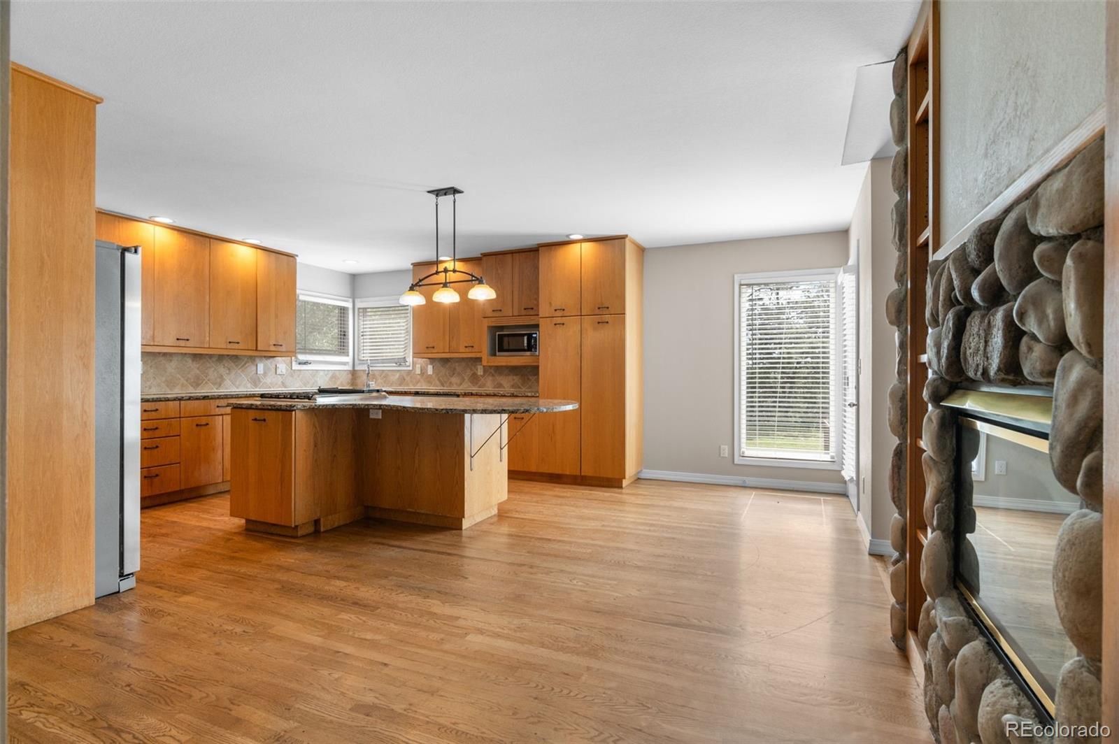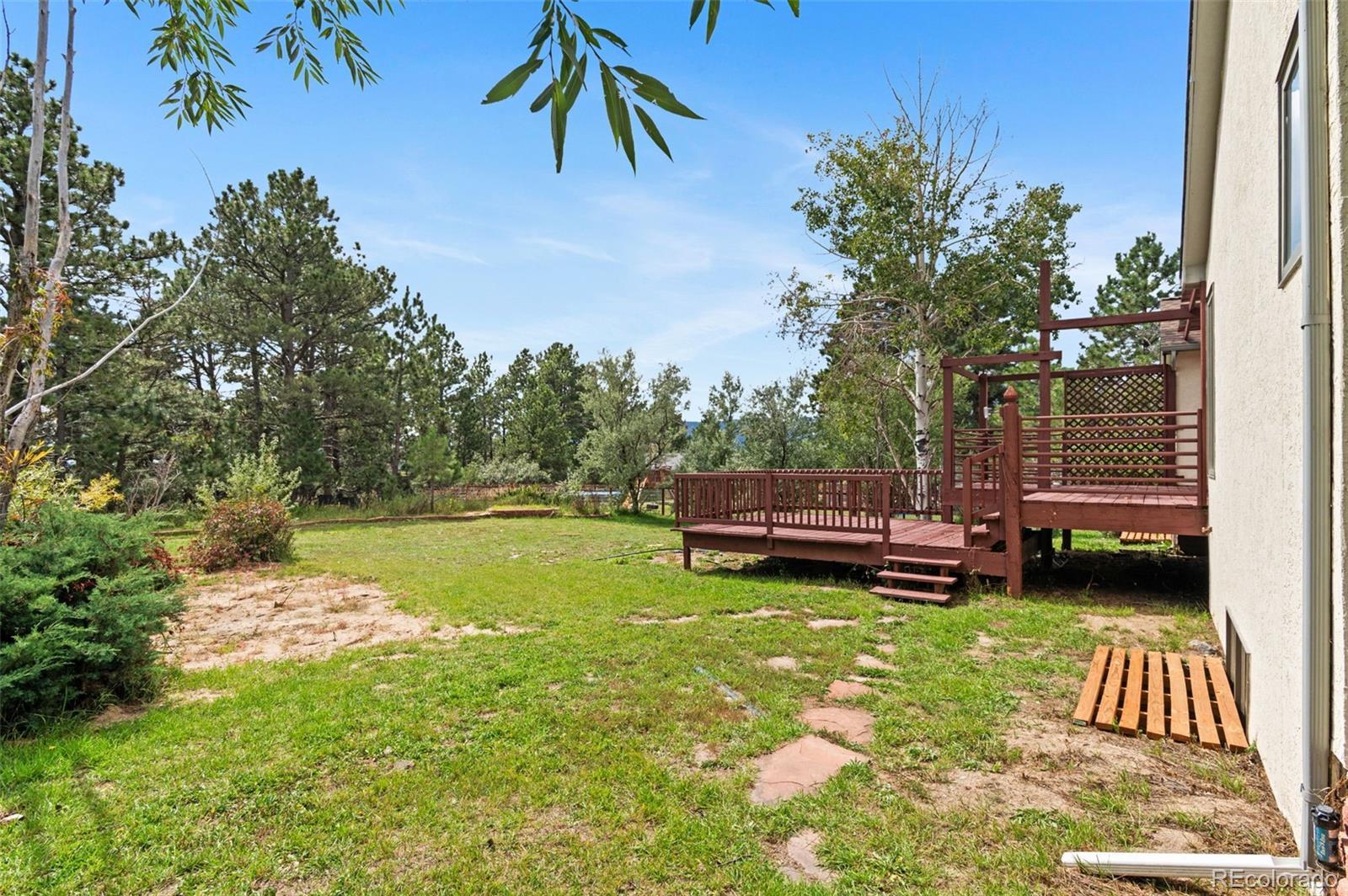 Welcome to this beautiful ranch-style home nestled on a spacious 42,000 sq ft lot with mature trees and stunning mountain views. Step inside to an inviting open floorplan featuring fresh paint, new carpet, and abundant hardwood floors. The large kitchen flows seamlessly into the dining and great rooms, highlighted by a one-of-a-kind river rock fireplace with built-ins—perfect for entertaining or cozy evenings at home. The main floor hosts a spacious primary suite with a walk-in closet and private 4-piece bath, along with a versatile secondary bedroom that can double as a home office. Downstairs, the finished basement expands your living space with a huge rec room, three additional bedrooms, and two full baths. With its blend of comfort, character, and space—both indoors and out—this home is the perfect retreat while still offering easy access to all Monument has to offer.