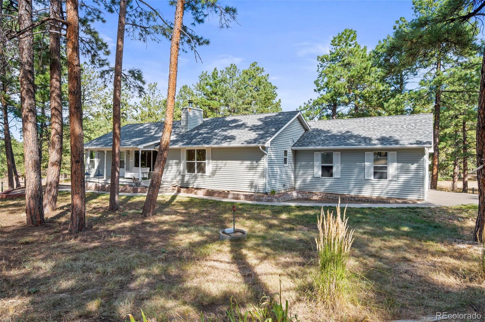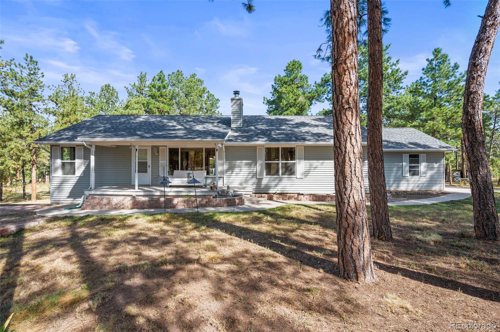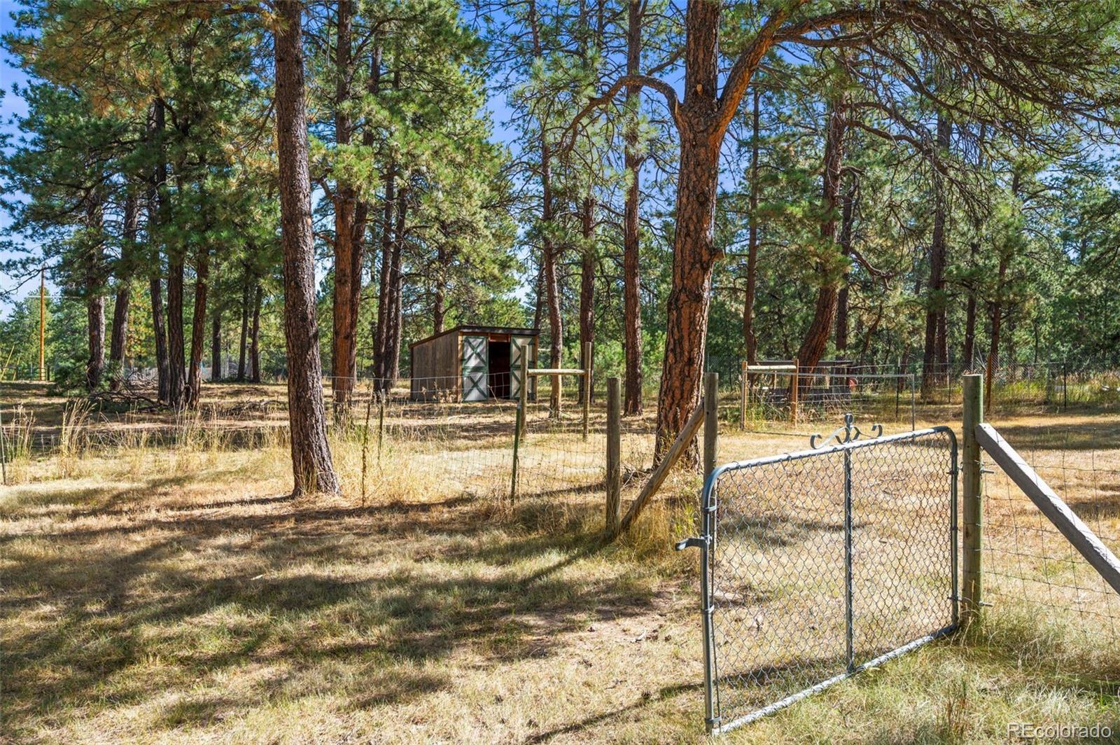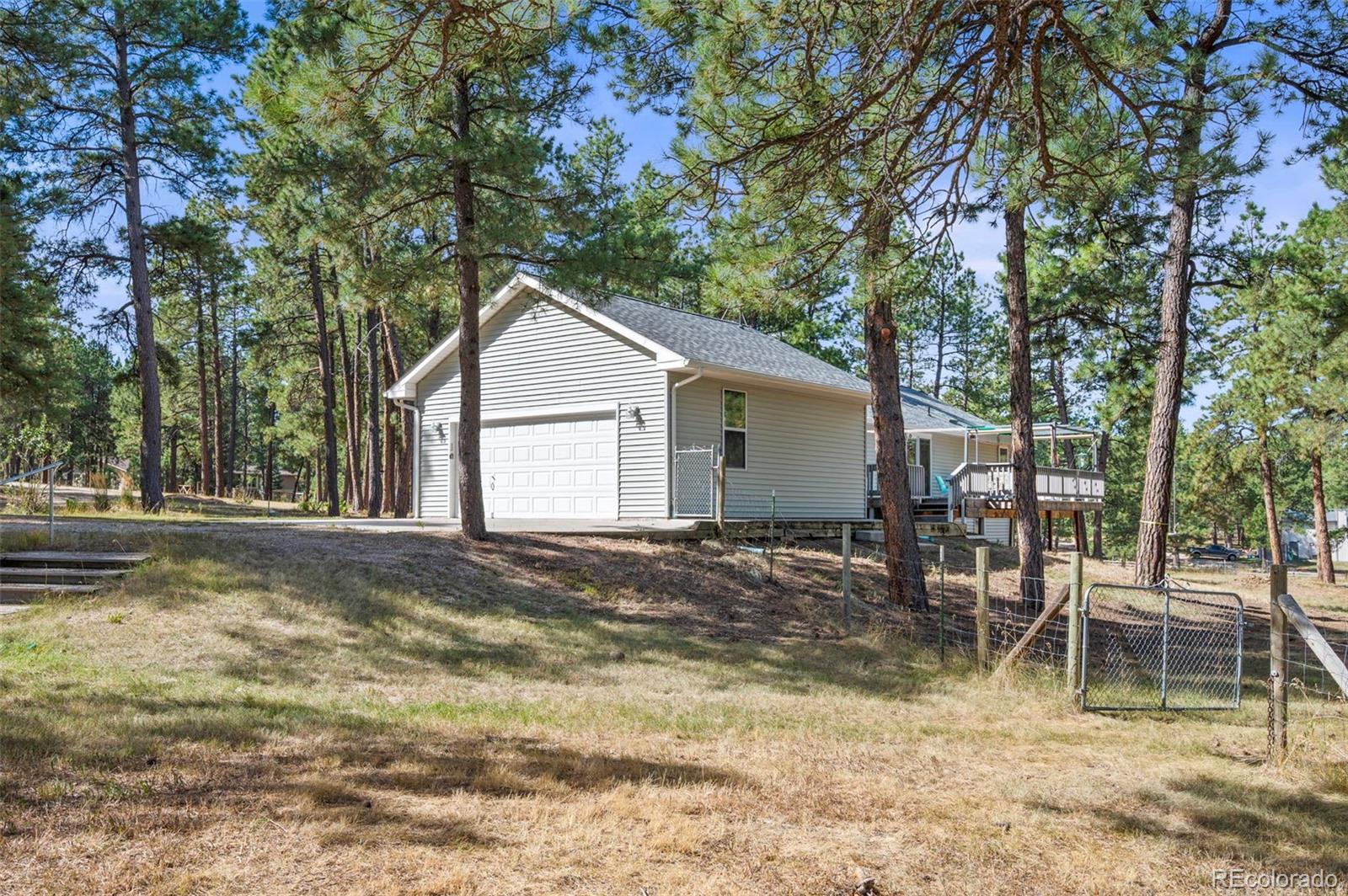 This spacious ranch home offers single-level living on five acres in Elizabeth. At the center of the home, a large living room with a fireplace connects to the dining area and kitchen, creating an easy flow for daily living and gatherings. The eat-in kitchen includes ample counter space, a pantry, and all essential appliances. The primary suite features a walk-in closet and a five-piece bath, while two additional bedrooms and a full bath are located on the opposite side of the home, providing a practical split-bedroom layout for privacy from the primary. A convenient laundry room sits near the attached two-car garage for everyday function. The home is move-in ready with fresh paint, new carpet and neutral finishes ready for your customization. Outdoor living is a highlight, with a covered front deck and back deck that both look out onto the peaceful forest setting. The mature trees provide both privacy and tranquility, offering a quiet retreat that can be enjoyed year-round. The home has been professionally fire mitigated to allow for easy homeowners insurance approval. The property is zoned RA-1, serviced by a private well and septic, and enhanced with recent upgrades such as a newer roof and new gutter guards. For the animal lover, the property is fully fenced with a gated entry and additional cross fencing for smaller pastures. There is a loafing shed with sliding doors if you'd like to bring any 4-legged friends. Or, for those without animals, you could utilize the storage sheds as a great place for lawn equipment, overflow storage, etc. With its acreage, privacy, and versatile layout, this home offers a true country lifestyle while remaining close to the community amenities of Elizabeth — an excellent opportunity to enjoy space and comfort in a serene location.