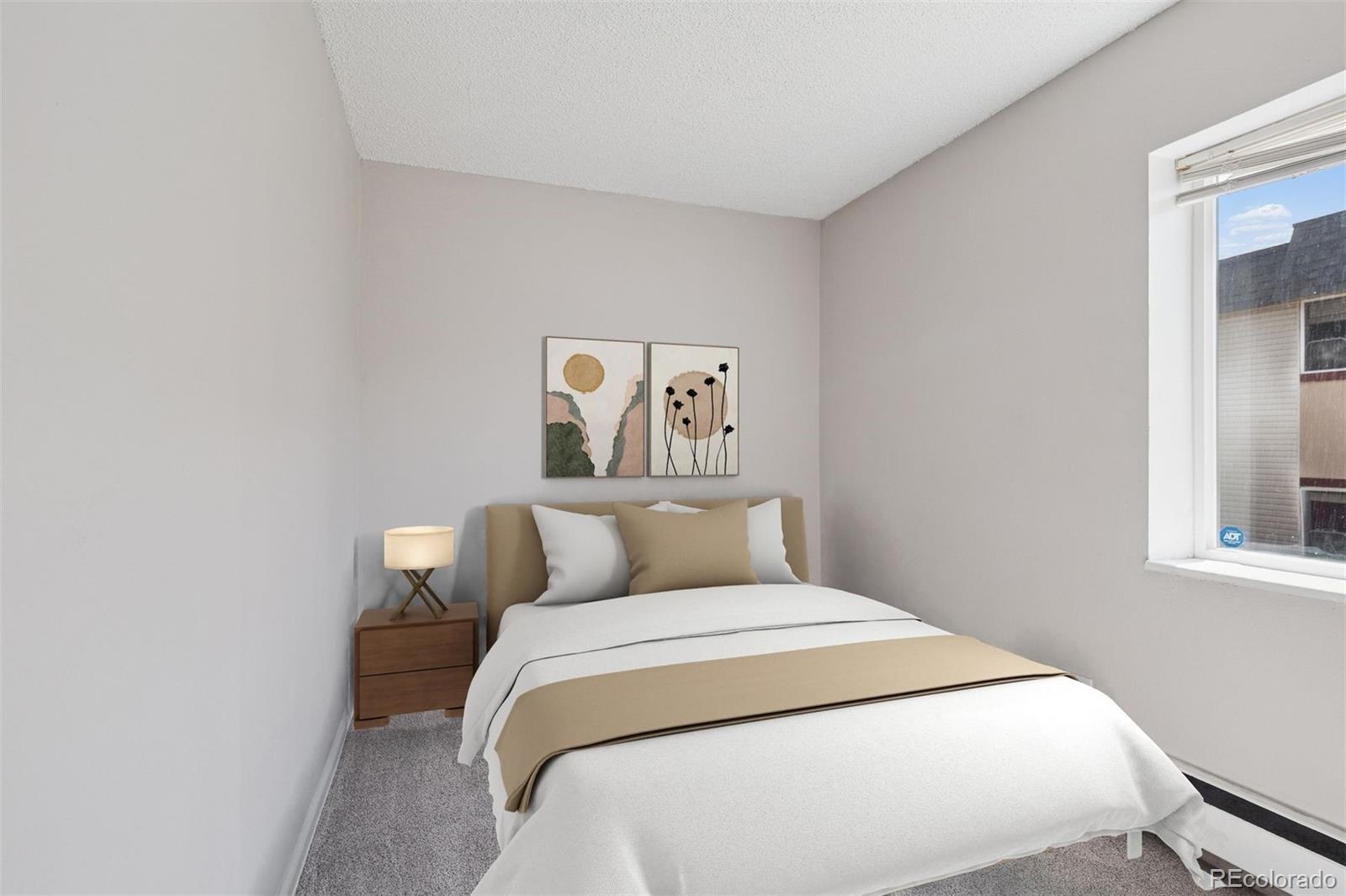 Don’t miss this updated and move-in ready 3 bedroom, 1 bathroom corner unit with 859 sq. ft. of comfortable living space! This is one of the best values in the Denver metro area! Step inside to find a freshly painted home with newer carpet, newer windows, and plenty of natural light. The kitchen offers abundant cabinet space, and convenient peninsula countertop! You’ll also enjoy the added convenience of an in-unit washer and dryer! Unit includes the ring peep hole camera and ADT security system featuring motion sensors, and door and window sensors! This west-facing unit boasts beautiful mountain views and sits in a well-maintained community offering fantastic amenities including a swimming pool, basketball courts, expansive greenbelt areas and plenty of parking spaces. The HOA covers water, heat, and exterior maintenance! Ideally located with quick access to highways, shopping, and just a short commute to downtown Denver, this vacant condo is ready for a fast move-in. Property has virtual staging of furniture in some photos.