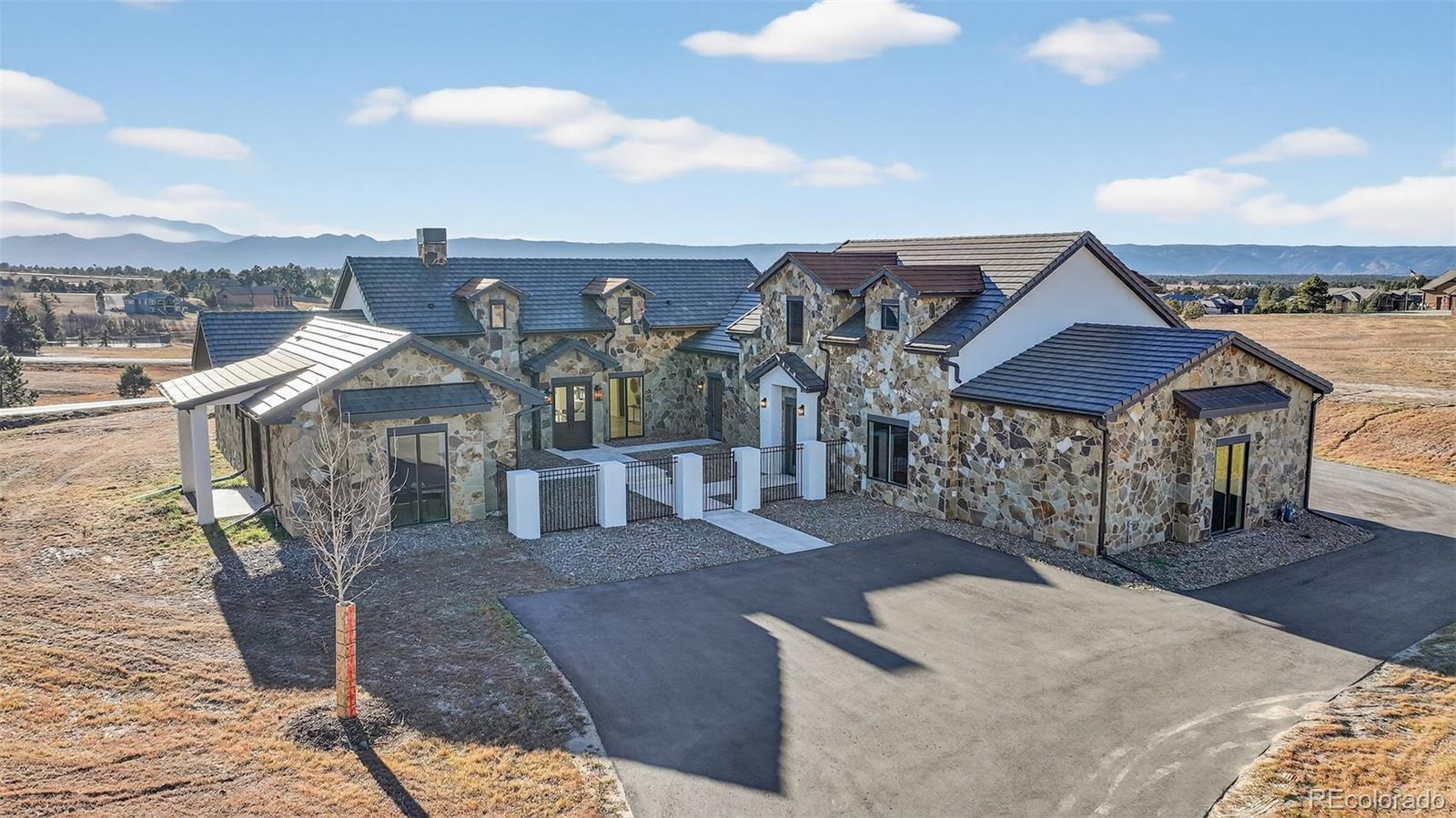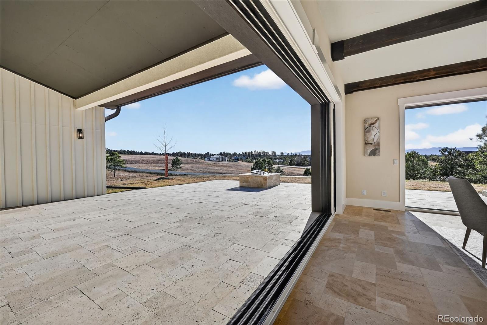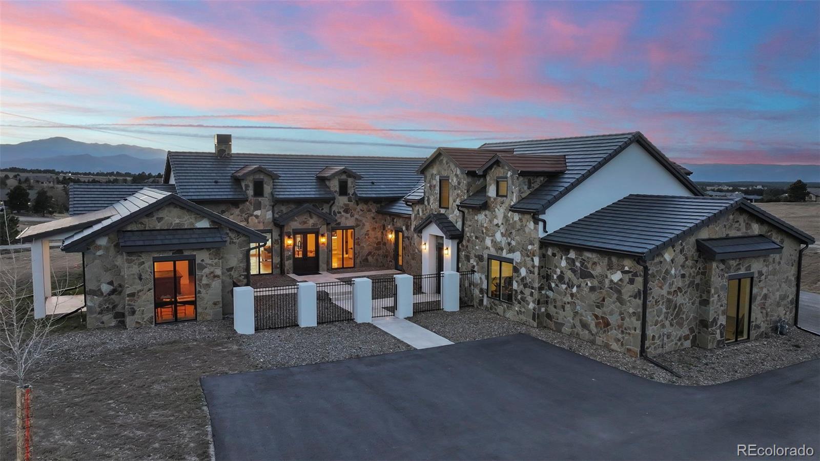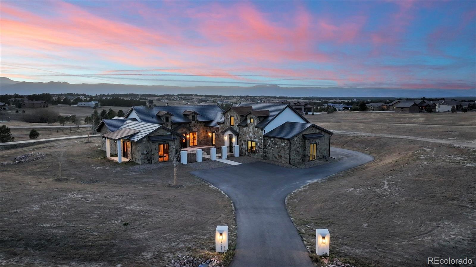 Escape the frenzied pace of Citylife! Enjoy a new lifestyle at picturesque Settler's Ranch just 5 miles east of I-25 at Exit 158. Enjoy unobstructed views of Pikes Peak 24 hours a day from your 2.5-acre homesite. Just 25 minutes from downtown Colorado Springs and 45 minutes from the Denver Tech Center, this setting offers the tranquility you've imagined would for your future. This Mark Berry Custom Designed home showcases many STANDARD FEATURES that would normally be considered EXTRAS, Travertine Tile is used throughout this 1.5 level home including surfaces for the outdoor front atrium and rear patio. The Solid Core Alder Doors throughout the home, along with Custom Cabinetry, Box Beams, and Door Trims are fashioned from the builder's mill shop. Retractable Window Walls are spectacular features adjoining the great room and kitchen. All view corridors from the interior spaces are enhanced by the thoughtful placement of windows in all rooms. "Real" stone is used on the exterior as well as the Woodburning Fireplace. This desirable floor plan includes The Great room with fireplace, 17' ceilings (with box beams). The appealing and functional Kitchen area combines practical space with preparation essentials including island with farmer's sink. The rear galley area is thoughtfully designed allowing the 'chef of the day' the quiet space needed for their special guests! The Master Bedroom Suite features full views of Pikes Peak, double vanities, a Euro-Style step-in shower, soaking tub, and walk-in closet. The 2nd Junior Suite (north side of floor plan) offers guests complete privacy while the 3rd Flex-Room (office, 3rd bedroom, library, gym) has its own entry & exits. The 4+ Bay garage (fits 6 vehicles) and well suited for additional storage. Ample guest parking surrounds the entry to the home