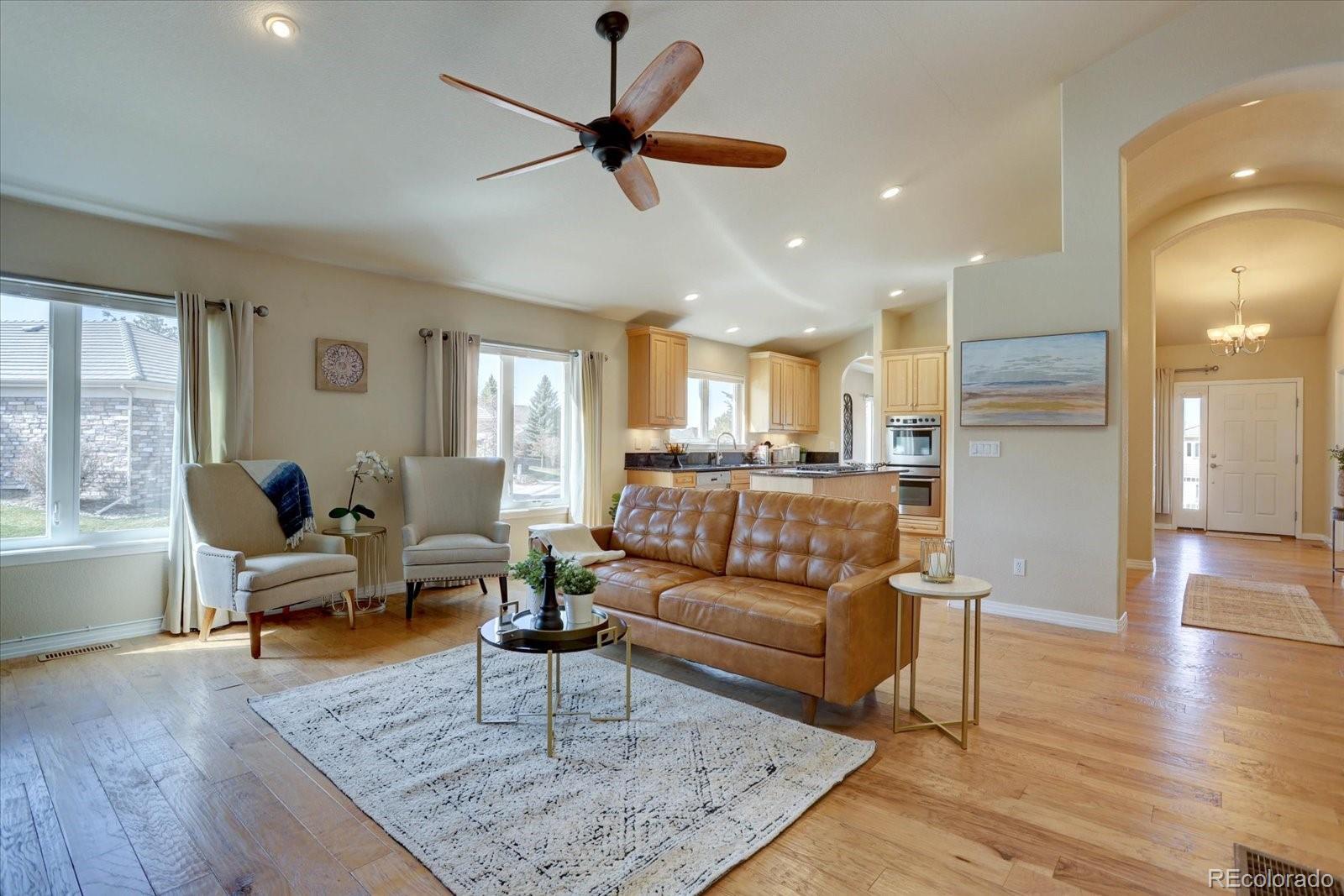 This fabulous town home is situated in an exclusive, gated community and has a plethora of features. Walk in to a spacious entry featuring an office and formal dining area opening to a balcony via French doors. The kitchen boasts a gas range, newer stainless appliances, and in-wall, double oven. A vaulted ceiling and large gas fireplace is the stunning vocal point of the family room, creating an open but delineated floor plan. The spacious primary bedroom is adjoined with a 5 piece bathroom and double closets. The finished basement allows for entertaining or recreational actives with a work out room, bonus room and two additional bedrooms. You will appreciate the two car attached garage, proximity to the community pool, and mailboxes. Shopping, dining and easy access to Cherry Creek State Park is just a stones throw away. This well maintained property has only one shared wall and everything you need to enjoy a Maintence free, Colorado lifestyle!