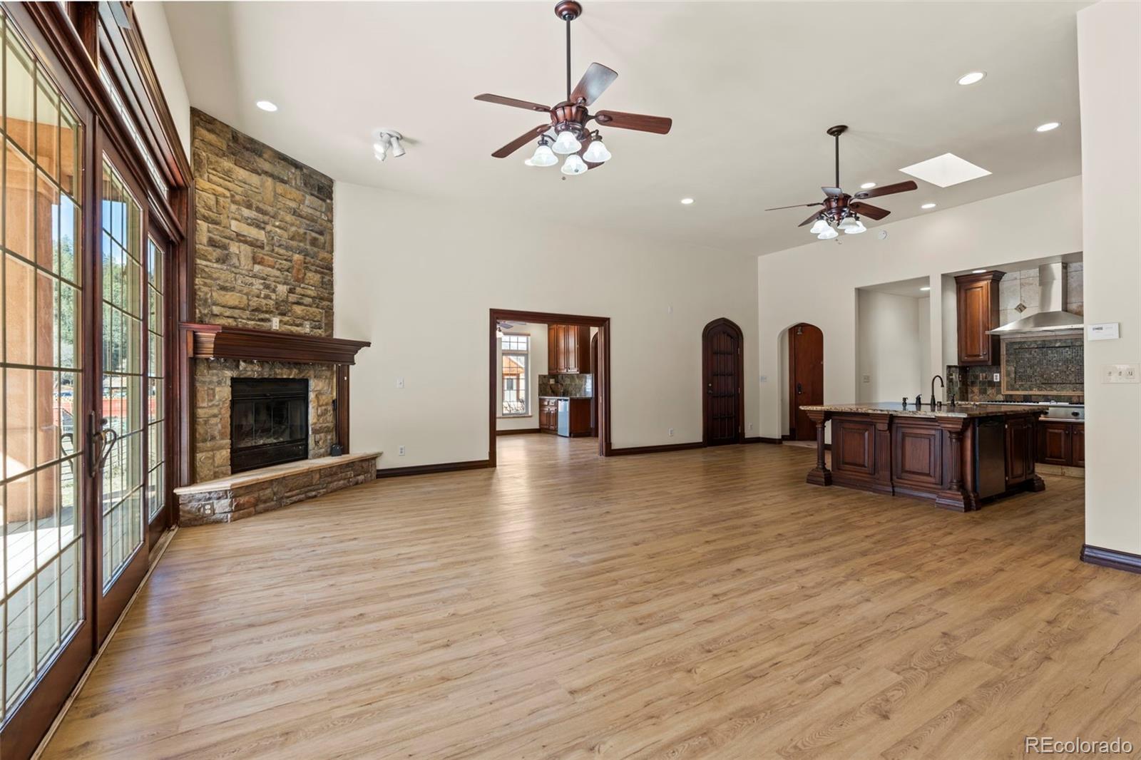 Built-in Features, Ceiling Fan(s), Five Piece Bath, High Ceilings, Kitchen Island, Open Floorplan, Primary Suite, Stone Counters, Walk-In Closet(s), Wet Bar
