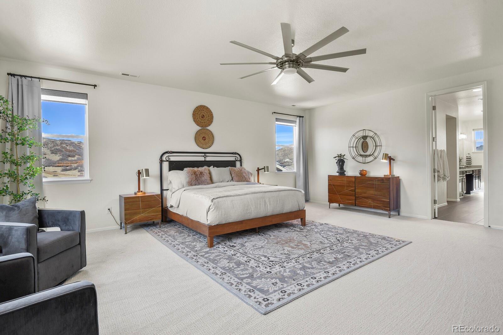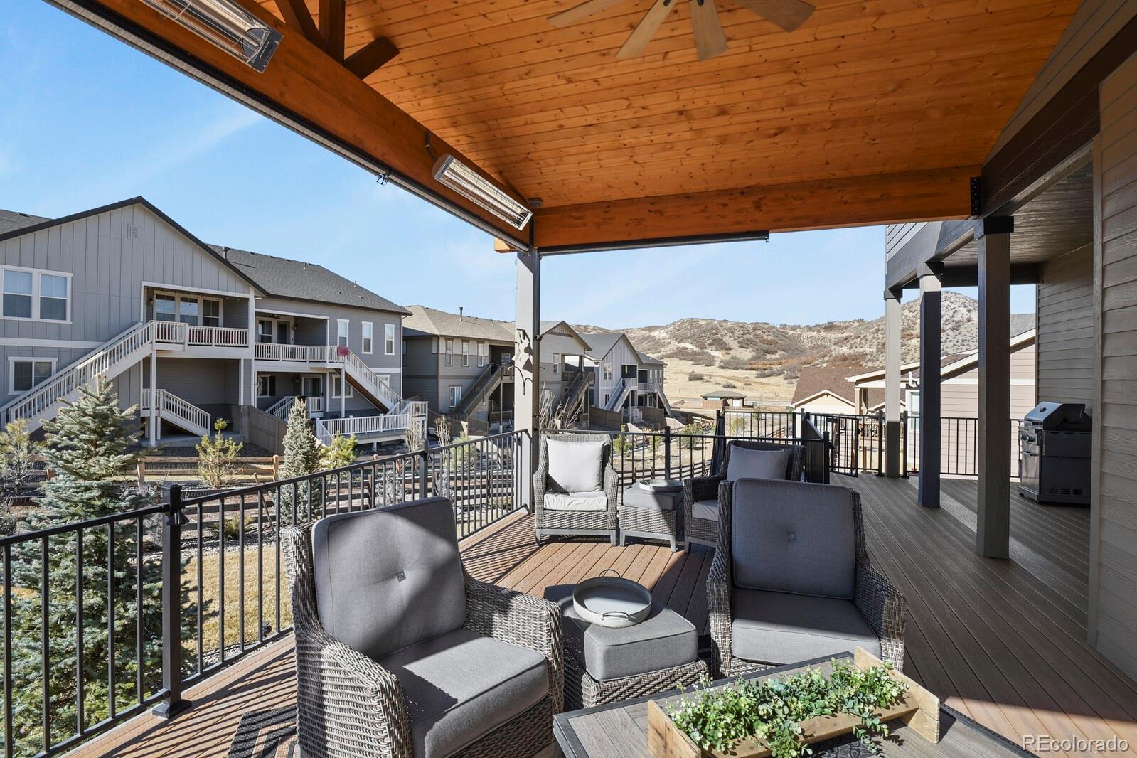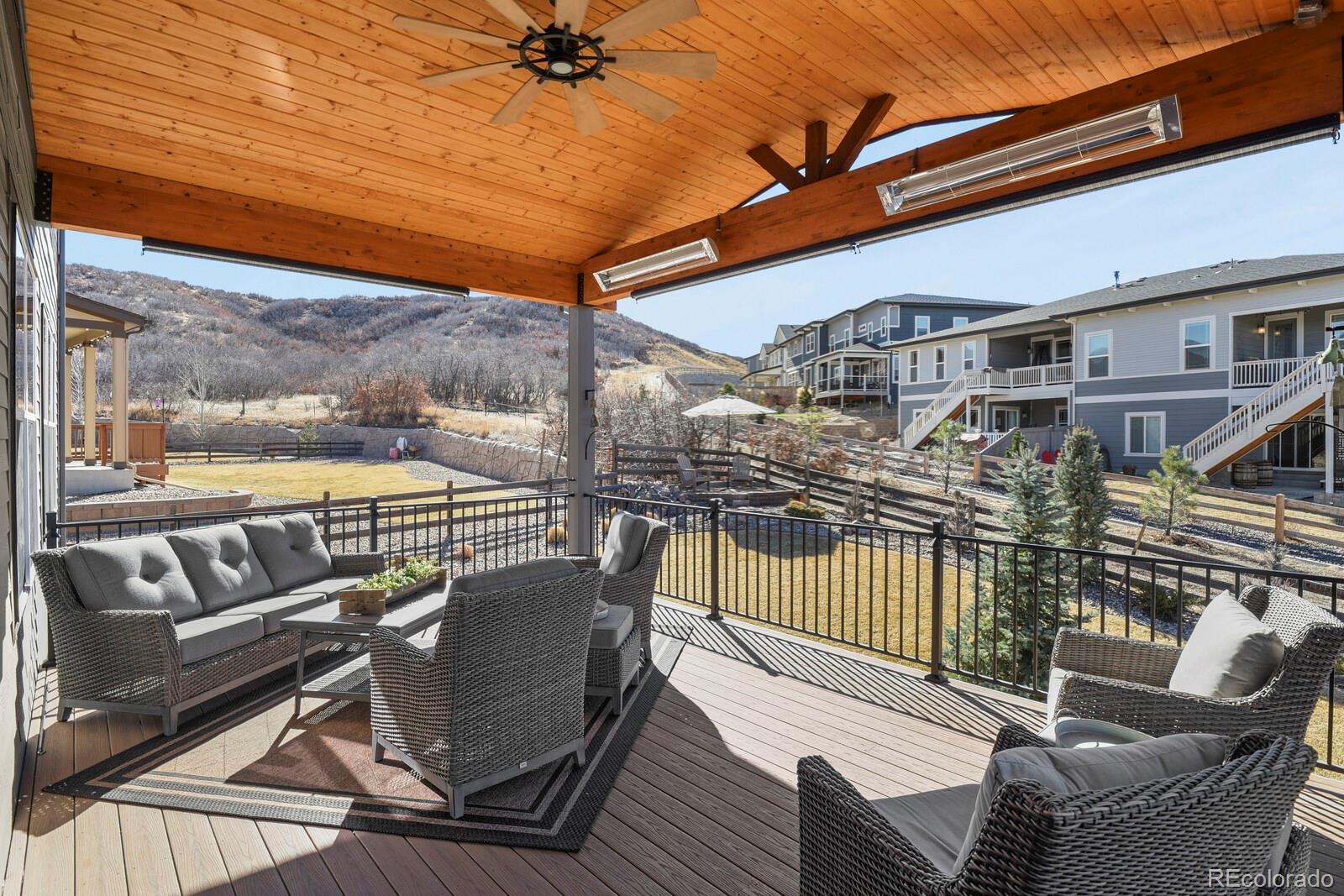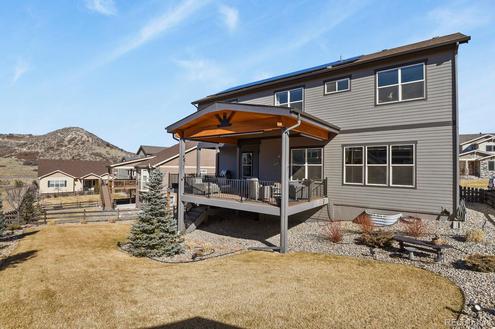 Welcome to this turnkey and meticulously cared for home in the Park Preserve community of Castle Rock, offering thoughtful upgrades, a great layout, and direct trail access behind the home. This property blends comfort, function, and the Colorado lifestyle. The home also benefits from a lower property tax rate and low association fees compared to The Meadows and many newer build communities such as Crystal Valley. The main level features high ceilings, hardwood floors, and abundant natural light throughout the open living space. The kitchen is ideal for everyday living and entertaining with a large center island, high-end stainless-steel appliances including double ovens and a gas cooktop, generous cabinetry, and a walk-in pantry. The living and dining areas flow easily, creating a welcoming space to gather. A main floor guest suite with a private bath and walk in closet provides flexibility for visitors or multi-generational living. Upstairs includes a spacious loft, laundry room, and three additional bedrooms, including a large primary suite. The primary retreat features dual walk-in closets, double vanities, a large walk-in shower, and a private water closet. The unfinished basement offers excellent storage and future potential. The backyard is a true extension of the home with a beautiful large custom covered deck that captures hillside views and includes ceiling heaters along with privacy and sunshades, creating a cozy space for outdoor entertaining and relaxation year-round. Mature landscaping enhances privacy, while the trail behind the home provides direct access to Philip S. Miller Park, Ridgeline Open Space, and the Adventure Complex. Recent improvements include fully owned solar panels, interior and exterior paint, radon mitigation, new carpet, HVAC duct cleaning, updated lighting and hardware, a storm and security front door, refreshed landscaping, and three car garage spaces.