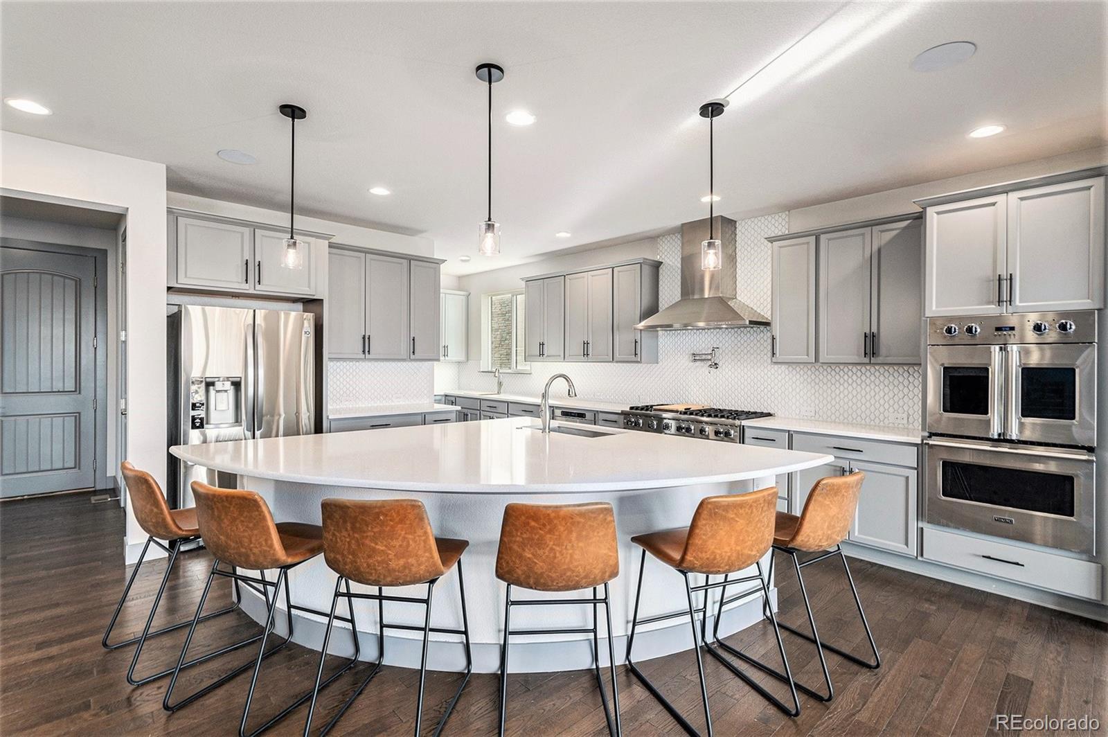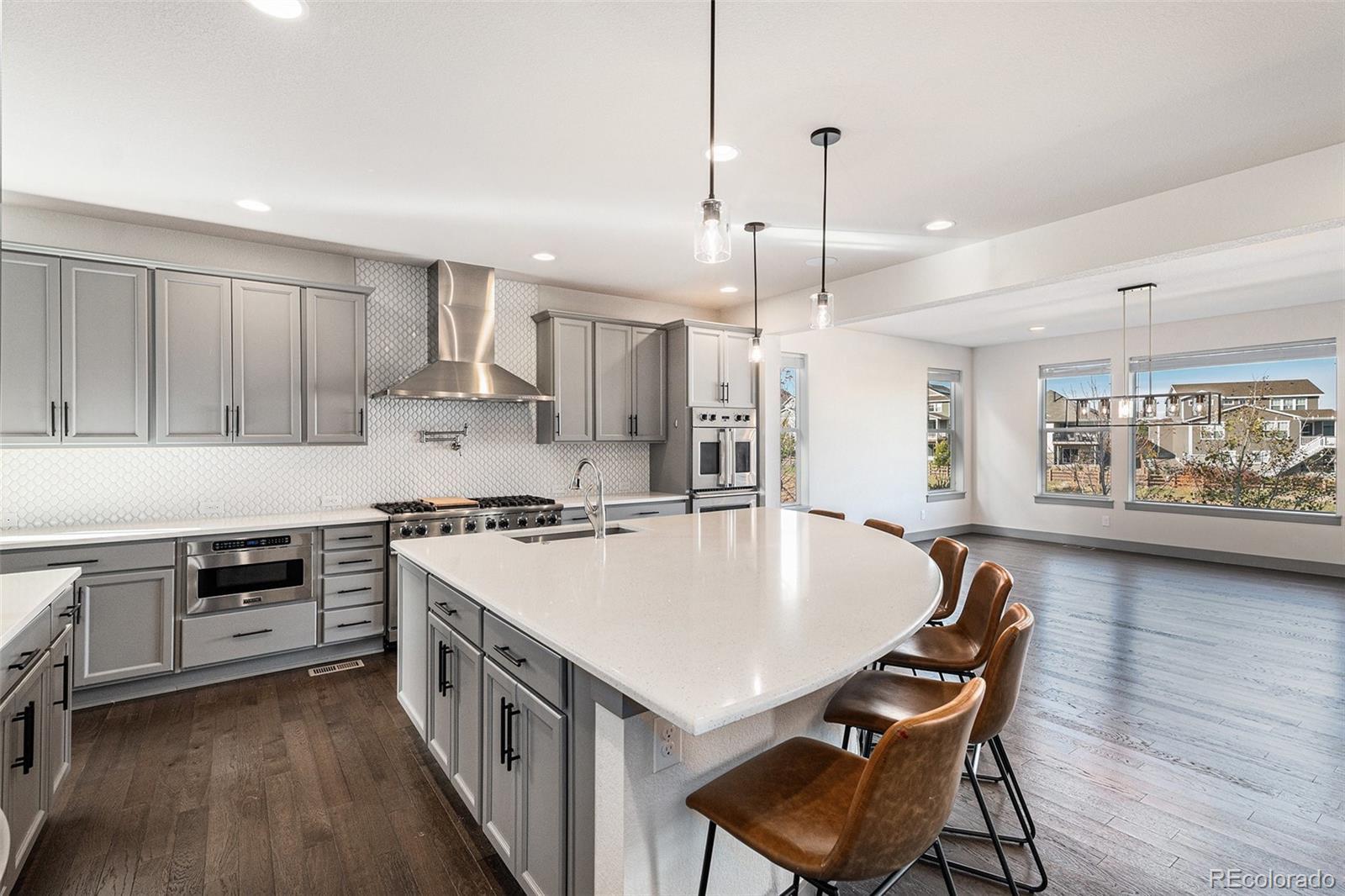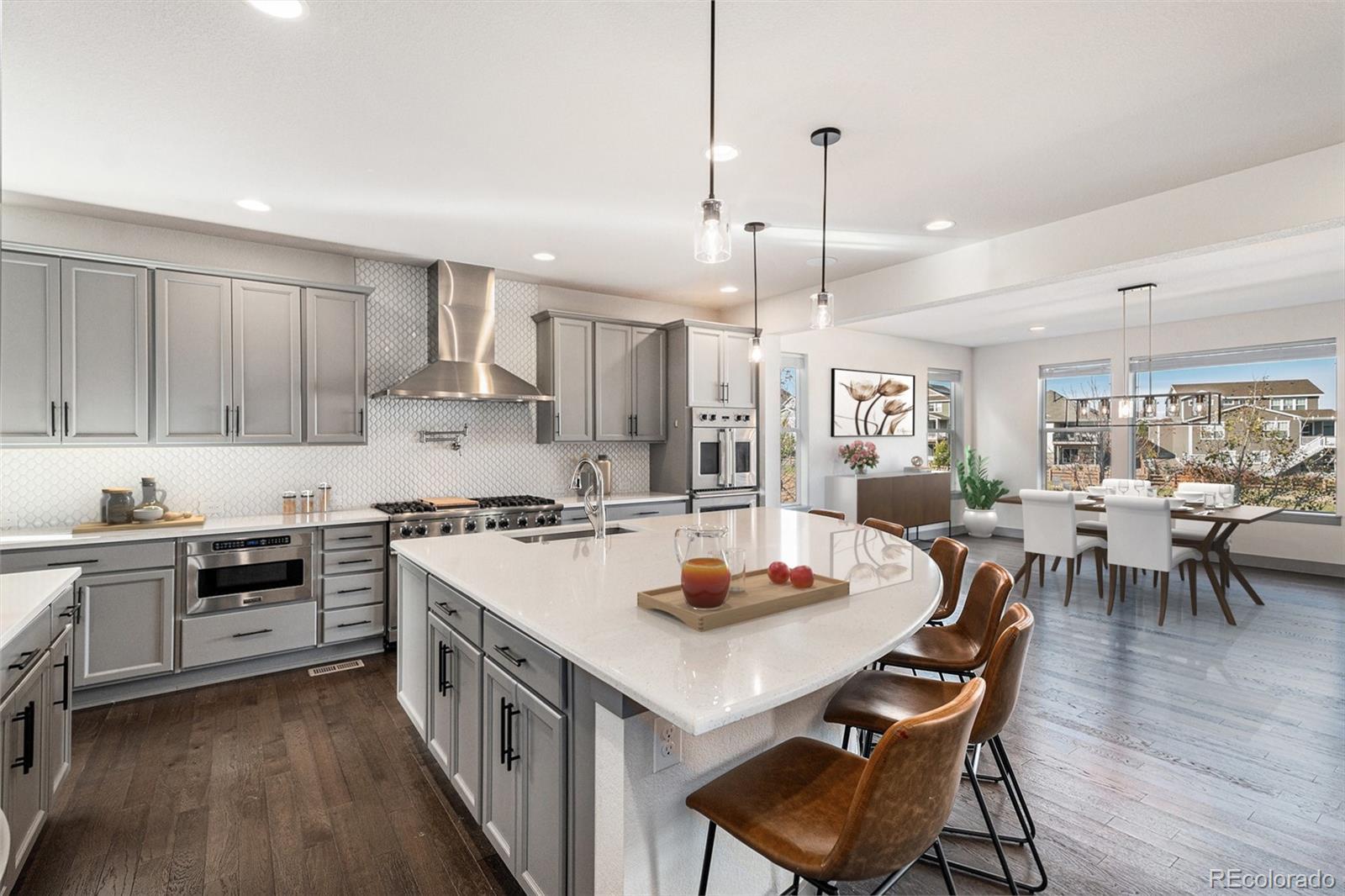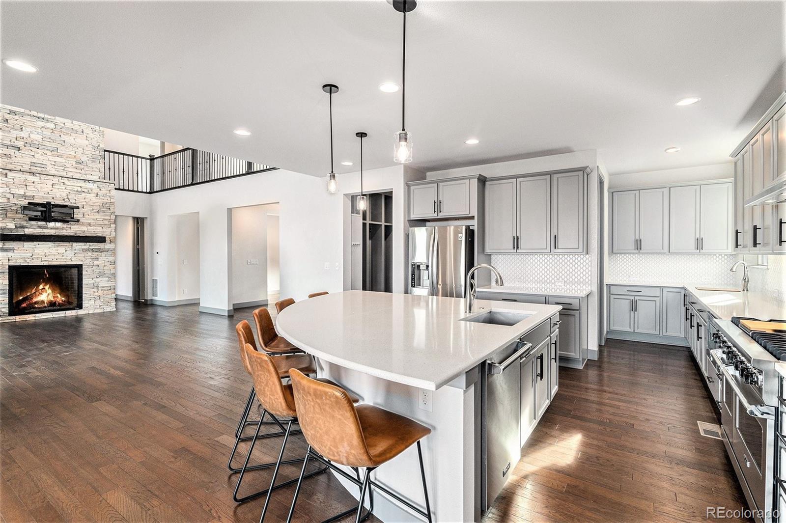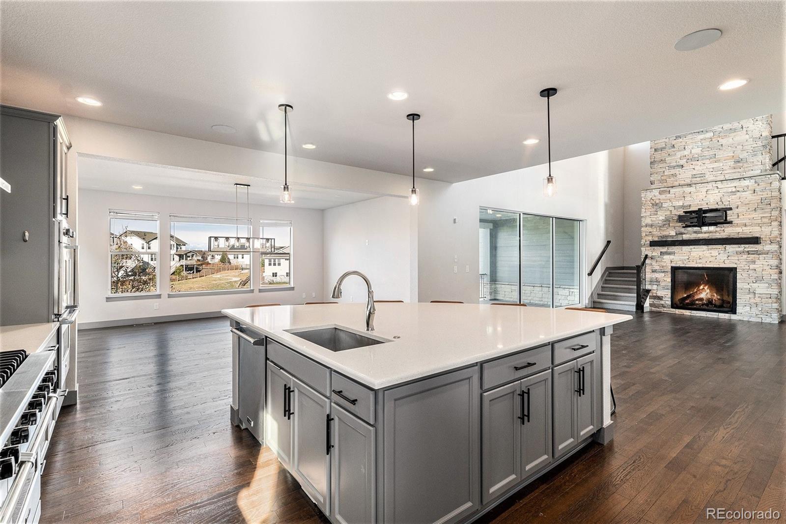 Welcome home to Whispering Pines! Tucked away and backing to peaceful open space, this beautifully crafted home blends sophistication, comfort, and Colorado charm. Step inside to a dramatic two-story living area filled with sunlight and centered around a striking floor-to-ceiling stone fireplace that creates an inviting gathering place. The heart of the home is the gourmet kitchen designed for those who love to cook and entertain, showcasing a spacious island, Viking appliances—including multiple ovens (4!) and a pot filler—an expansive walk-in pantry, and a separate prep kitchen that keeps everything organized behind the scenes. Thoughtful built-ins in the office and mudroom add style and function to everyday life. The main-level primary suite is a true retreat, offering dual walk-in closets, double vanities, and a spa-inspired shower. A second main-level bedroom with its own en-suite bath provides flexibility for guests, family, or a home office setup. Every bedroom throughout the home enjoys its own private bathroom, while the airy upstairs loft overlooking the great room offers an ideal reading nook, play space, or casual lounge. The professionally finished walkout basement extends the living area with generous recreation and media spaces, plus an unfinished section perfect for a home gym or extra storage. A built-in central vacuum system with a toe-kick sweep adds convenience and efficiency. Step outside to your private sanctuary—professionally landscaped with a covered deck, lower patio, and beautiful mountain views. The backyard overlooks nearby trails, making it easy to enjoy morning strolls or evening sunsets. Entrance to the path is one house away. Whispering Pines offers resort-style amenities including an outdoor pool, clubhouse, and multiple playgrounds. Surrounded by mature trees and open space, it feels like a peaceful mountain escape—yet it’s just minutes from the Denver Tech Center, Parker, Southlands Mall, and E-470 for effortless commuting.