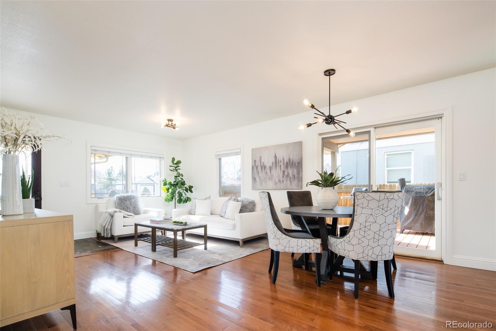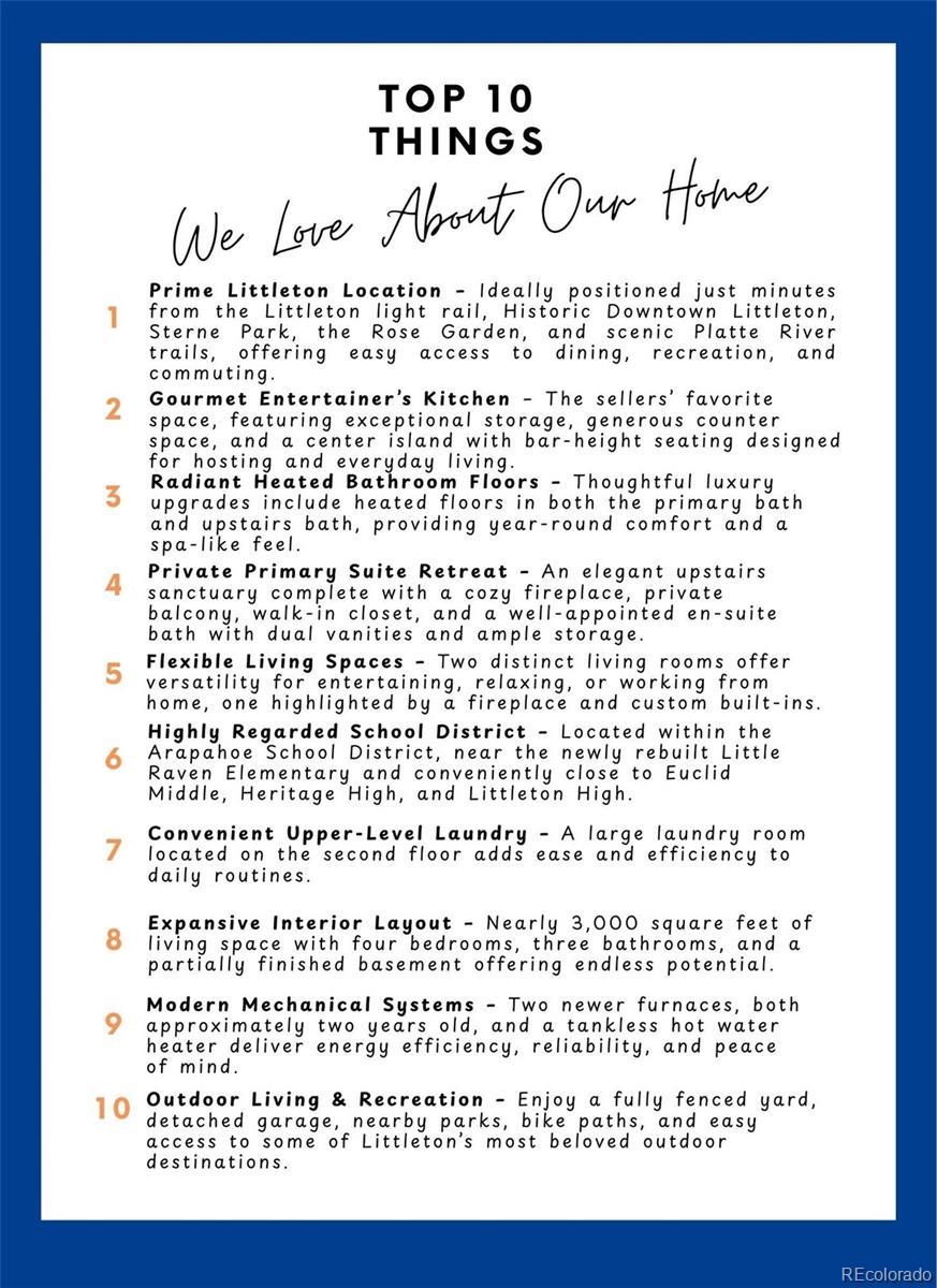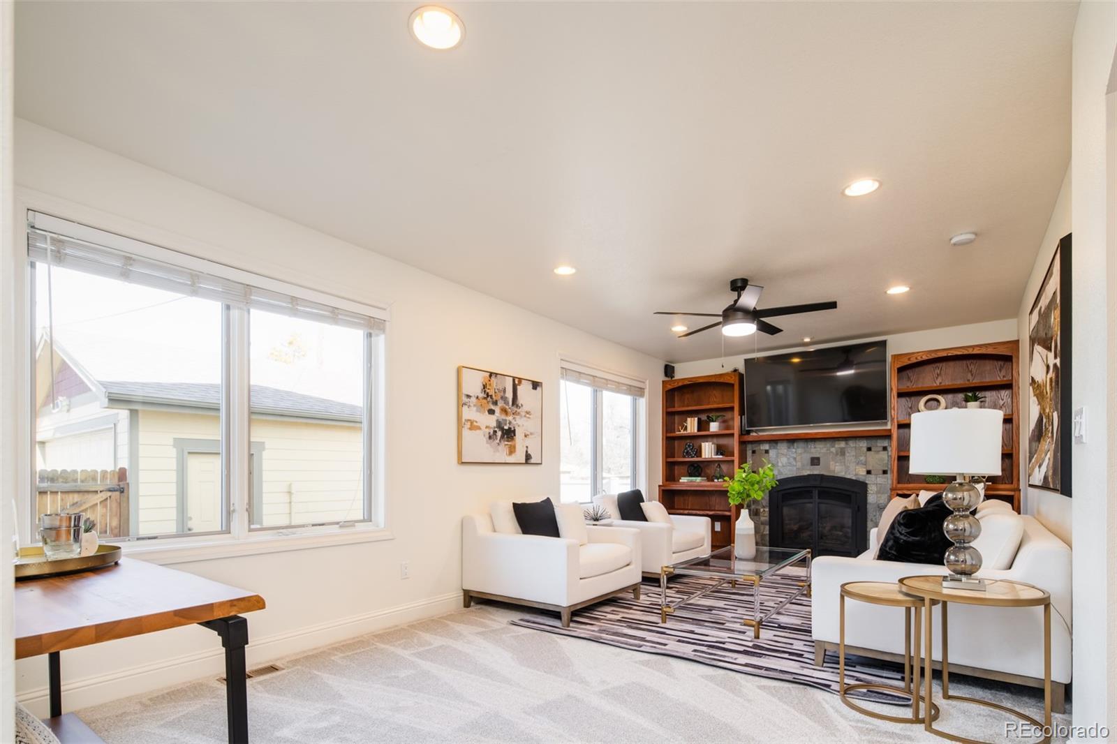 Experience the charm of Littleton from the comforts of this nearly 3,000-sq-ft sprawling bungalow. Trimmed with modern luxuries and stylish finishes, 4-beds and 3-baths are spread over two floors for privacy and easy living. Hosting friends and family is made effortless with two living rooms - one adorned with a cozy fireplace and built-ins. A gourmet kitchen is perfect for entertaining, featuring a center island with bar-height seating, pantry cabinets with pull out drawers and large walk in pantry. Beneath a decorative arch, a sunny dining area offers access to a fully fenced-in yard and a detached oversized 2 car garage. Two well-appointed bedrooms and a full-bath round out the main-floor, while upstairs, a third bedroom, an ever-convenient laundry room and a full-bath sit adjacent to the primary suite. Elegantly enhanced with a fireplace for chilly Colorado nights, the primary boasts a private balcony and walk-in closet as the adjoining ¾-bathroom features separate vanities, a large shower with dual showerheads, and ample shelving for cosmetic storage needs. The basement provides ample storage and a room that could be used as a game room, craft room or exercise room. Situated just a mile south of Historic Downtown Littleton, near Sterne and Gallup Parks, with access to scenic trails and bike paths, and within close proximity to neighborhood schools, this location is highly desirable. This is a remarkable home in a great neighborhood - come check it out today!