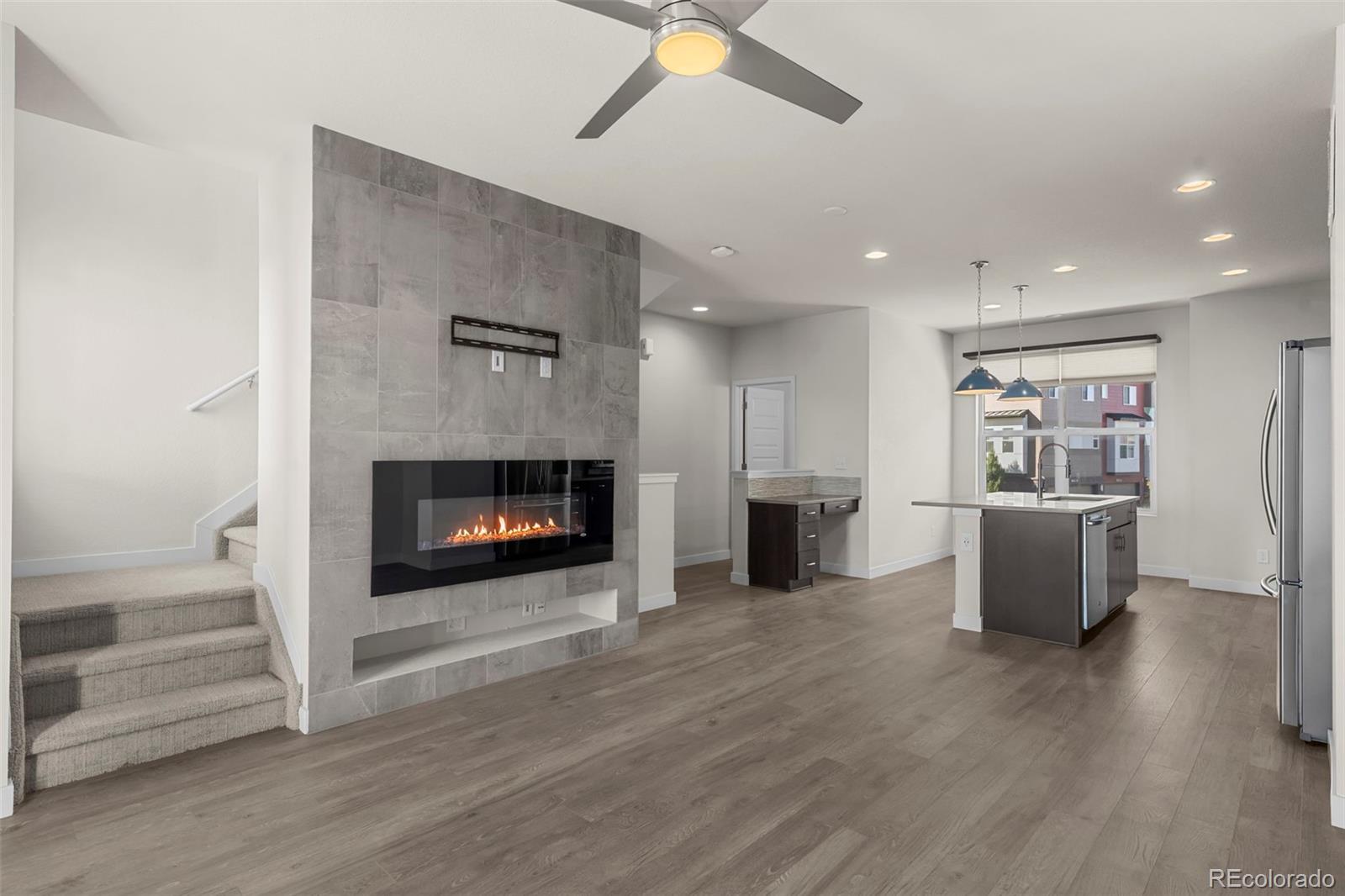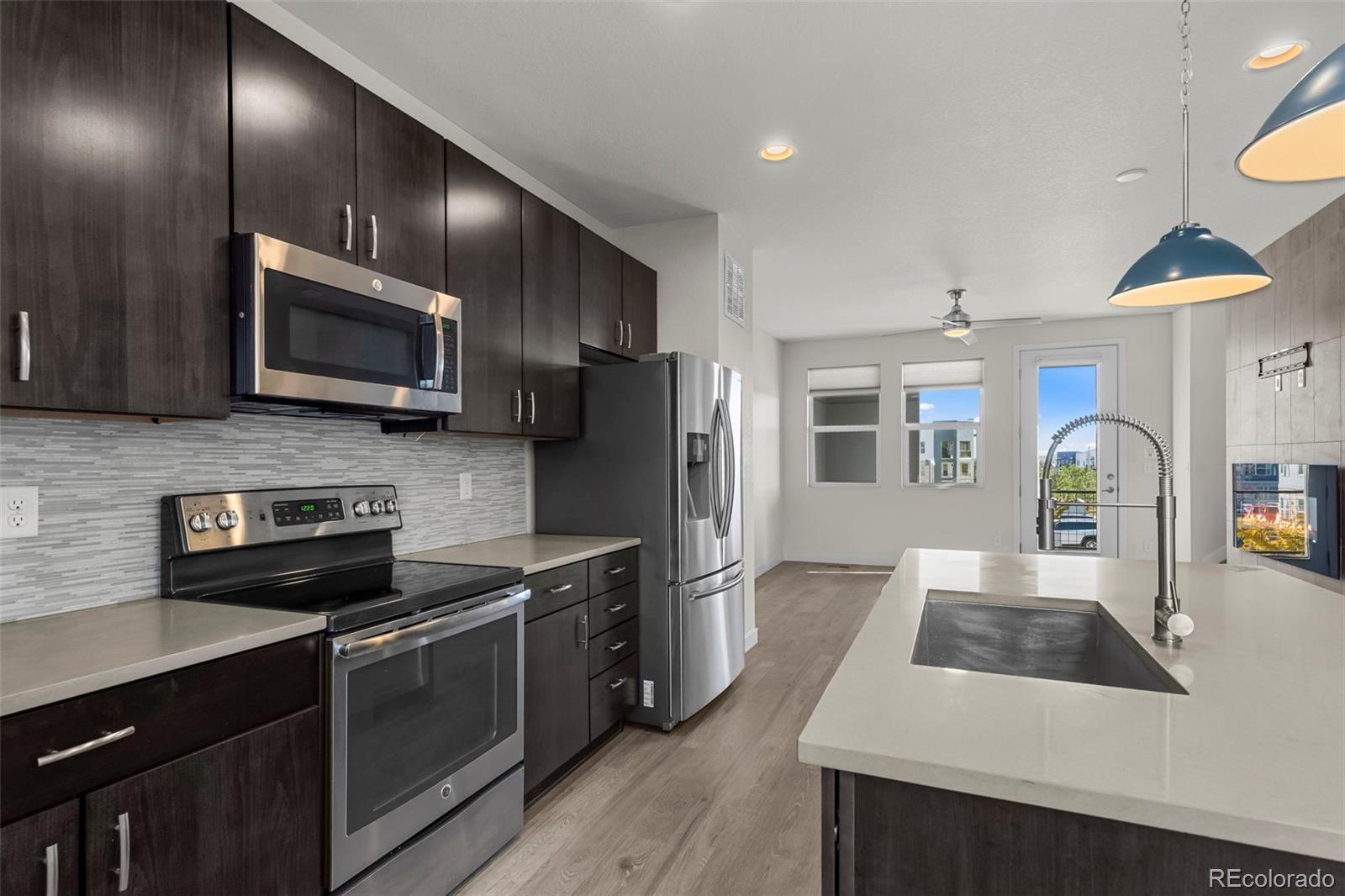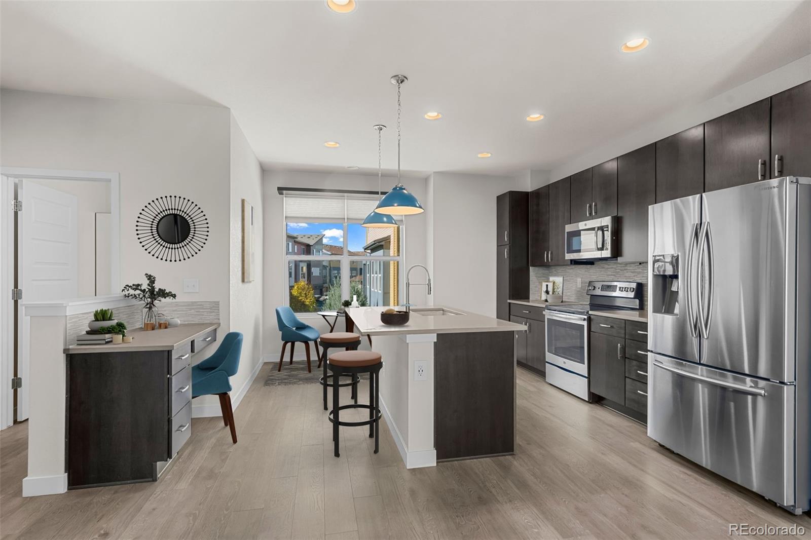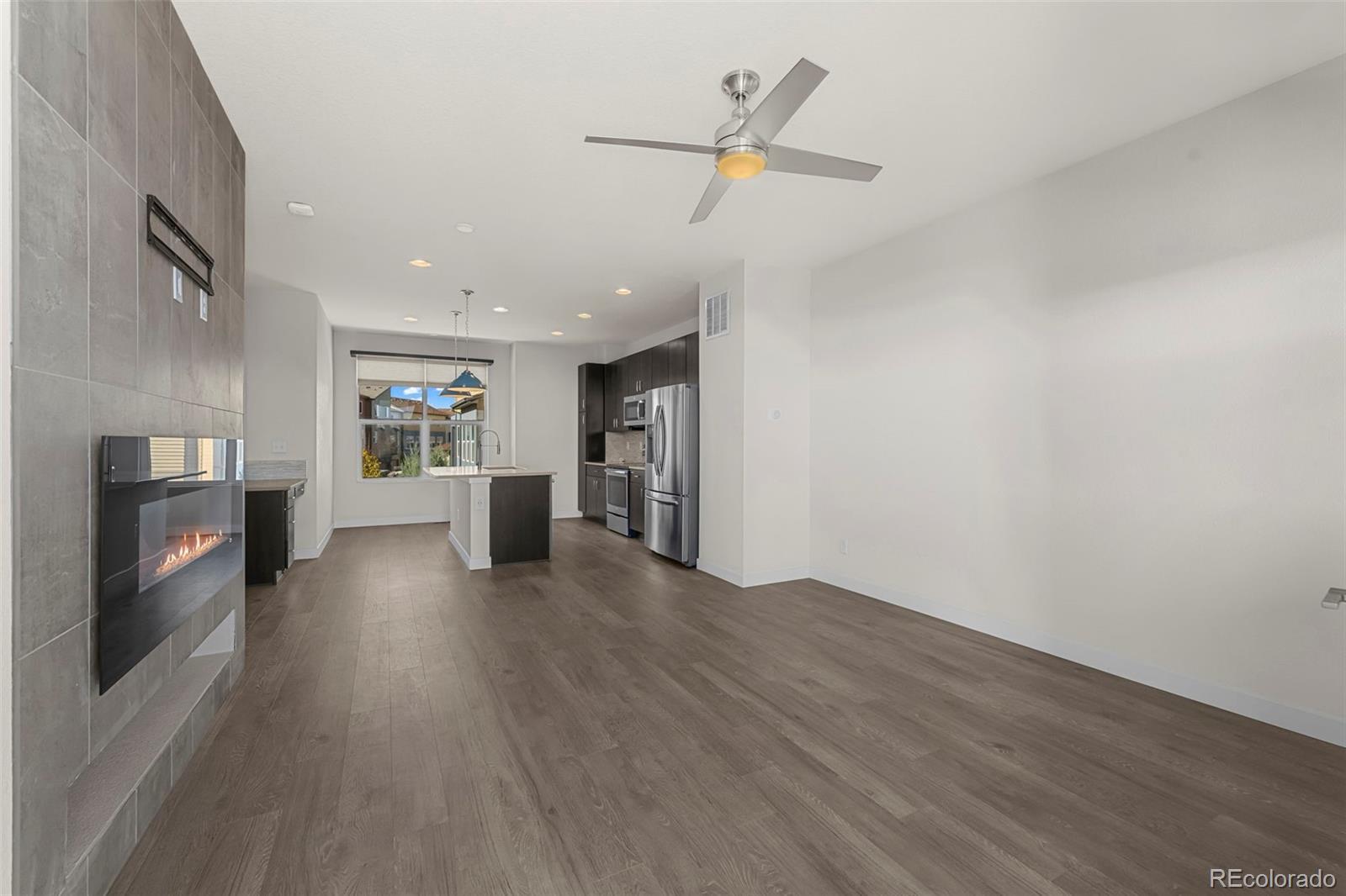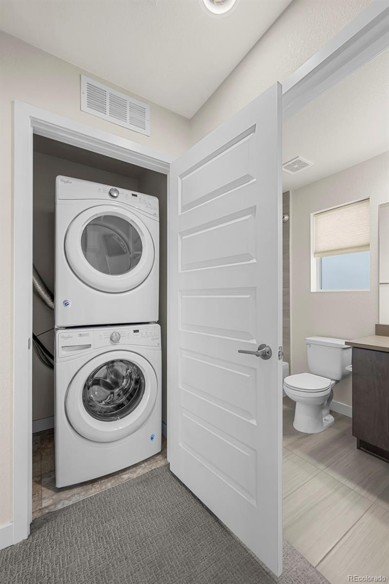 Discover effortless, modern living in this stylish and contemporary townhome nestled in the vibrant and sought-after Arista community in Broomfield. Ideally located just a short walk to Redpoint Community Park, and neighborhood dining, coffee spots, local brewery, and the transit at Arista Town Center, offering unparalleled convenience to both Boulder & Denver. Designed for comfort and ease, this beautifully maintained home perfectly blends low-maintenance living with sophisticated finishes and a convenient 2-car attached garage. Step inside to find an open-concept main-level living space with wide-plank grey-tone LVP flooring and abundant natural light. The inviting living room centers around a sleek, modern electric fireplace creating the perfect atmosphere for relaxing or entertaining. The adjoining kitchen showcases espresso cabinetry, quartz counters, stainless appliances, and an under mount sink. A large center island provides ample seating space, while a built-in desk nook offers a convenient area for work or study. A stylish powder bath completes the main floor. Upstairs, the spacious primary suite features a walk-in closet and private ensuite bath. The second bedroom is equally comfortable and sits adjacent to a full bathroom and laundry space with included stackable washer & dryer. Additional highlights include a covered balcony off the main-level living space, perfect for morning coffee or evening happy hours, and a covered front patio offers extra outdoor enjoyment. Enjoy a true "lock-and-leave" lifestyle and LOW HOA FEES in this desirable community with a dynamic mix of restaurants, shops, entertainment, and parks, all within walking distance. Easy access to Hwy 36 makes commuting to either Denver or Boulder effortless, from this low-maintenance, move-in ready home in a thriving community.