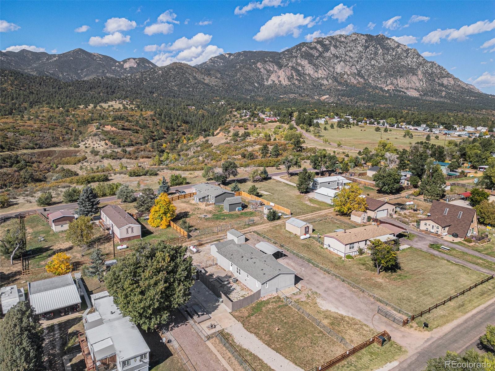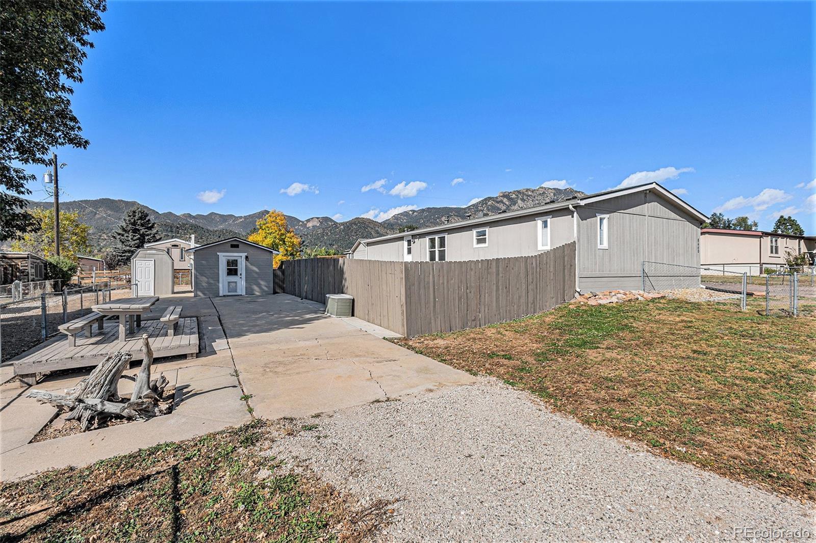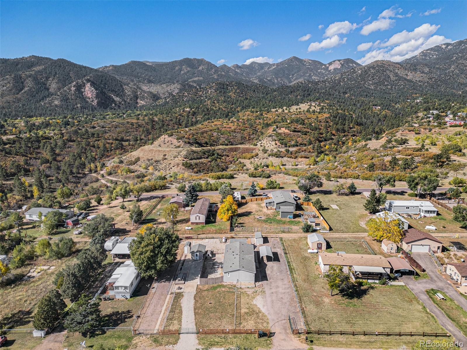 Move-In Ready Home Near Cheyenne Mountain – Expansive Lot, Breathtaking Mountain Views & Limitless Potential! This 0.46-acre property offers stunning Cheyenne Mountain views from every angle & the perfect blend of space & comfort. The cozy, well-maintained home features a living room, bonus room/office, dining area & kitchen w/ breakfast bar, pantry, gas range & ample cabinetry—ideal for cooking & entertaining. A/C keeps the home comfortable year-round & a pellet stove (Comfort Built) in the living room provides maximum heat output w/ a top-mounted hopper & heavy-duty steel design. The primary suite offers a relaxing retreat w/ a large adjoining bath, dual vanities & a freestanding glass shower. Two additional bedrooms, 2nd full bath & a functional laundry room w/ cabinets, shelving, built-in ironing board & walk-out access to the expansive deck complete this inviting interior. Step outside & embrace the best of country living. Imagine relaxing mornings on your deck, enjoying gentle mountain breezes, or evenings under a canopy of stars in your peaceful, private setting. The fully fenced lot is divided into 3 oversized chain-link areas, perfect for pets, toys, RVs, or boat storage. The property offers 3 SHEDS, a DOG HOUSE & a separate COTTAGE/DRY SHED (approx. 16x12) featuring electricity, sink, toilet integrated with the septic system & a kitchenette w/ microwave & mini fridge—ideal for guests, hobbies, or a home office retreat. A detached carport near the front provides covered parking w/ additional open parking nearby. The oversized gravel driveway provides convenient entry, complemented by two alley access points. Nestled on a quiet street w/ no HOA or covenants, this home delivers the charm of rural living w/ just minutes from Fort Carson, downtown Colorado Springs & Cheyenne Mountain State Park. Country living w/ the conveniences of the city—where rolling open spaces, fresh mountain air & a slower pace of life meet modern comfort and functionality.