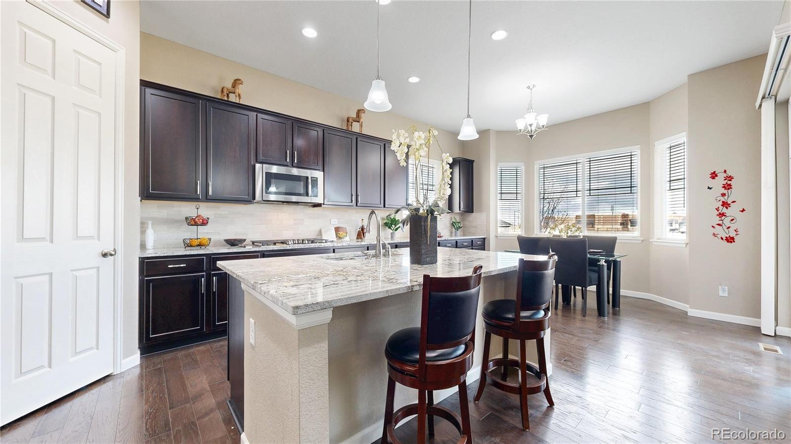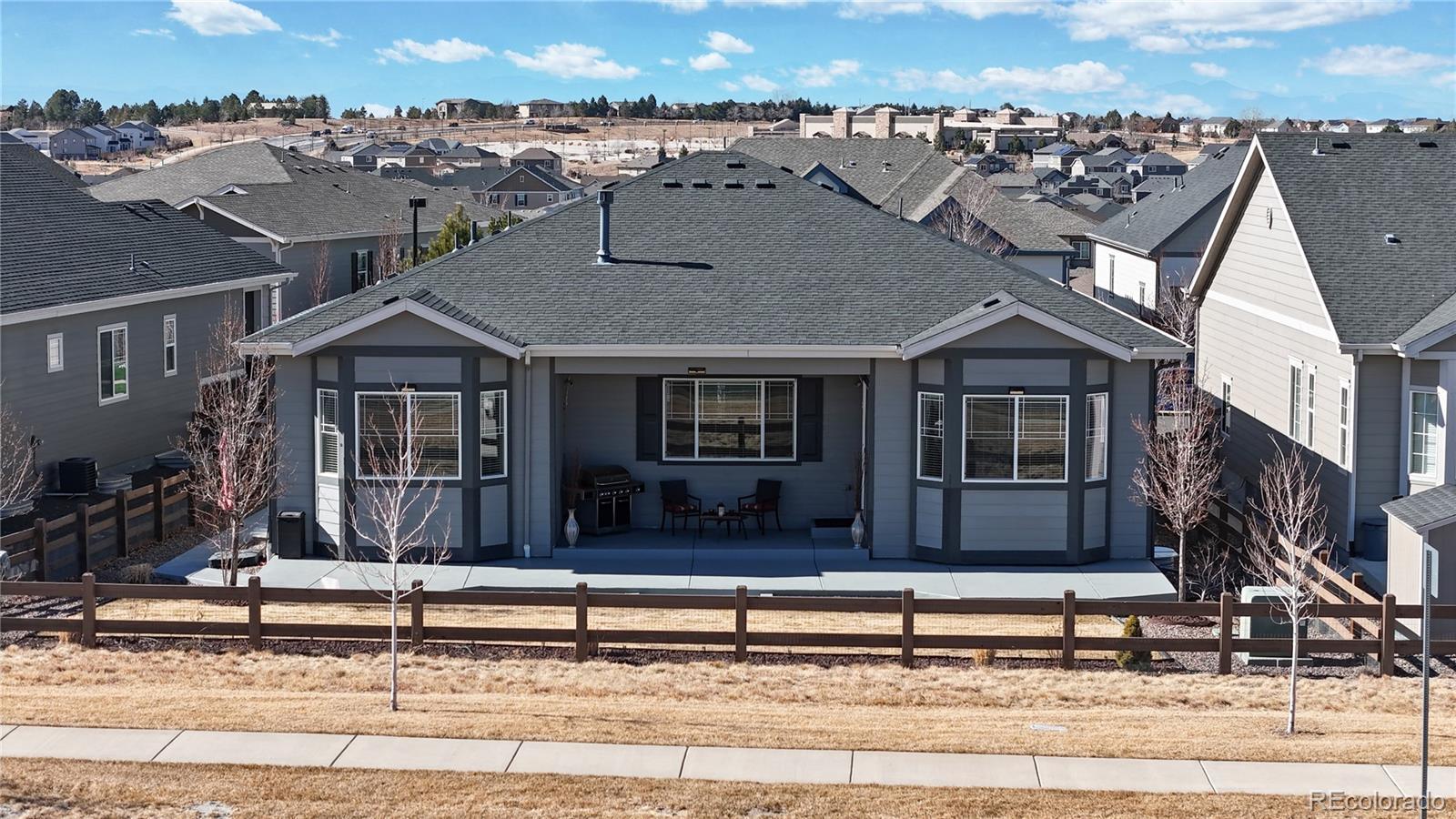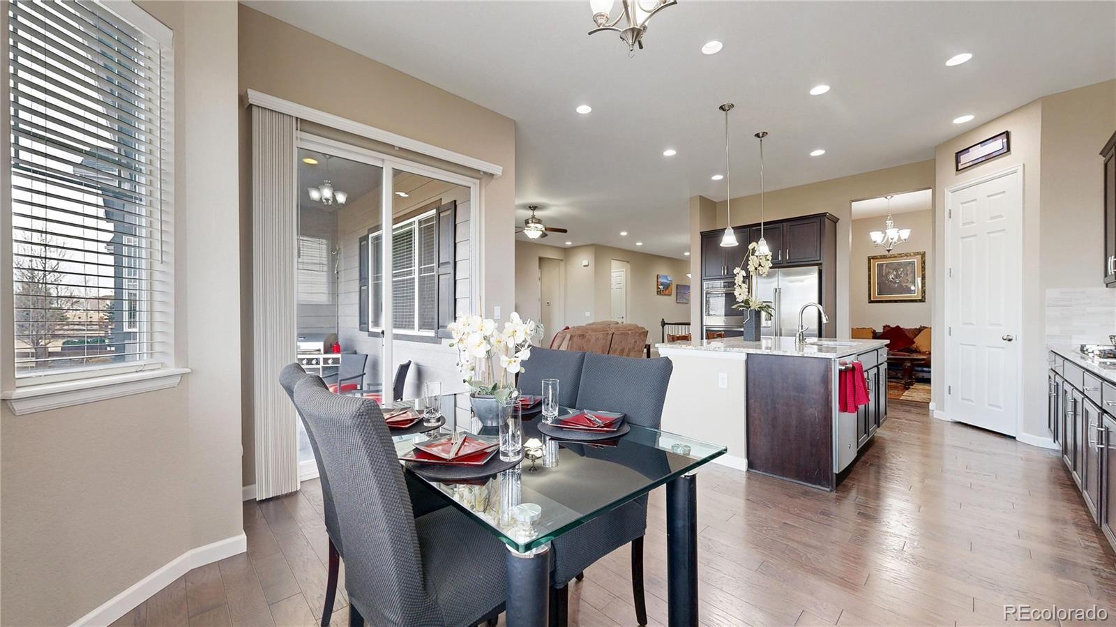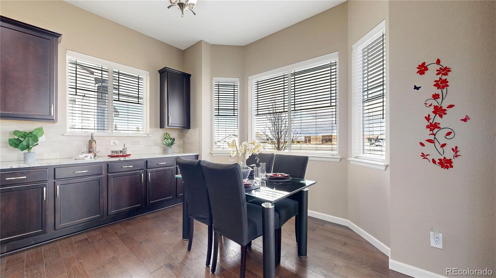 Southshore 4-bedroom, 4-bath Ranch Style home in SE Aurora with a finished basement with an open floor plan and plenty of main-level living space. Highly coveted 3-car oversized finished garages. A few blocks away from the Luxury Southshore clubhouse, pool, trails, and neighborhood parks. The backyard is fenced, professionally landscaped with garden lighting, and an oversized patio. There are neighbors on only two sides, which adds to the sense of space. Inside, the layout feels open and comfortable, with large picture windows that bring in beautiful natural light throughout the day. The main living areas feature hardwood floors, while the bathrooms and laundry room are finished with tile. Bedrooms and the lower level have upgraded carpet. The lighting throughout the home can be adjusted between two tones. The kitchen has granite slab countertops, extra cabinets for storage, and plenty of room to cook and gather. There is a flex space that works well as a home office, reading room, playroom, or whatever fits your lifestyle. The main floor primary bedroom is tucked away for privacy and features a large bay window, a spacious walk-in closet, and separation from the other bedrooms. The floor plan is designed so that guests, family or friends have their own space. There is also a grand entry to the finished basement, which makes the home feel more like a two-story home. Downstairs, the finished basement offers a very large second living area, two additional bedrooms/flex space, a bathroom, and an enormous storage room. Additional features include a three-car garage that is insulated, finished, and has upgraded flooring, an enhanced sprinkler system, exterior lighting, 9 camera security system, and a laundry room with a washer and dryer and plumbing for a future sink. Located in a top-rated school district with convenient access to E470, Denver International Airport, Southlands Mall, dining, and entertainment. Open House Sunday, February 15th 2:00 to 4:00 pm PM.