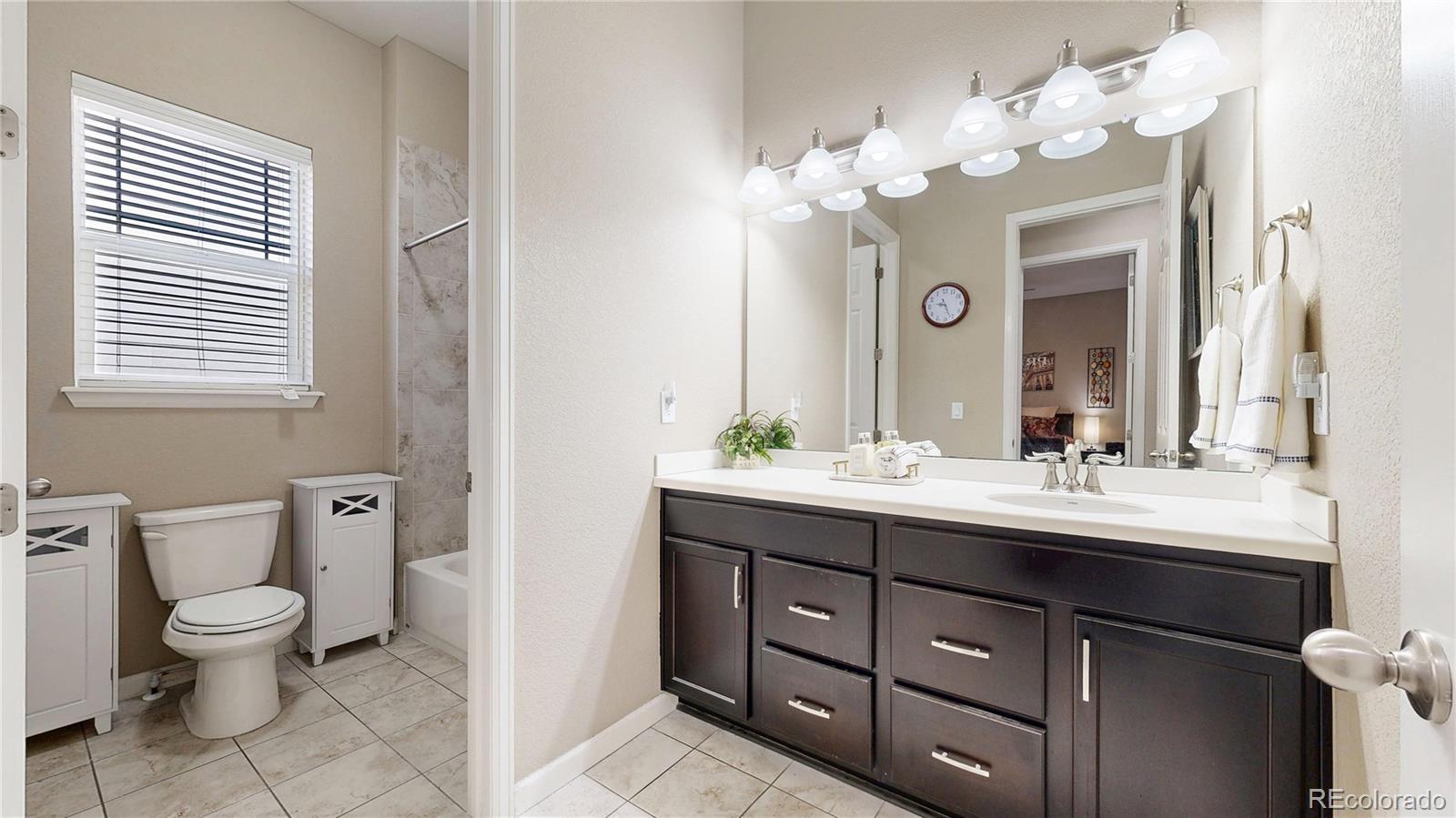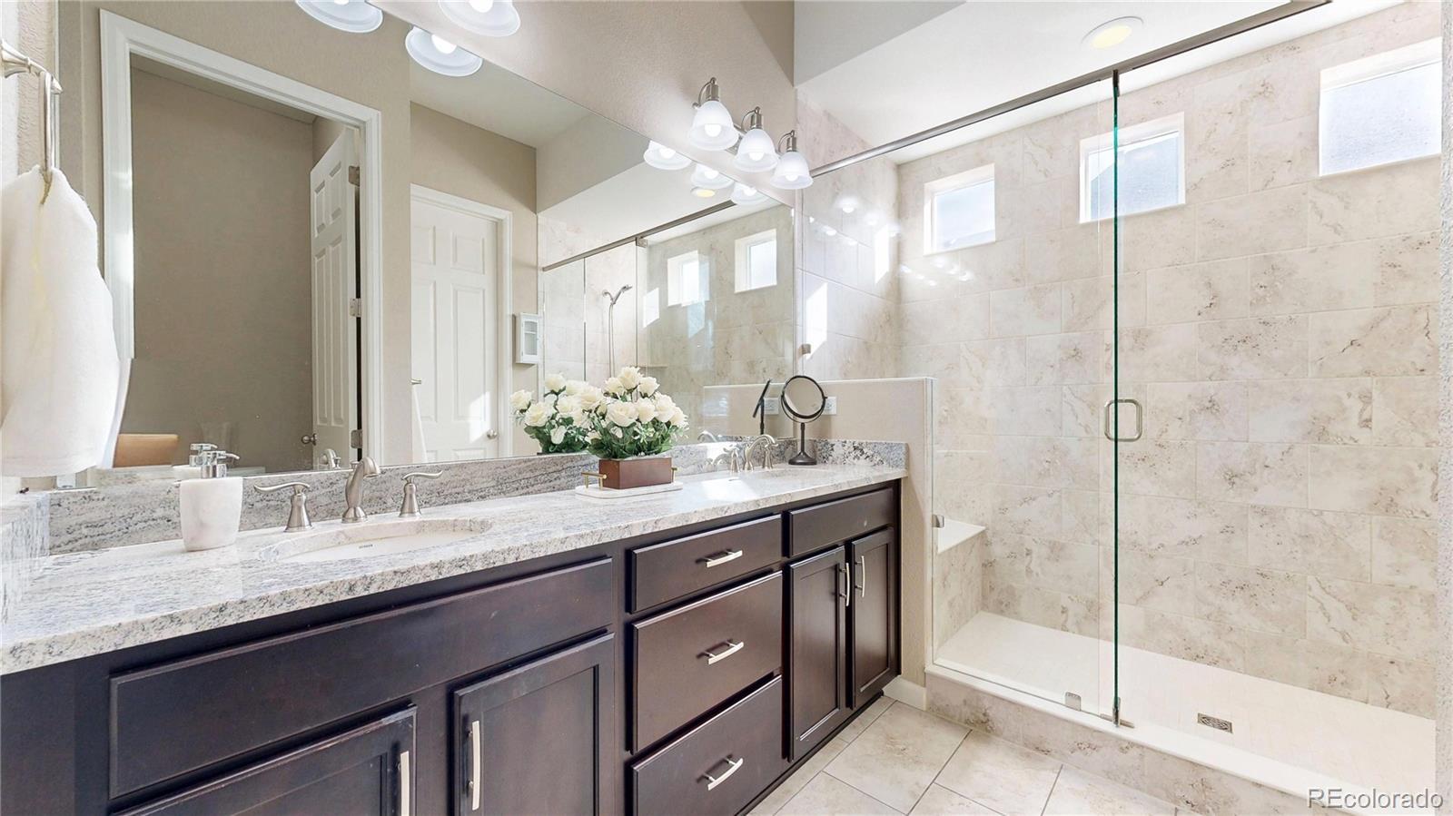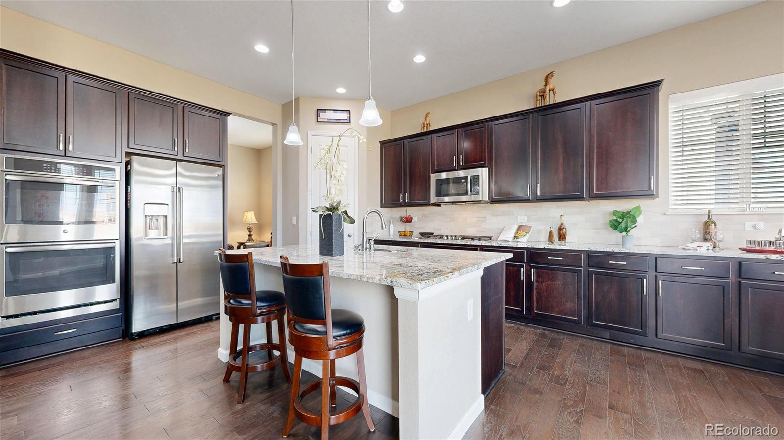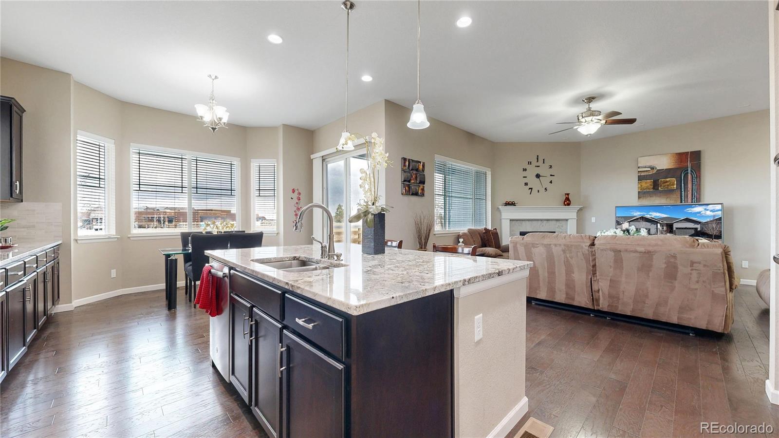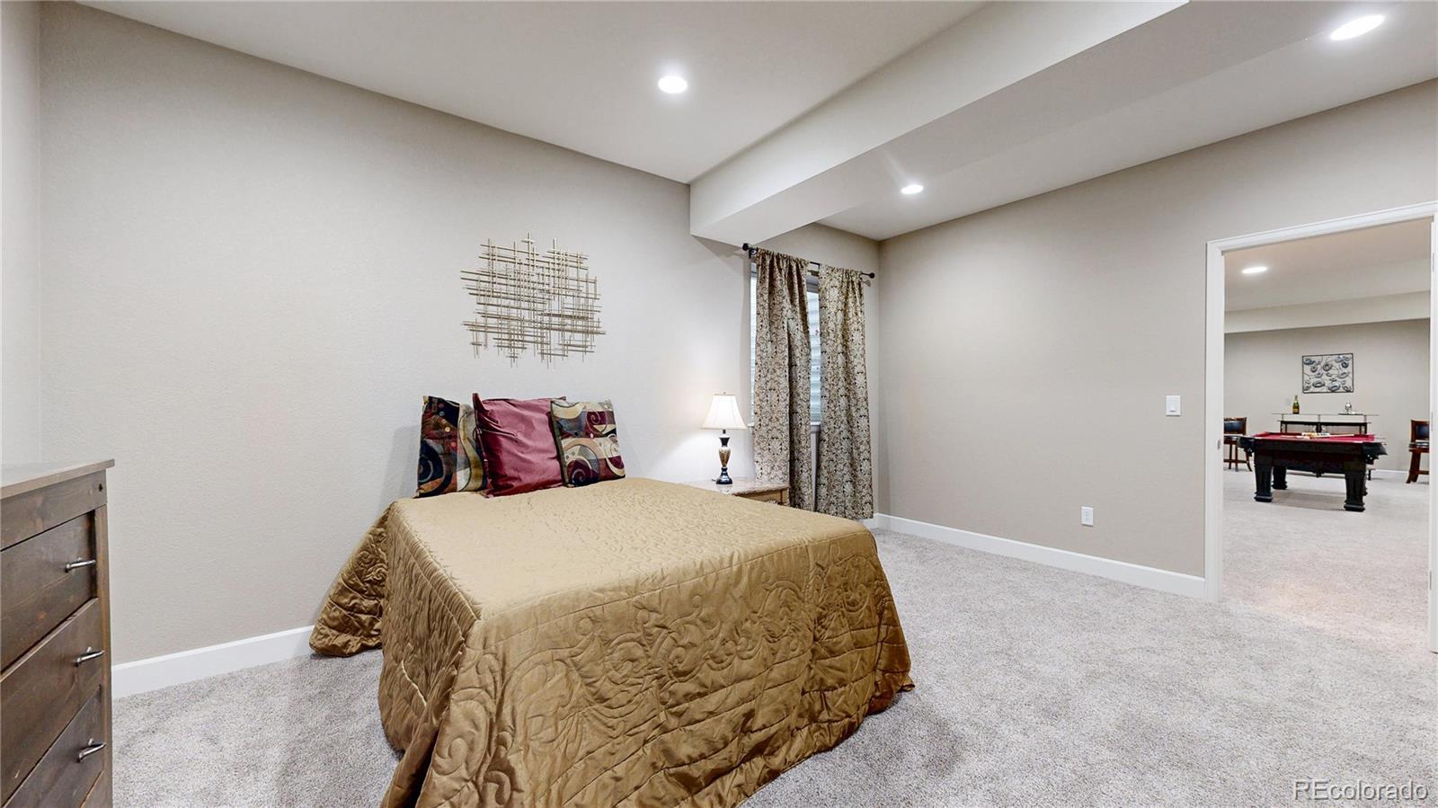 Southshore 4-bedroom, 4-bath Ranch Style home in SE Aurora with a finished basement with an open floor plan and plenty of main-level living space. Highly coveted 3-car oversized finished garages. A few blocks away from the Luxury Southshore clubhouse, pool, trails, and neighborhood parks. The backyard is fenced, professionally landscaped with garden lighting, and an oversized patio. There are neighbors on only two sides, which adds to the sense of space. Inside, the layout feels open and comfortable, with large picture windows that bring in beautiful natural light throughout the day. The main living areas feature hardwood floors, while the bathrooms and laundry room are finished with tile. Bedrooms and the lower level have upgraded carpet. The lighting throughout the home can be adjusted between two tones. The kitchen has granite slab countertops, extra cabinets for storage, and plenty of room to cook and gather. There is a flex space that works well as a home office, reading room, playroom, or whatever fits your lifestyle. The main floor primary bedroom is tucked away for privacy and features a large bay window, a spacious walk-in closet, and separation from the other bedrooms. The floor plan is designed so that guests, family or friends have their own space. There is also a grand entry to the finished basement, which makes the home feel more like a two-story home. Downstairs, the finished basement offers a very large second living area, two additional bedrooms/flex space, a bathroom, and an enormous storage room. Additional features include a three-car garage that is insulated, finished, and has upgraded flooring, an enhanced sprinkler system, exterior lighting, 9 camera security system, and a laundry room with a washer and dryer and plumbing for a future sink. Located in a top-rated school district with convenient access to E470, Denver International Airport, Southlands Mall, dining, and entertainment. Open House Sunday, February 15th 2:00 to 4:00 pm PM.