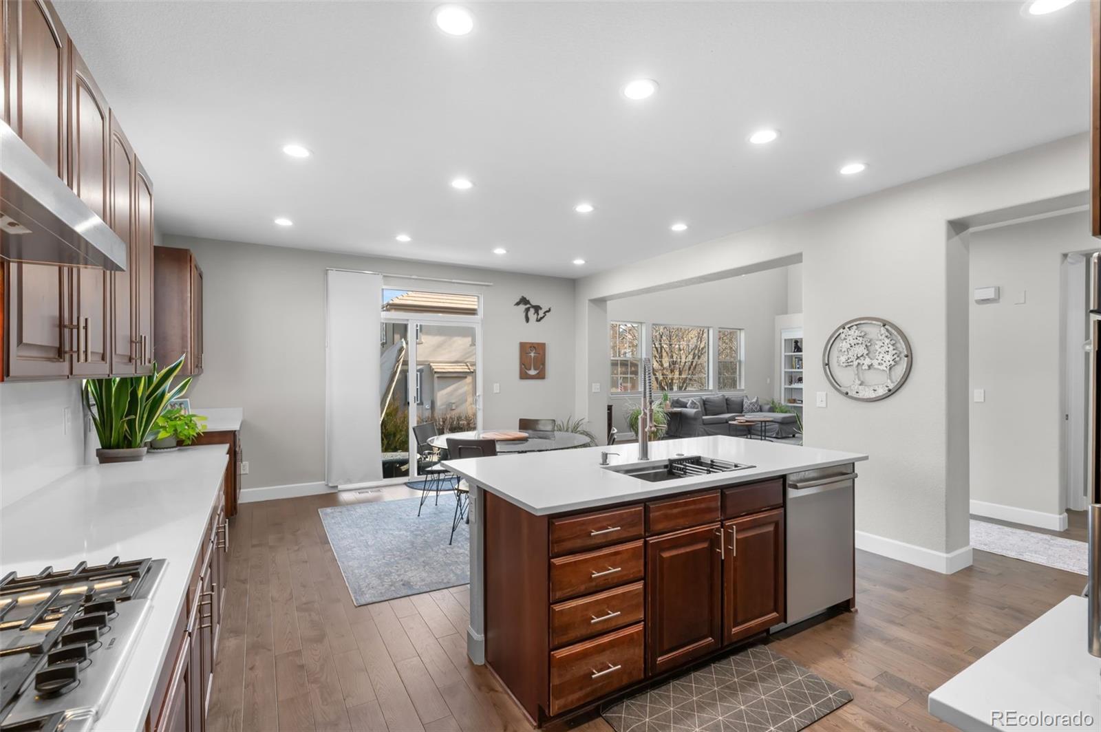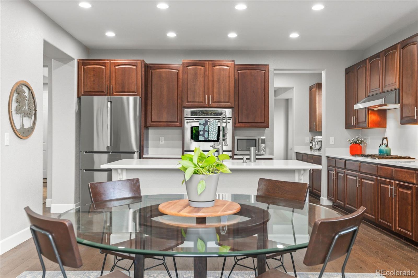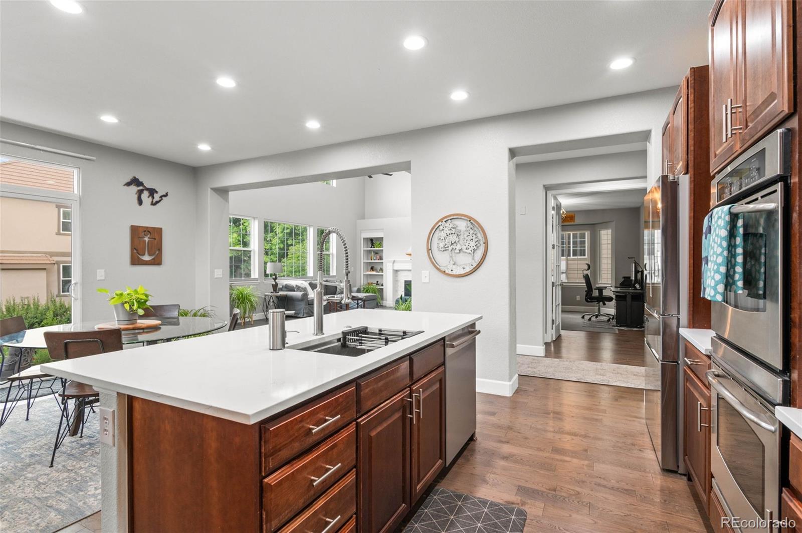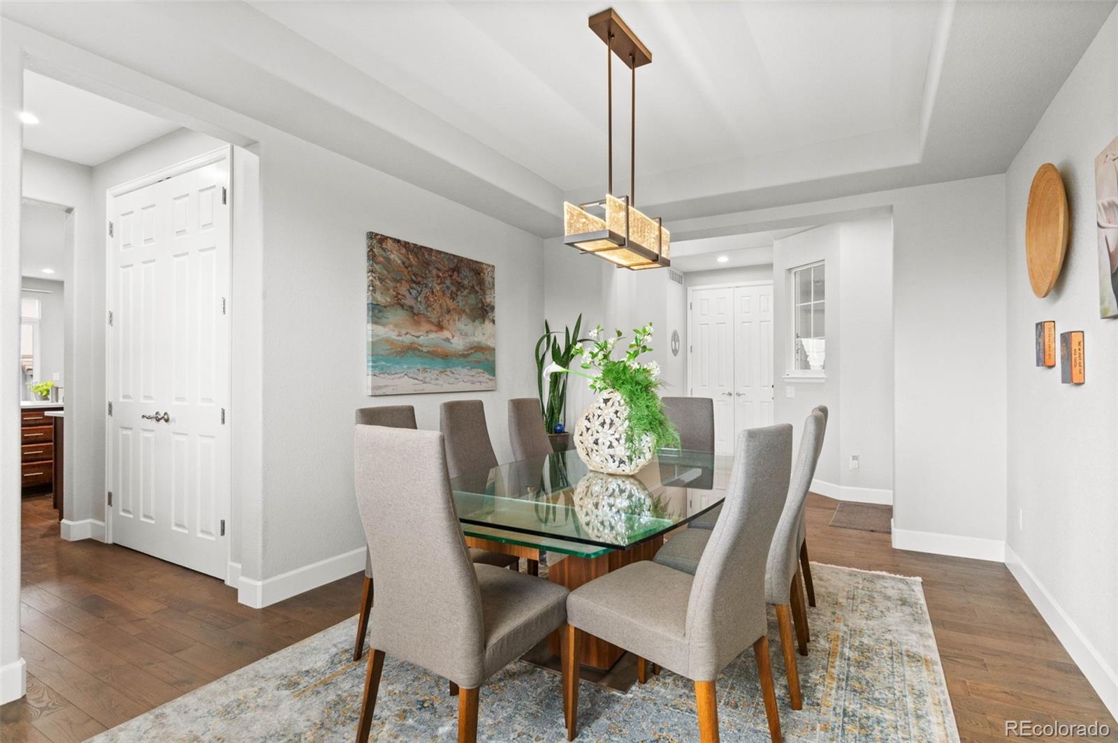 Modern Updated Home Backing to a Greenbelt in The Reserve at Cherry Creek! This desirable Richmond model features gleaming wood floors, floor-to-ceiling windows, fresh paint, modern fixtures, an updated kitchen, and a newly finished basement. The gourmet kitchen boasts new quartz countertops, an expansive center island, stainless steel appliances, a double oven, a gas range, a spacious pantry, and a cozy eating area. Light and bright, it opens to the main floor family room, which features soaring ceilings, a statement fireplace, and charming built-ins—perfect for entertaining! Enjoy formal dinners in the dining room, then extend gatherings to the expansive back patio overlooking a delightful garden and walking path. Upstairs, the primary suite offers a luxurious retreat with a 5-piece bath, including a new vanity, a giant glass-enclosed shower, a modern standalone tub, a private water closet, and a large walk-in closet. The secondary bedrooms are generously sized, with one featuring an en-suite bathroom and the other two sharing an updated full bath. The current owners have converted a bedroom into a true upstairs laundry room, which can easily be converted back if desired. The finished basement boasts a media room with built-in shelving, a second home office, and an expansive guest suite. Newer systems, including the furnace and air conditioning, along with fresh concrete work and landscaping, plus new paint enhances the home's appeal. The three-car garage includes EV charging capabilities and ample space for your vehicles and toys. Located in this coveted gated community, you’ll enjoy access to a clubhouse, pool, and tennis court—like having a private resort nearby. The true hallmark of this fantastic home is its location. Conveniently located in a tranquil part of Greenwood Village, you have easy access to Cherry Creek State Park, award-winning Cherry Creek schools, Lakeview Park, Cottonwood Trail, Valley Country Club, and all the amenities of the DTC.