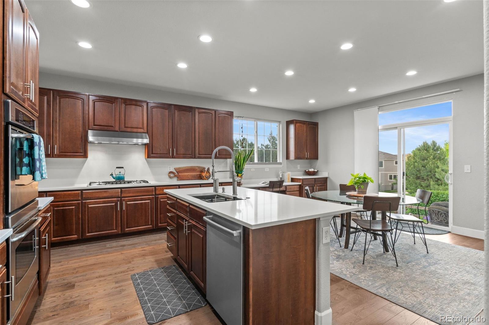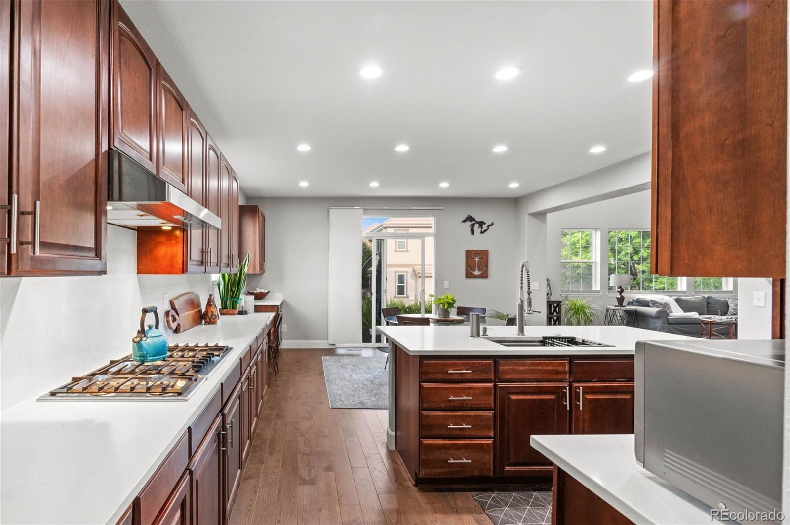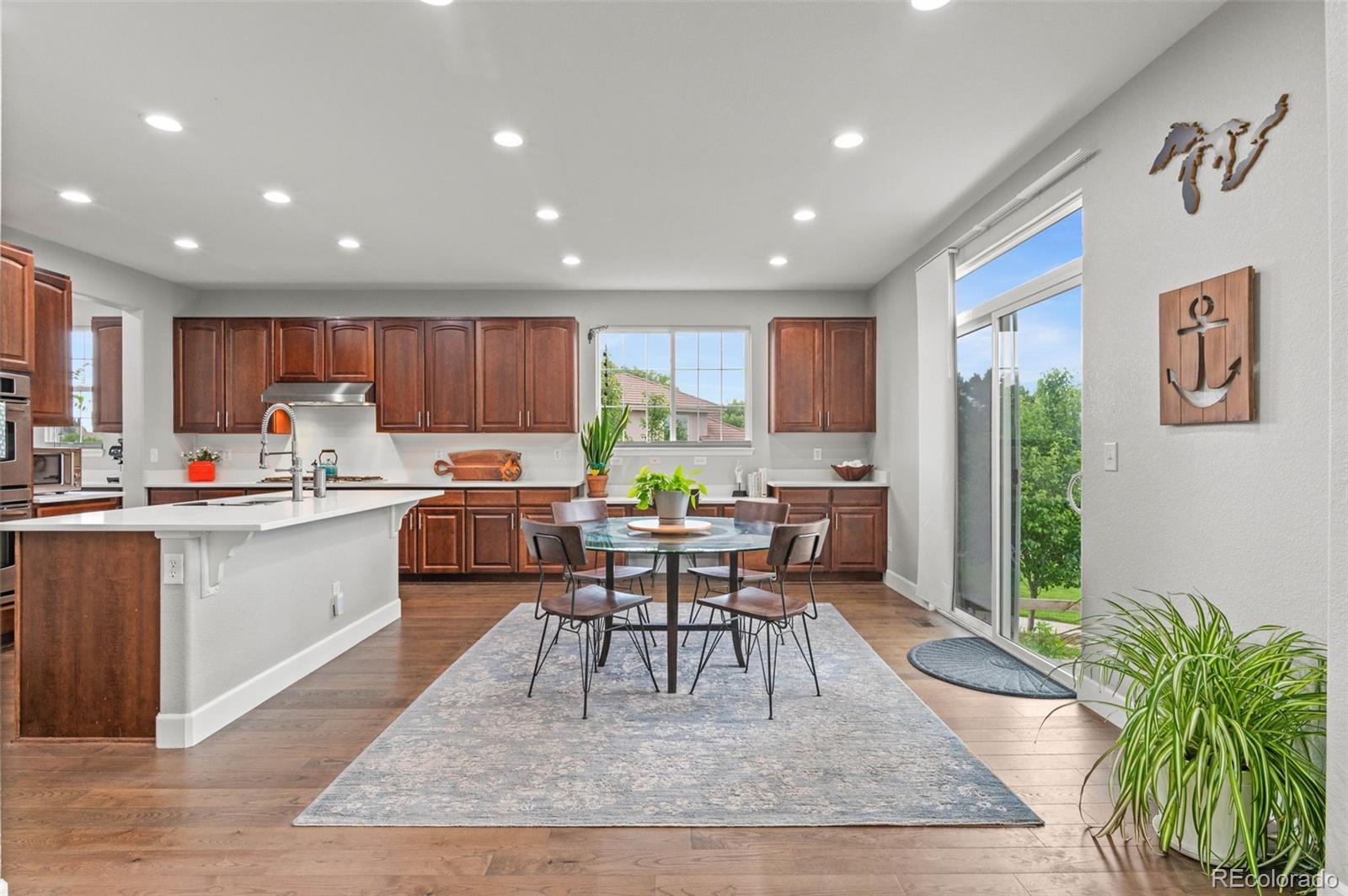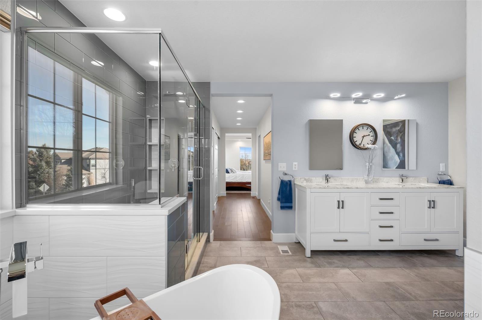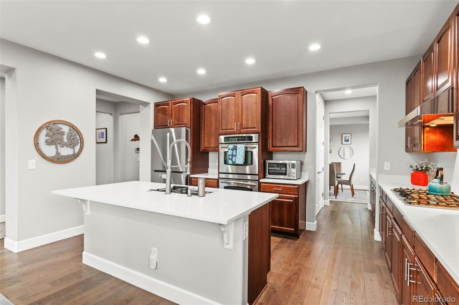 Modern Updated Home Backing to a Greenbelt in The Reserve at Cherry Creek! This desirable Richmond model features gleaming wood floors, floor-to-ceiling windows, fresh paint, modern fixtures, an updated kitchen, and a newly finished basement. The gourmet kitchen boasts new quartz countertops, an expansive center island, stainless steel appliances, a double oven, a gas range, a spacious pantry, and a cozy eating area. Light and bright, it opens to the main floor family room, which features soaring ceilings, a statement fireplace, and charming built-ins—perfect for entertaining! Enjoy formal dinners in the dining room, then extend gatherings to the expansive back patio overlooking a delightful garden and walking path. Upstairs, the primary suite offers a luxurious retreat with a 5-piece bath, including a new vanity, a giant glass-enclosed shower, a modern standalone tub, a private water closet, and a large walk-in closet. The secondary bedrooms are generously sized, with one featuring an en-suite bathroom and the other two sharing an updated full bath. The current owners have converted a bedroom into a true upstairs laundry room, which can easily be converted back if desired. The finished basement boasts a media room with built-in shelving, a second home office, and an expansive guest suite. Newer systems, including the furnace and air conditioning, along with fresh concrete work and landscaping, plus new paint enhances the home's appeal. The three-car garage includes EV charging capabilities and ample space for your vehicles and toys. Located in this coveted gated community, you’ll enjoy access to a clubhouse, pool, and tennis court—like having a private resort nearby. The true hallmark of this fantastic home is its location. Conveniently located in a tranquil part of Greenwood Village, you have easy access to Cherry Creek State Park, award-winning Cherry Creek schools, Lakeview Park, Cottonwood Trail, Valley Country Club, and all the amenities of the DTC.
