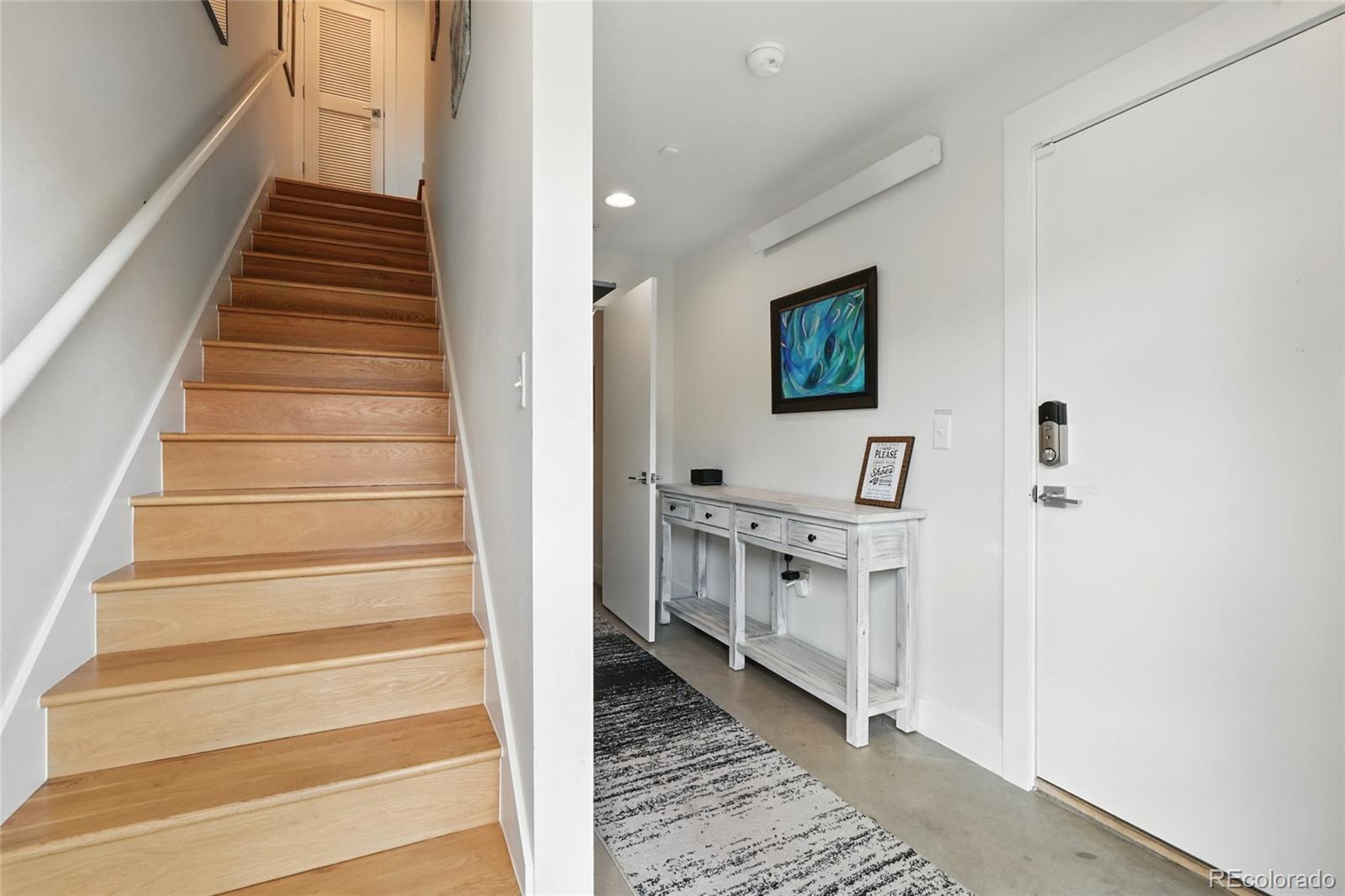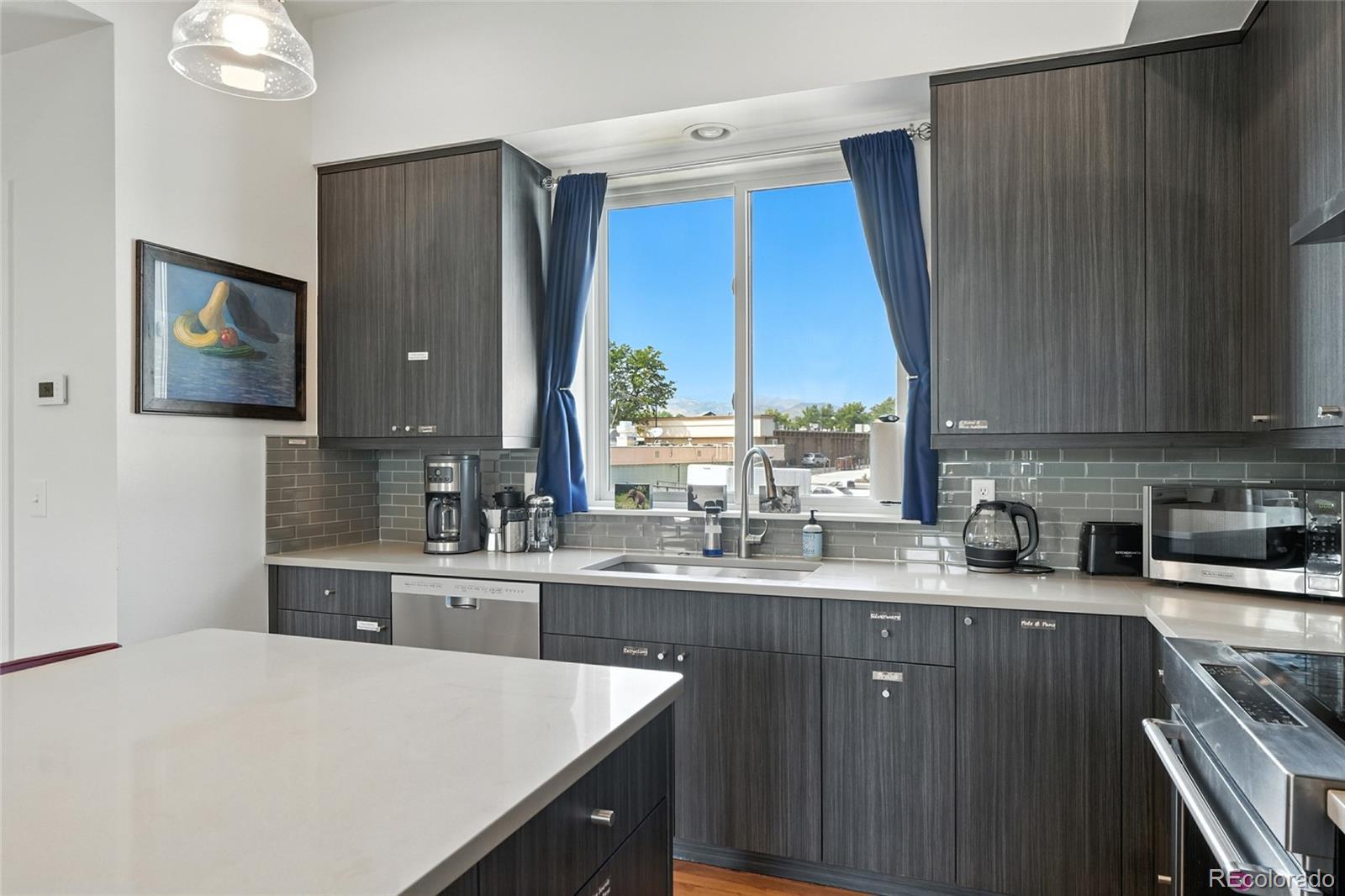 A centrally located, self-powered, ultra modern masterpiece awaits in this sleek and stylish Boulder townhome that brings virtually no maintenance needs. Thirteen cutting-edge solar panels (and 13 independent micro-inverters!) supply all your energy needs and make you money for most of the year in this tightly-built, all-electric energy efficient home. Owners and renters alike love the location above all, where walking for a minute or two on the Goose Creek Greenway takes you to Whole Foods, two climbing gyms, restaurants, tech offices and so much more, and yet it feels totally secluded – while staying in the home is whisper quiet (with some of the highest R-value insulation you can get). In the winter, the hassle-free whole-home humidifier brings health and well-being to any resident or guest, especially when coupled with an air exchange unit and a powerful whole-home water filter (and double filtration from the fridge). || As you enter, eyes are drawn up to lofty vaulted ceilings, and down to hand-crafted flooring, all flowing together in an open and airy floor plan. Enjoy cooking on the high-end induction stove (making for seamless cleanups!), in a stunning kitchen that will impress anyone with its modern finishes, including a glass-tiled backsplash, quartz countertops and stainless-steel KitchenAid appliances. The kitchen seamlessly connects with a spacious living room, illuminated with an abundance of natural light. French doors lead to an outdoor South-facing balcony where you can enjoy sipping morning coffee while admiring the Flatirons, or even build little gardens in, as plants grow abundantly there. Two spacious bedrooms are complemented by two updated bathrooms, including a conveniently-situated washer and dryer set. An attached garage with bike storage offers even more shelves, racks, and plenty of space for keeping essentials. A commercial restaurant sink allows you to easily wash pets, shoes or dirty gear after your typical Colorado outdoor adventure.