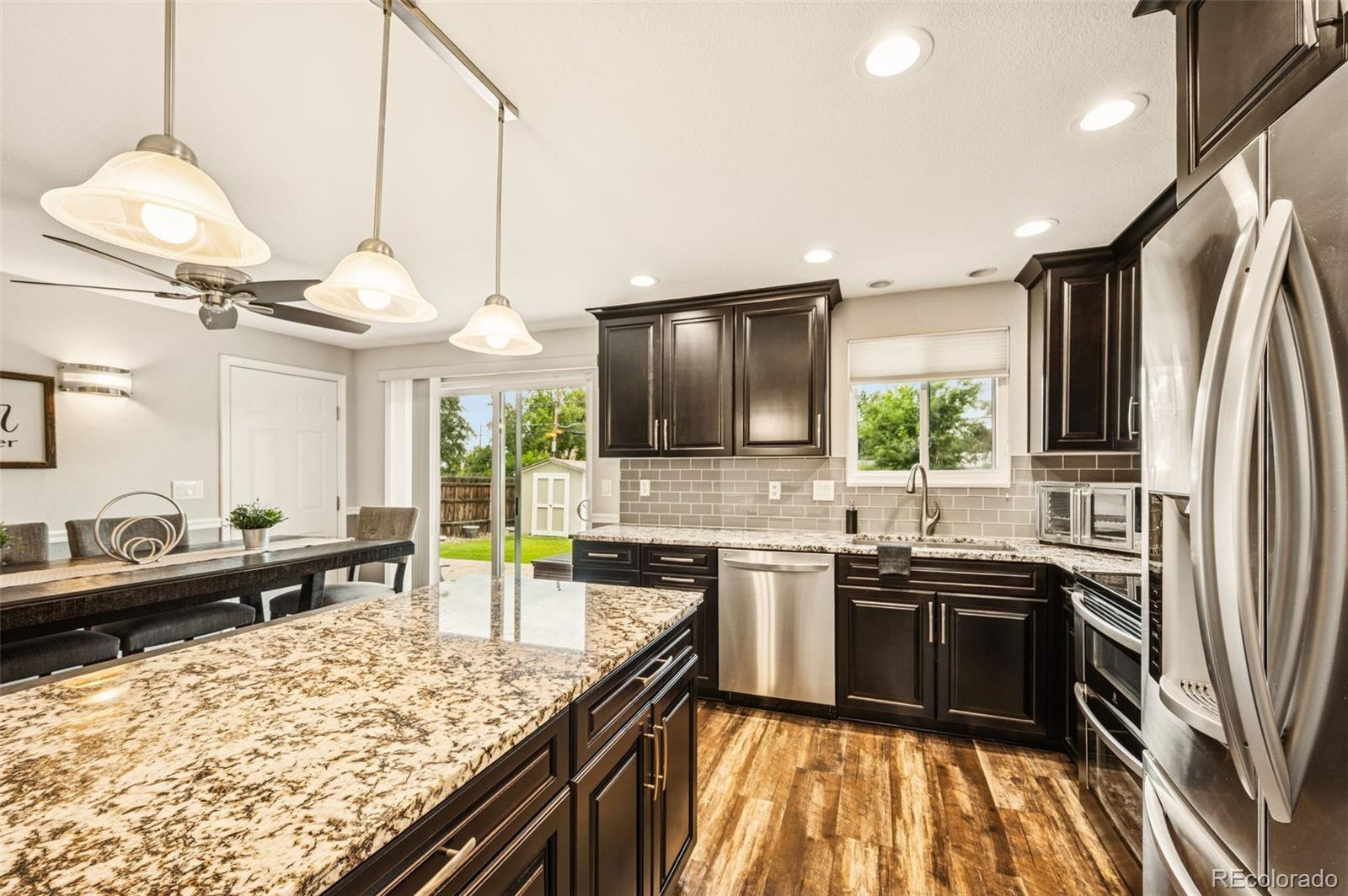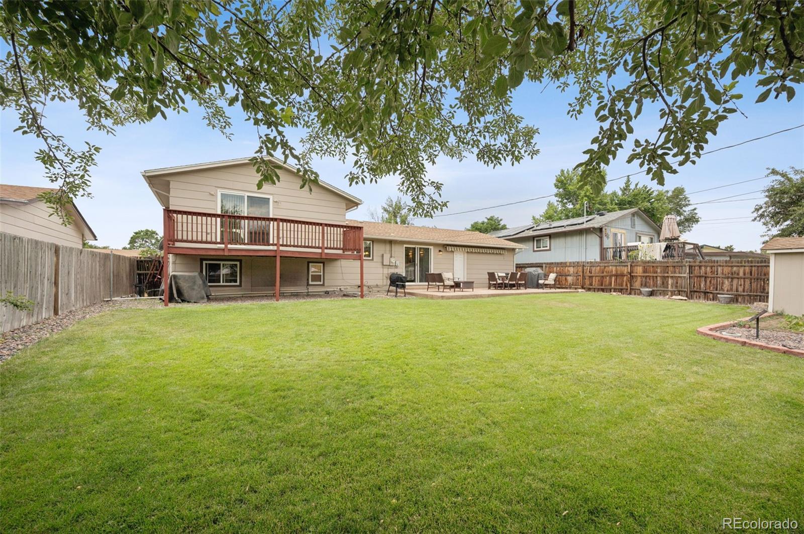 Welcome to this beautiful home in the desirable Lakeview Estates neighborhood! This gem perfectly blends modern touches with classic comfort. Step into the inviting living room that flows effortlessly into the dining room. The dining room connects to the kitchen, making this space the true heart of the home. The open kitchen features beautiful granite countertops, stylish cabinetry, all stainless-steel appliances, and abundant natural light from the glass door leading to the backyard. Upstairs, you’ll find a bright and spacious primary bedroom designed to be a true retreat. This relaxing space offers plenty of natural light, ample room to fit your needs, and convenient access to a beautifully designed full bath. The primary bathroom features dual vanities, generous cabinet space for organization, and a clean, modern design that makes getting ready each day a pleasure. A spacious secondary bedroom completes the upper level. The lower level boasts a cozy family room with a fireplace as its centerpiece. A third bedroom has convenient access to a ¾ bathroom, providing flexibility for everyday living or visiting guests. The finished basement adds even more functional space, including a versatile recreation room with recessed lighting, a utility/laundry room, and a fourth non-conforming bedroom—perfect for a private home office, gym, or hobby space. Step outside to the expansive backyard, where you’ll find endless possibilities for outdoor enjoyment. This large, open space features a designated fire pit area, garden space, and a convenient shed for additional storage. Relax on the patio and enjoy the Colorado sunsets—perfect for outdoor dining or entertaining. Don’t miss this move-in-ready home that truly has it all—comfort, style, and space inside and out!