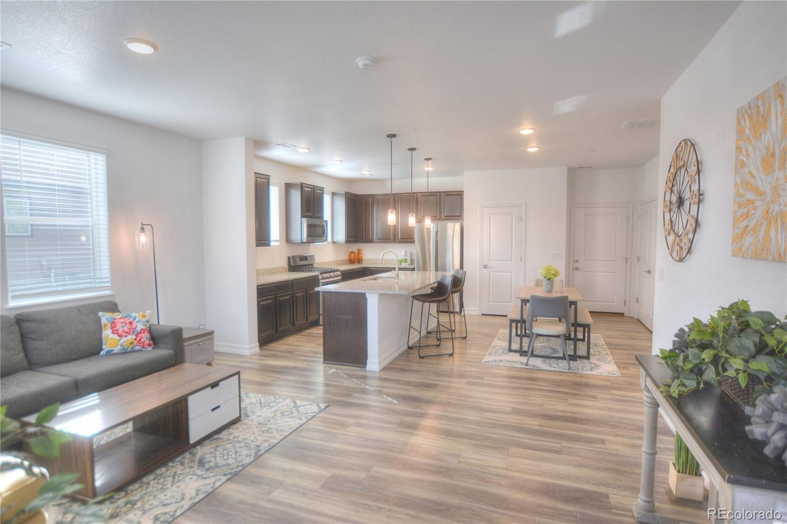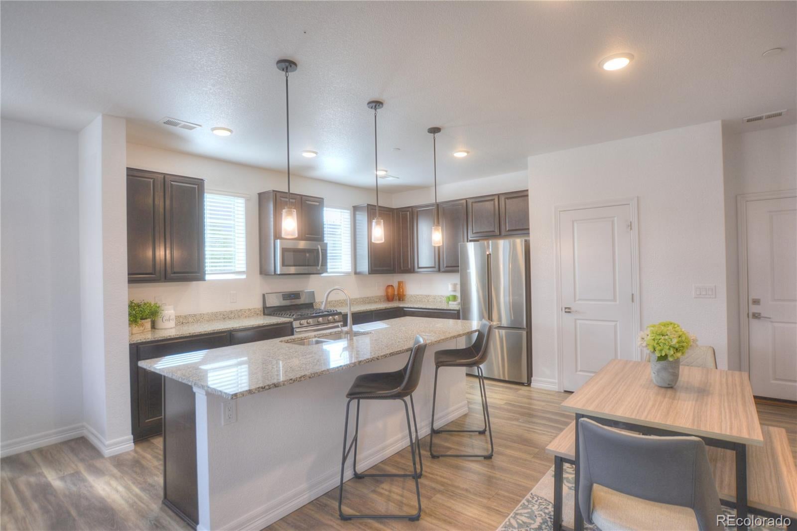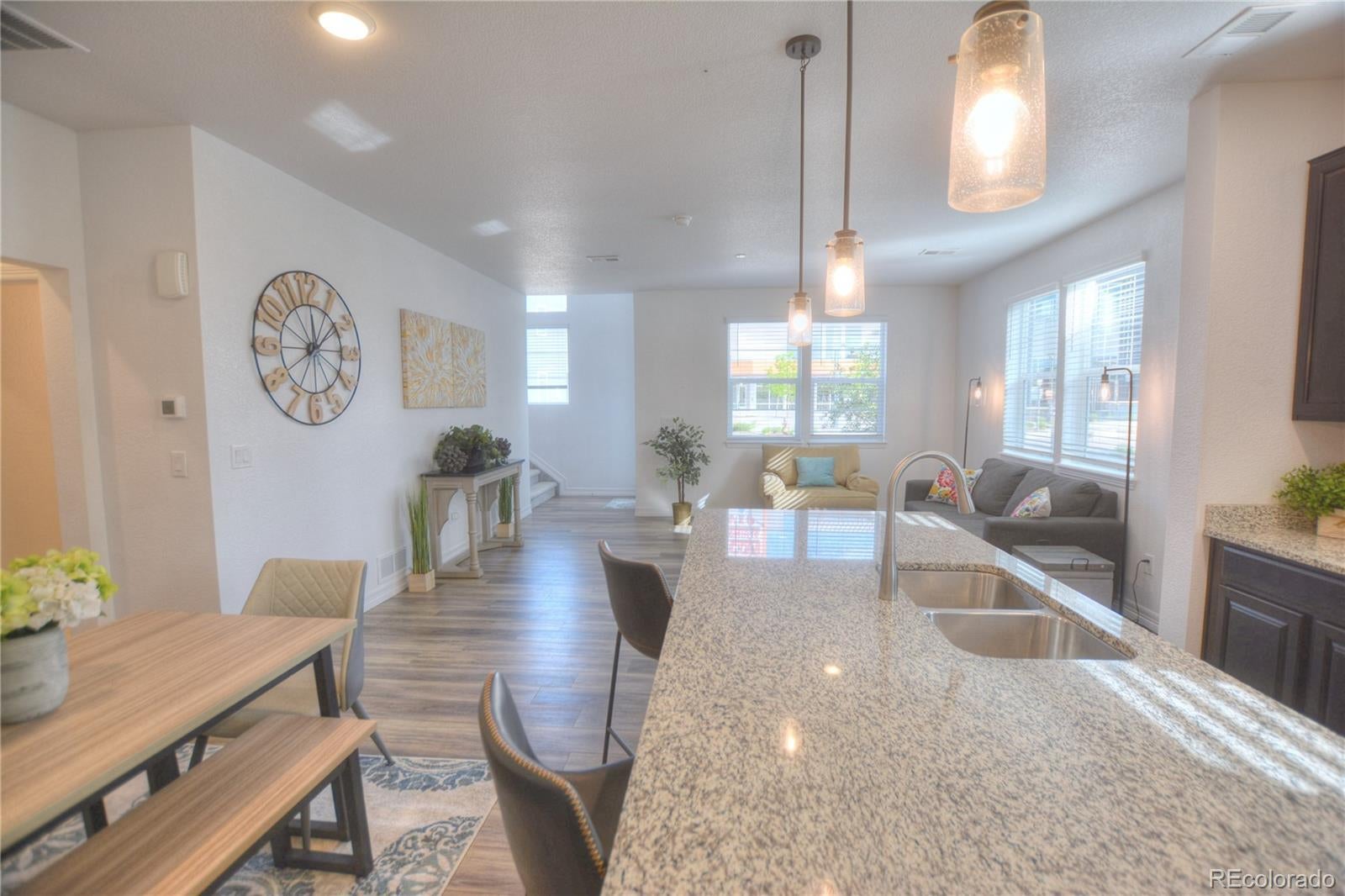 Welcome to your dream home in the heart of Victory Ridge, this very bright, end-unit townhome in Colorado Springs offers great location and modern amenities. When you walk in you're greeted by vaulting entry foyer, LVP flooring and a beautiful open concept Great room with bright, upgraded kitchen with stainless steel appliances including 5 burner gas range, granite countertops, and a large island perfect for entertaining. Head up stairs and you'll pass by the open loft area, with built in desk for a flex home office, the primary suite with an ensuite bathroom with dual sinks, walkin shower, and a generous walk-in closet. Two additional bedrooms share a full bathroom with dual sinks, also find the full size laundry room so laundry days are a breeze! A few more property highlights include a large 2 car extra wide garage, tankless hot water, AC, skybell doorbell, security system, smart thermostat, and lots of storage throughout the home. Step outside onto the fenced patio, offering the perfect spot to unwind and enjoy the fresh air. Got dogs? No problem! Take a few steps out the front door and there is plenty of community green space that is maintained by the HOA, No mower or yard tools needed. Location is great, you're right by Icon Cinema, within walking distance to some of the newest dining in Colorado Springs!! Additionally, being only minutes away from the prestigious US Air Force Academy, this community offers the perfect blend of convenience and serenity. With easy access to I-25 and Powers Blvd.
